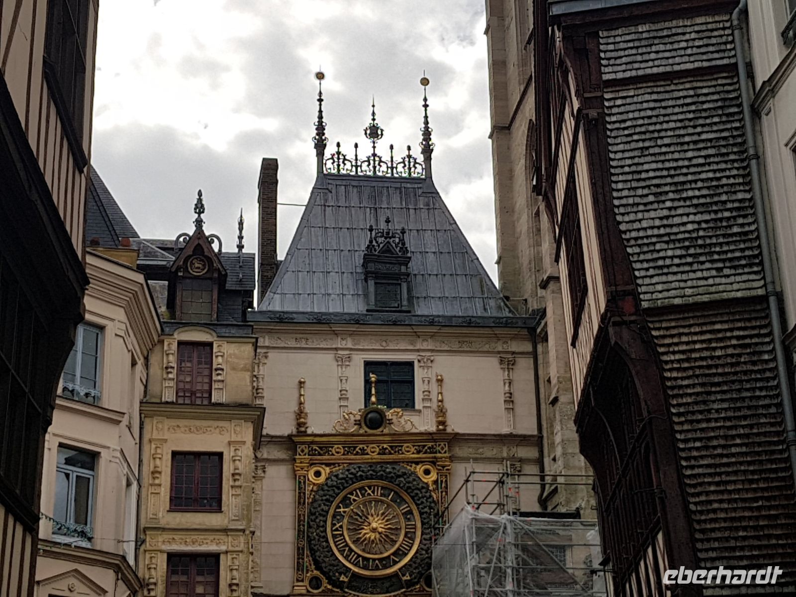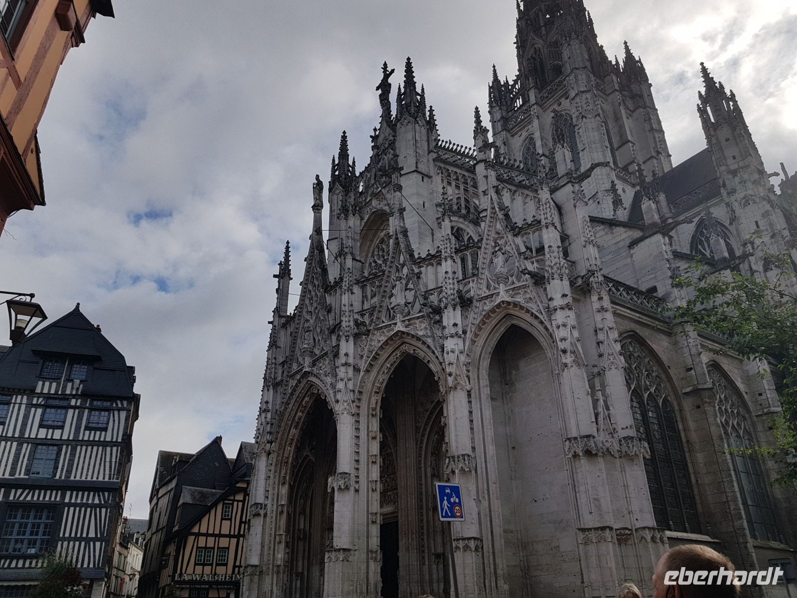 Am Morgen luden wir wieder unsere Koffer in den Bus und stiegen gespannt auf neue Entdeckungen in der Normandie ein. Unser erstes Ziel war die Altstadt von Rouen, die wir im Rahmen einer Stadtführung kennenlernen sollten. Unsere Stadtführerin, die uns überraschender Weise schon an der Ausstiegshaltestelle erwartete, führte uns zur spätgotischen Kirche St. Maclou, zur beeindruckenden Kathedrale, zum reich verzierten Justizpalast, zum berühmten Uhrenturm sowie zum alten Markt. Dort erinnern ein 20 m hohes Kreuz und eine moderne Kirche an Jeanne d'Arc, die „Jungfrau von Orleans“, die hier am 30. Mai 1431 auf dem Scheiterhaufen den grausamen Feuertod erleiden musste. Dann hatten wir noch etwas Freizeit, um uns in der Markthalle umzusehen oder noch einen Kaffee zu trinken, bevor wir uns trafen, um wieder zum Bus zu gehen. Jetzt ging es direkt an die Normannische Küste zu den Kreideklippen von Étretat.
