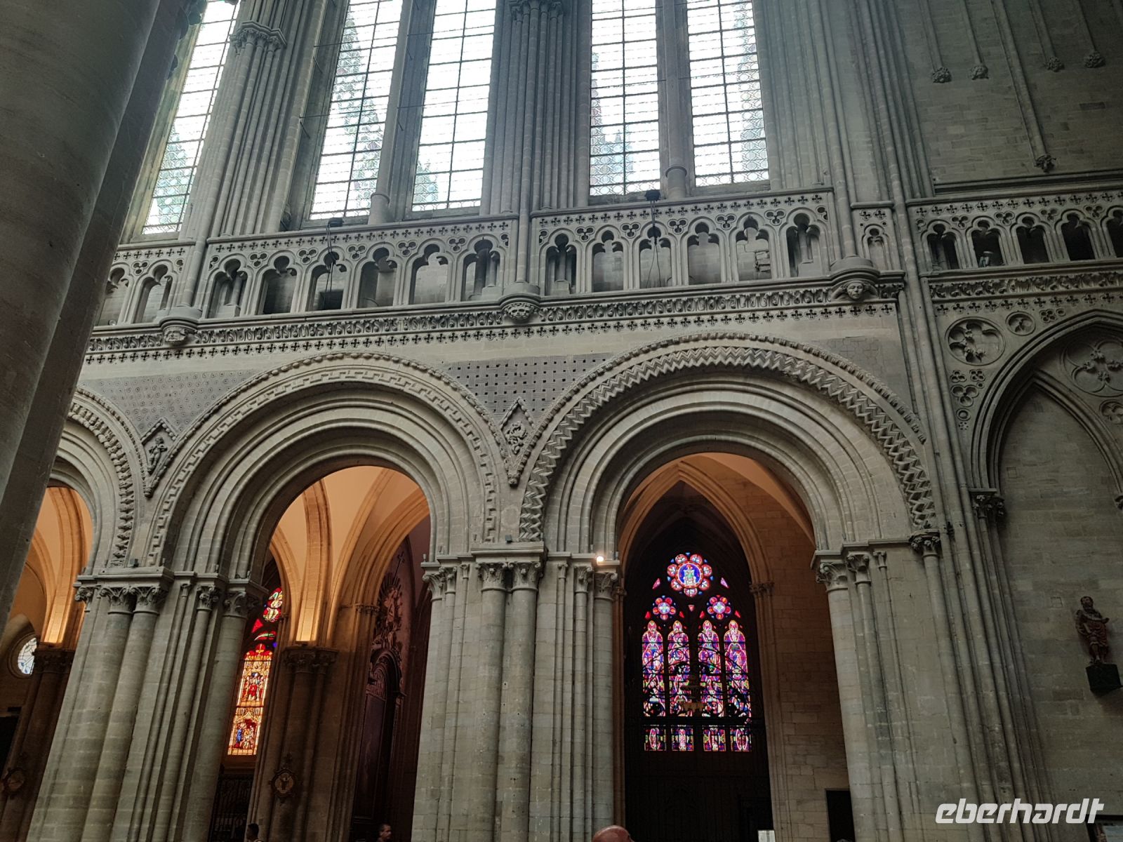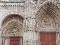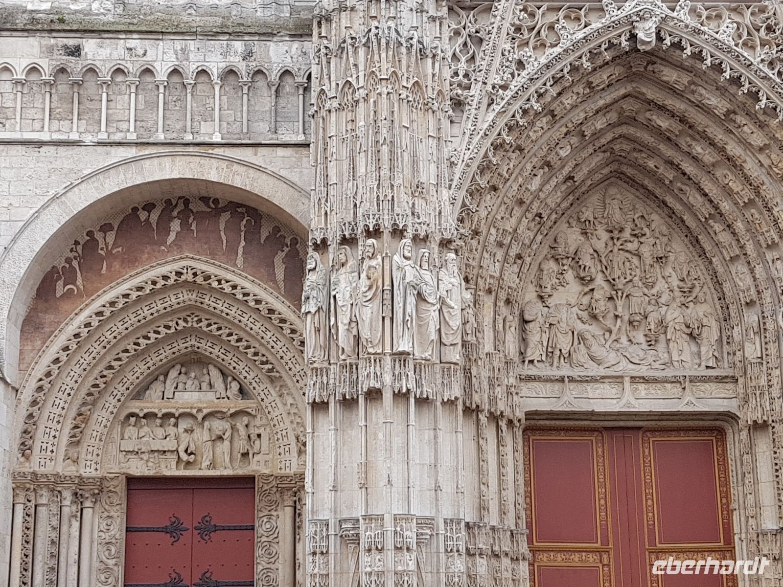 Anschließend stiegen wir wieder in unseren Reisebus und fuhren nach Norden. Hier erwartete uns noch ein überragende Sehenswürdigkeit. So bogen wir südlich von Paris von der Autobahn ab und erreichten am Nachmittag Chartres. Unsere Reiseleiterin führte uns zur Kathedrale und lenkte unseren Blick auf die Besonderheiten dieses seit 1979 auf der UNESCO-Liste stehenden weltberühmten Bauwerks. Seit ihrer Errichtung ist die Kathedrale, abgesehen von ihrem Nordturm, vollständig erhalten geblieben. Ihre vom Vorgängerbau erhaltene Fassade zeigt die erste Königsgalerie und die ersten Skulpturen in der Geschichte der Kathedralplastik. In der Westfassade befinden sich auch die ältesten Glasfenster der Kathedrale, die zugleich den größten und ältesten Bestand an mittelalterlichen Glasfenstern in Frankreich besitzt. Unter den Kathedralen Frankreichs nimmt sie eine Schlüsselstellung ein und war Vorbild für viele später in Deutschland errichtete Kathedralen. Gemeinsam besichtigten wir die Kathedrale und waren beeindruckt von dem Reichtum ihrer Ausstattung.