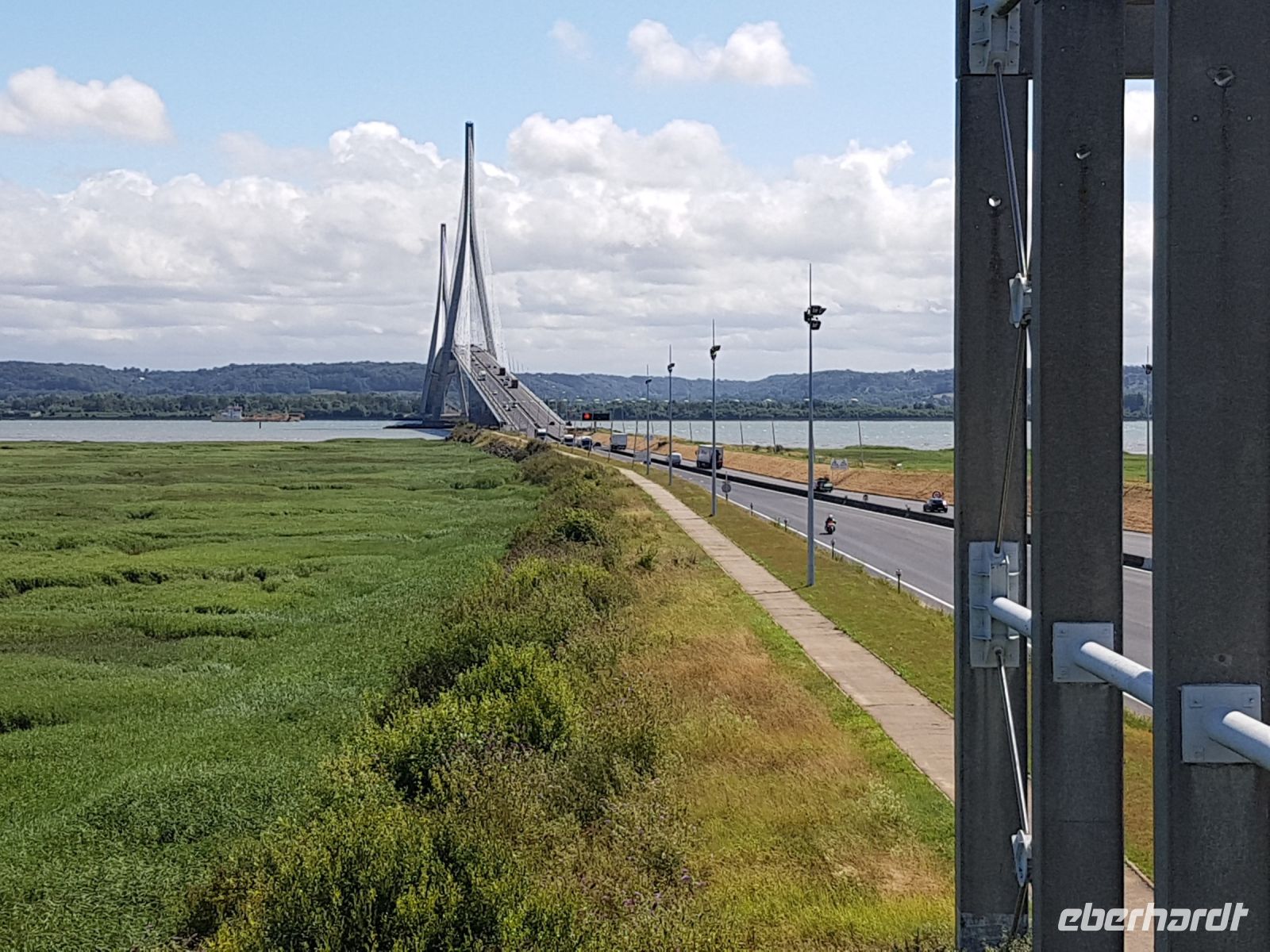 Später setzten wir unsere Reise fort und kamen am Nachmittag zu der berühmten 1994 eingeweihten „Pont de Normandie“. Diese nach Plänen von Michel Virlogeux erbaute Brücke ist nach den Brücken von Brotonne und von Tankarville die letzte Brücke vor der Mündung der Seine in den Ärmelkanal. Wir hielten an einem Parkplatz und besichtigten die Anlage von der Besucherbrücke aus, die über der Mautstelle errichtet worden war. Von hier aus konnte man nicht nur die gesamte ca. 10 km lange Mündung der Seine überblicken sondern auch das Brückenbauwerk aus verschiedenen Perspektiven betrachten. Die „Pont de Normandie“ ist 2,241 km lang und war bei ihrer Fertigstellung mit einer Hauptspannweite von 854 m die größte Schrägseilbrücke der Welt. Die beiden Pylone der Brücke sind 203 m hoch und tragen jeweils 23 Kabel. Die Durchfahrtshöhe für die Schiffe beträgt 52 m.