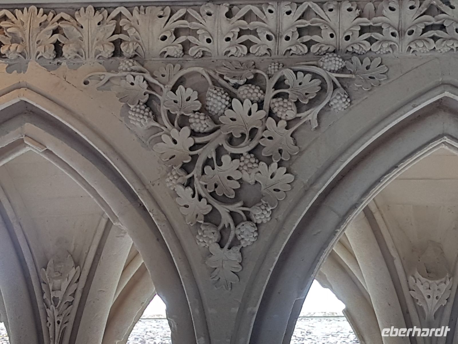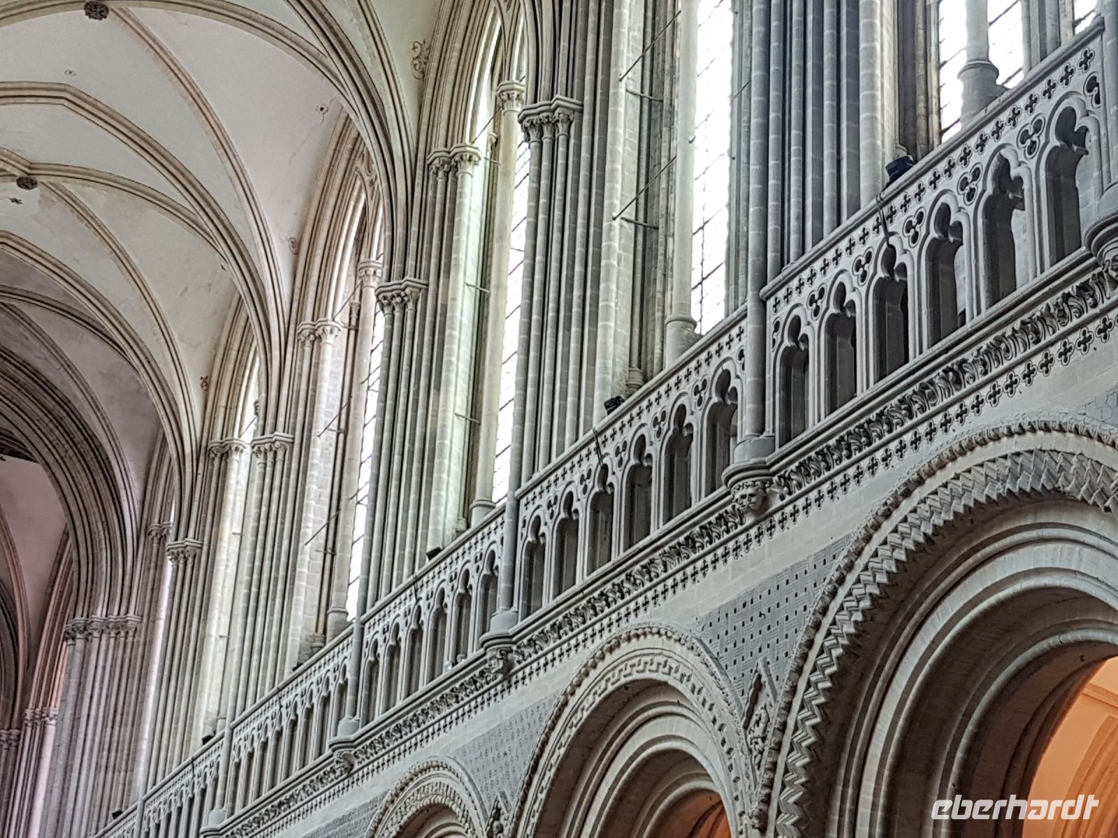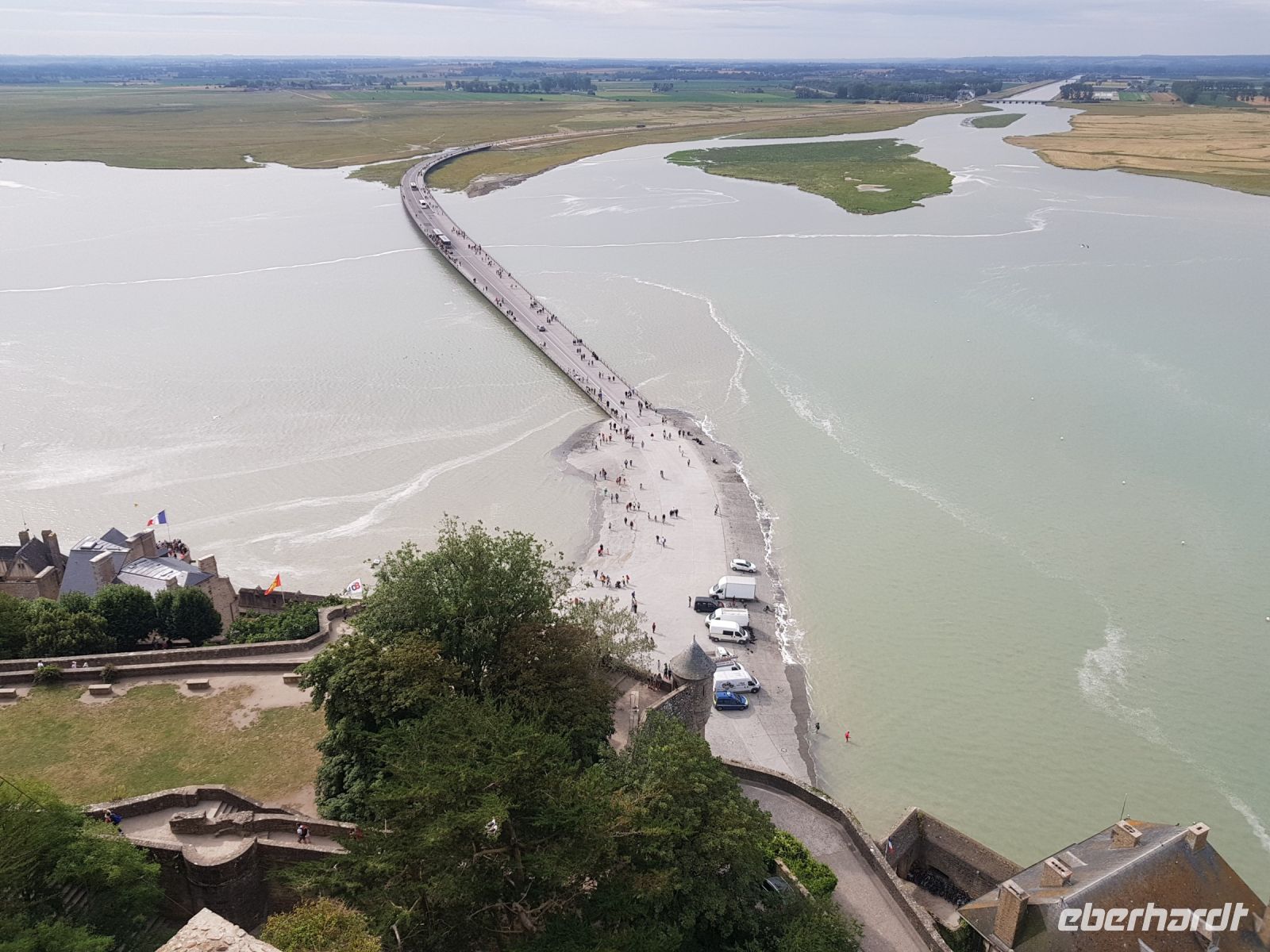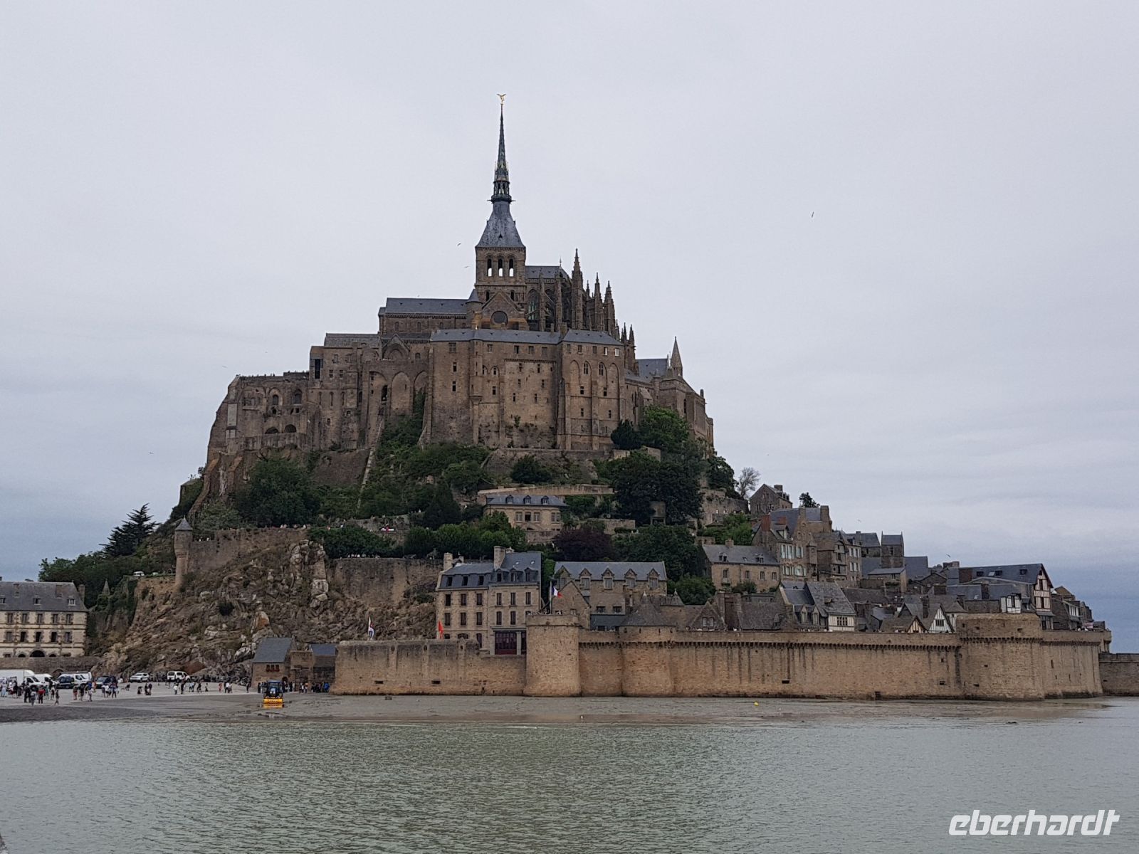 Wir fuhren mit einem Shuttlebus zum Inselberg über dem sich imposant die Abtei erhebt. Vom Fuß dieses Berges bis zur Abtei gingen wir langsame hinauf und bekamen nach einem längeren Prozedere jeder ein Tablet, das uns durch die Abtei führen sollte. So staunten wir über den raffiniert gestalteten Kreuzgang, genossen die Proportionen des Kapitelsaals und erschlossen uns Raum für Raum das legendäre Kloster. Hier hatte der Normannenherzog Richard II. die bretonische Prinzessin Judith geheiratet. Hier gingen Pilger aus ganz Europa Jahrhunderte lang ein und aus. Den Engländern jedoch gelang es nicht, diesen imposanten Inselberg im 100jährigen Krieg zu erobern, was später für Frankreich von hoher Bedeutung sein sollte. Seit dem Jahr 2006 verwandelt man den Mont-Saint-Michel wieder in eine Insel indem man den bisherigen Damm abgetragen und dafür eine Stelzenbrücke erbaut hat. Jahr für Jahr kann man seit dem beobachten, wie sich der um den Berg kreisende Küstenstrom allmählich wieder herstellt.