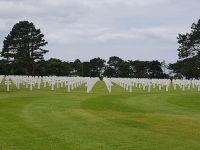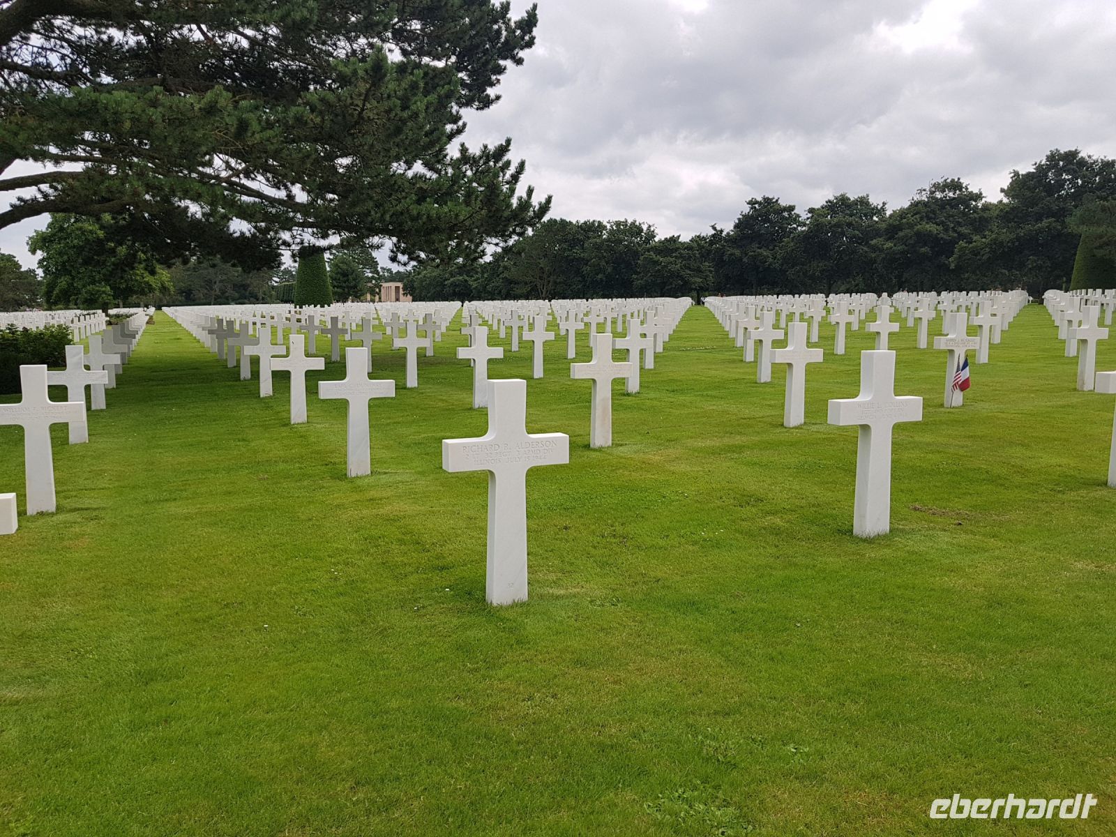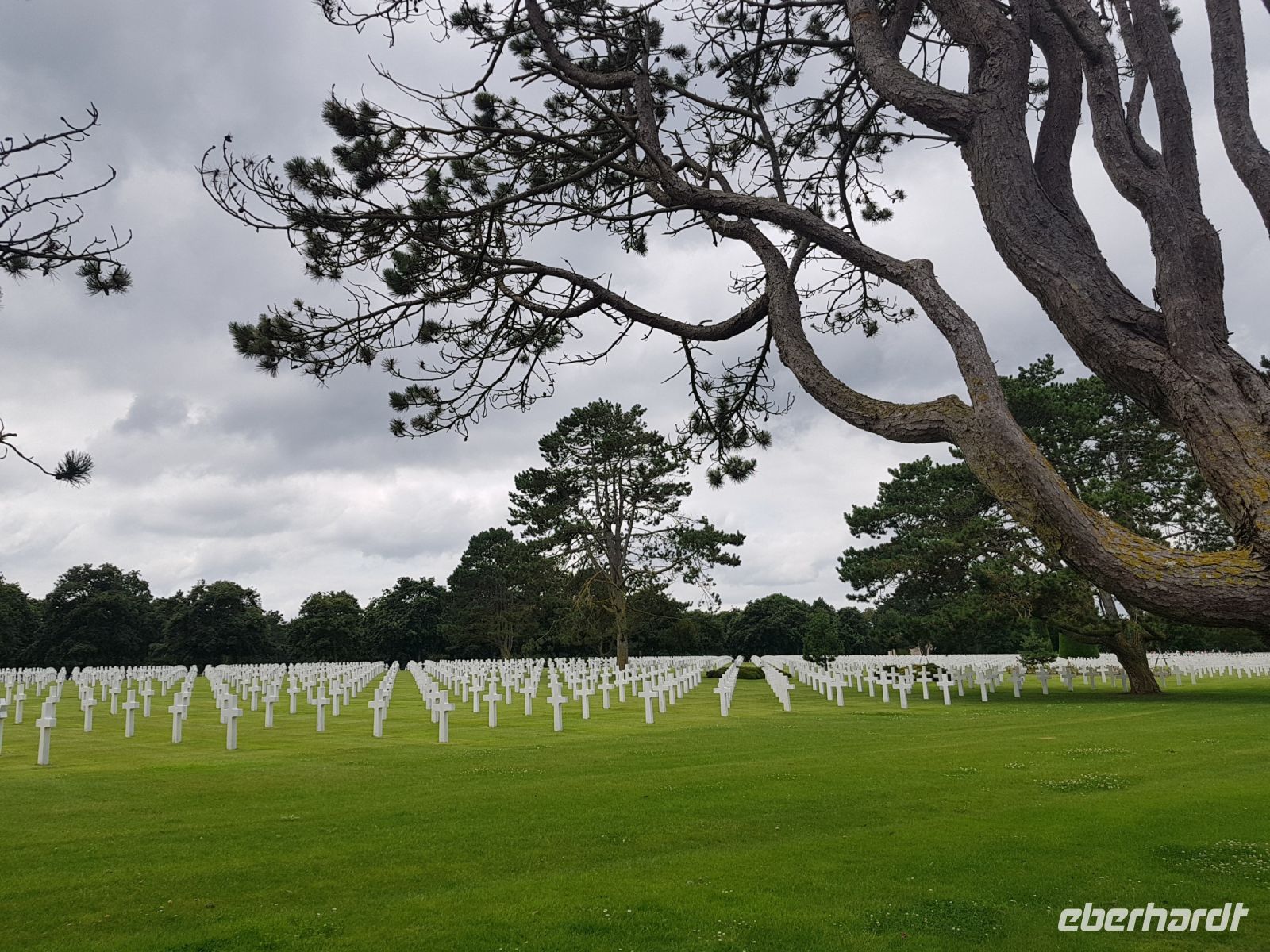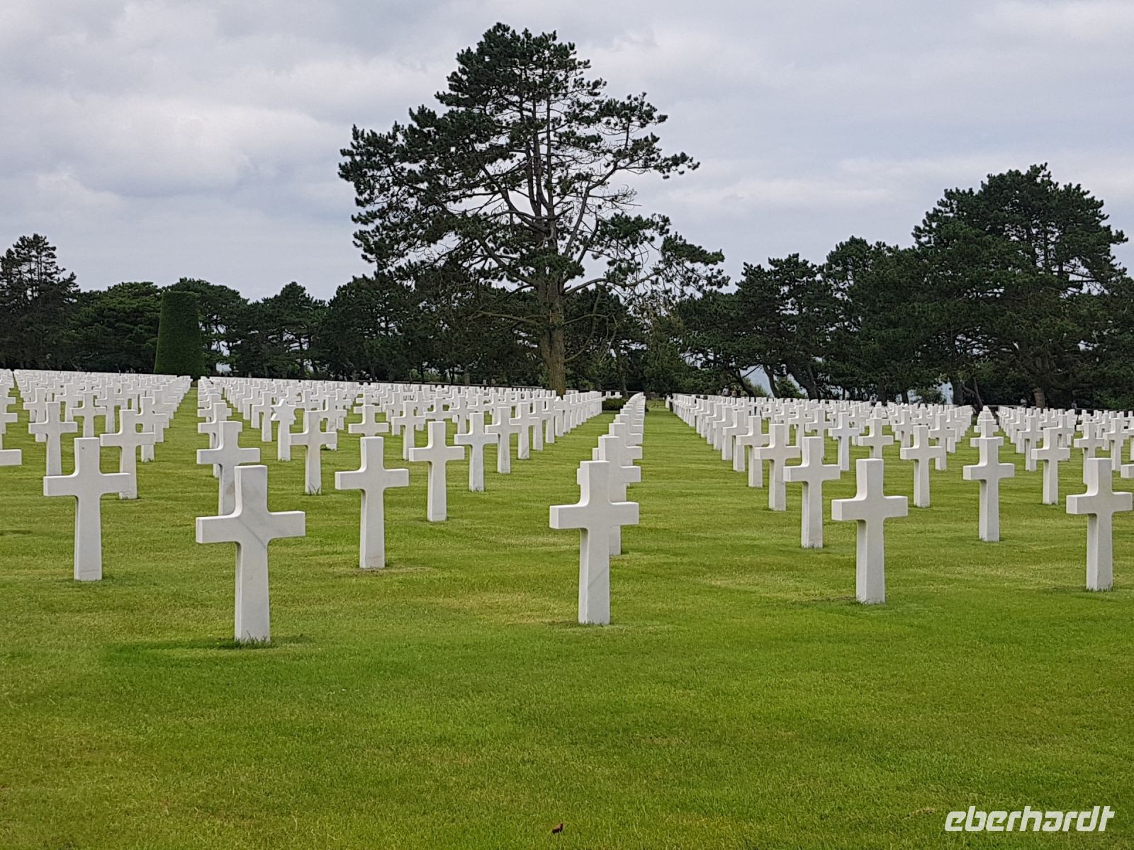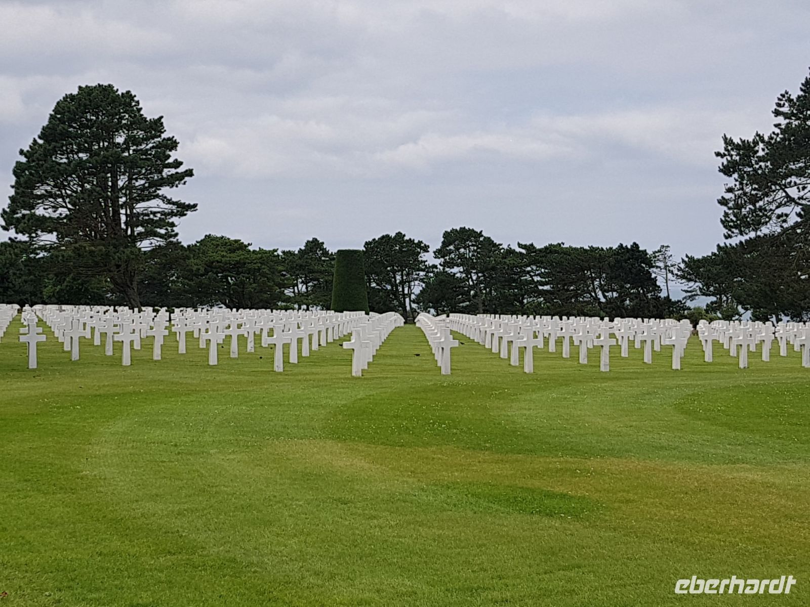 Dann fuhren wir weiter nach Colleville sur Mer an der OMAHA BEACH, wo wir den Cimetiere Americain, den größten Friedhof der amerikanischen Gefallenen besuchten. Dieser Friedhof umfasst die Gräber von 9387 Gefallenen und erinnert mit einem Denkmal an 1557 vermisste Amerikaner. Die Anlage dieses großen Friedhofs wird von der American Battle Monuments Commission unterhalten und wirkt sehr schön, großzügig und hervorragend gepflegt. Von einem am Gräberfeld entlang führenden Weg kann man Küstenlinie entlang sehen, an der sich die Kampfhandlungen am D-Day abgespielt haben.
