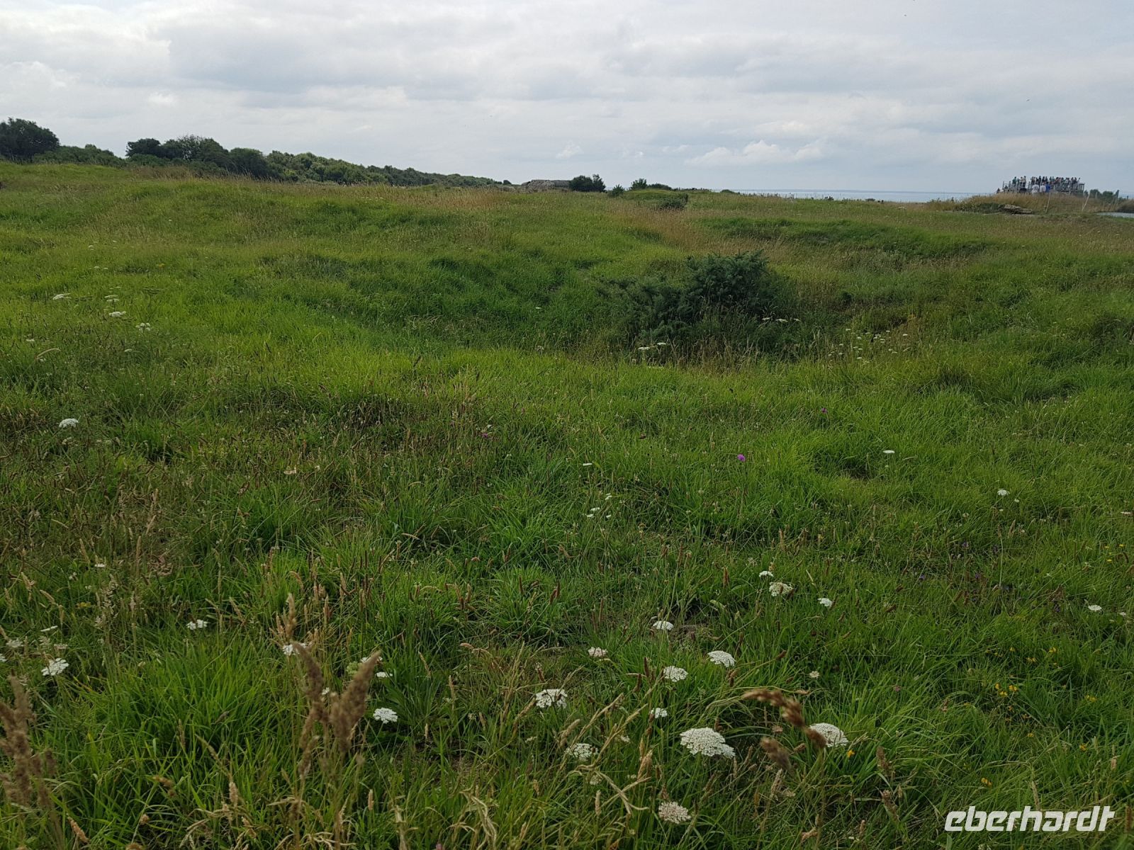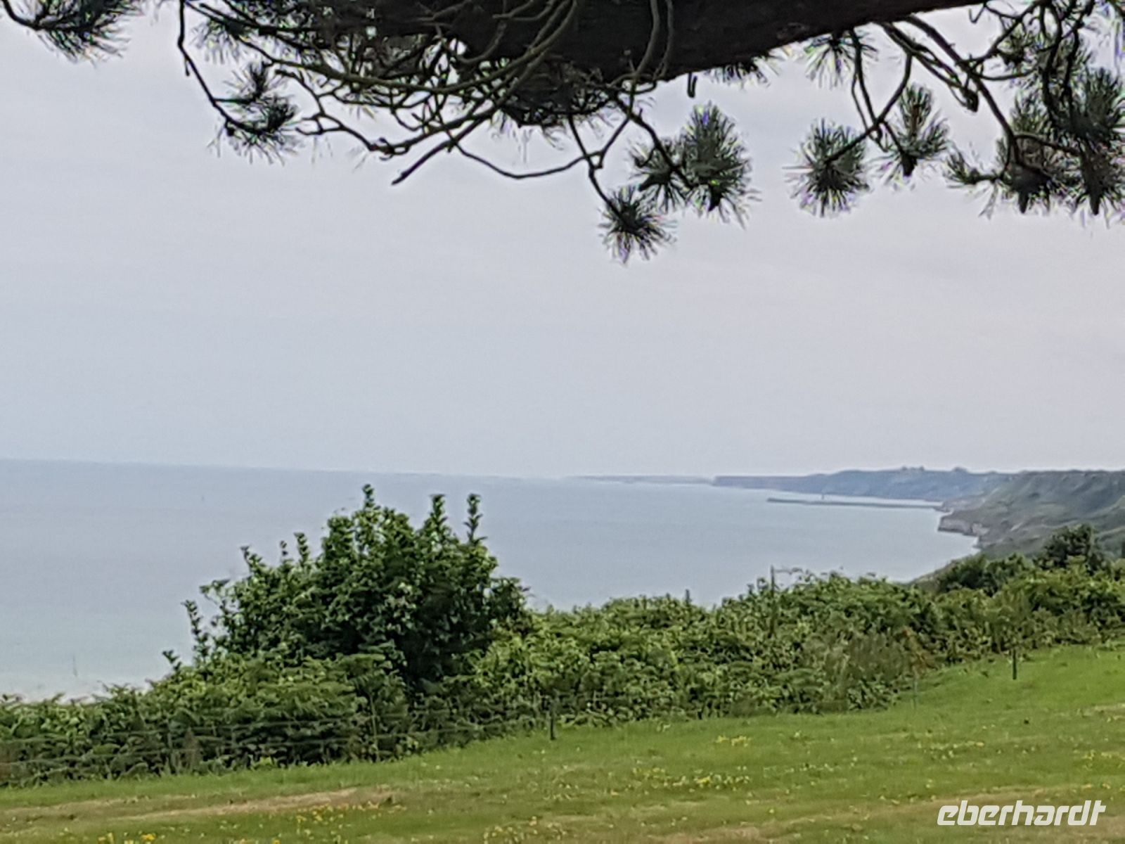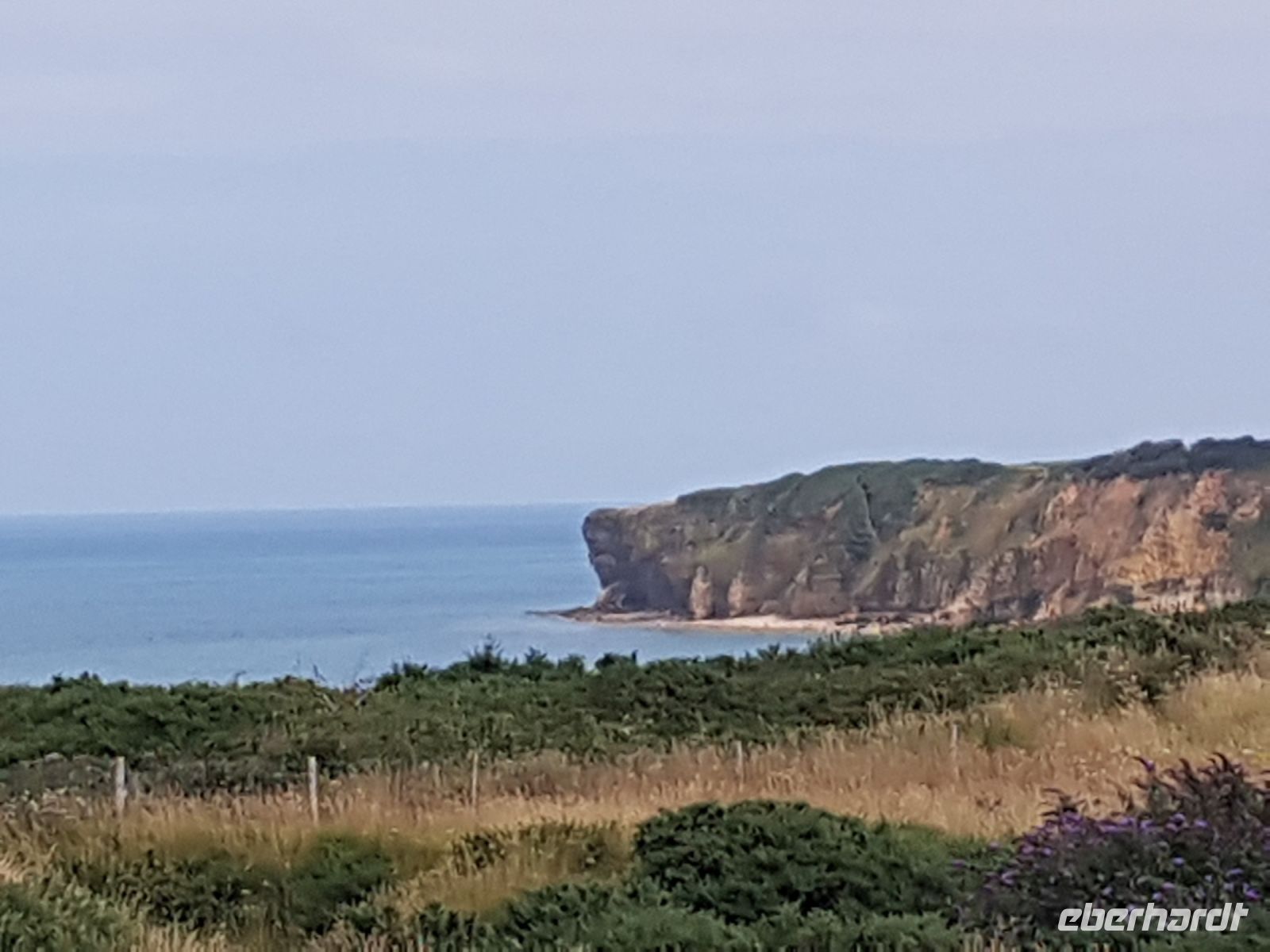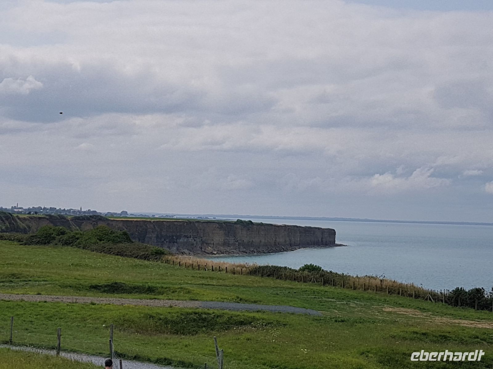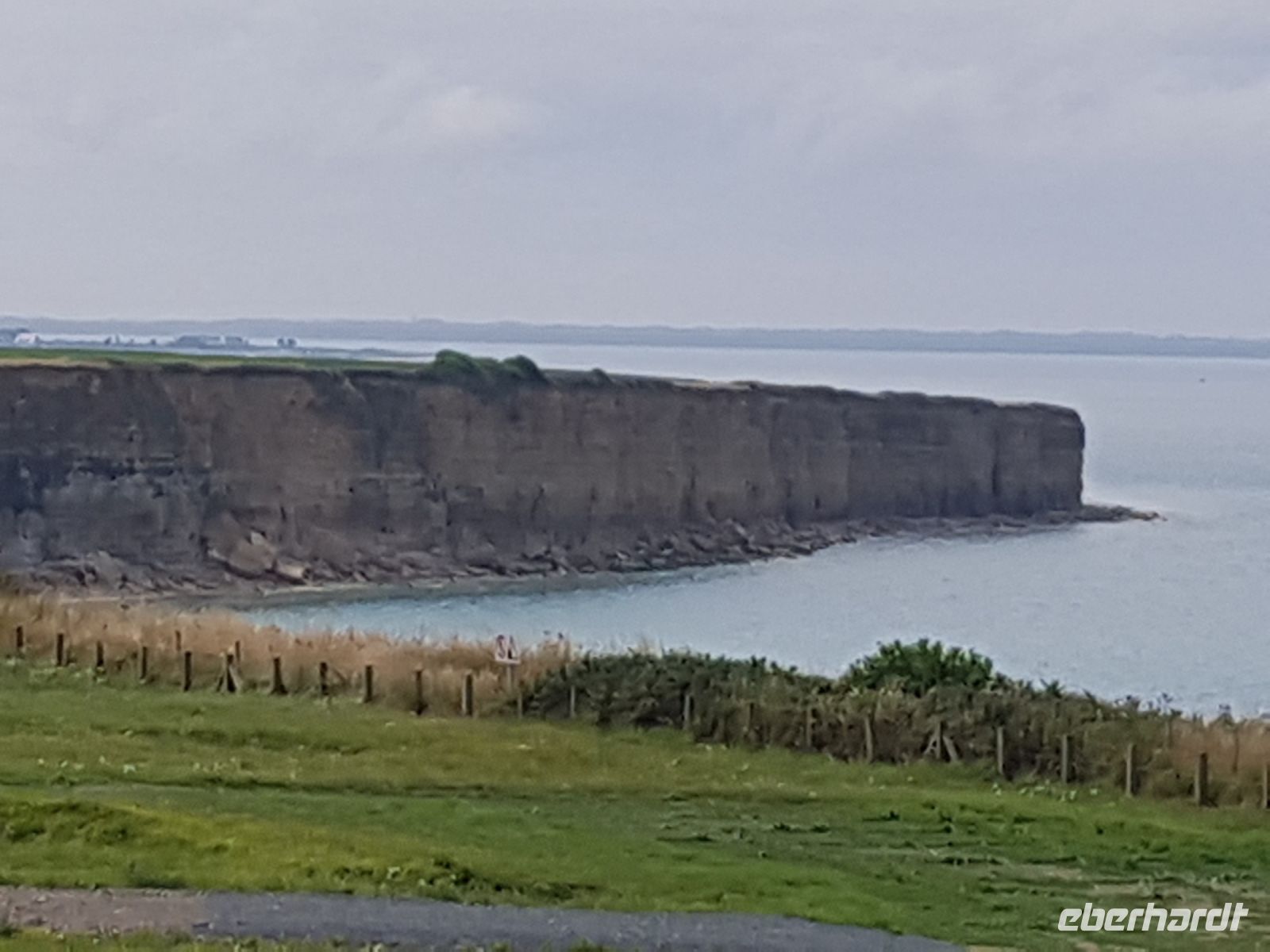 Als letzten Punkt unserer Fahrt erreichten wir am späteren Nachmittag die Steilküste von Point du Hoc, ebenfalls an der OMAHA BEACH. Auf diese Steilküste feuerten die alliierten Landungsbote Harpunen, an denen Strickleitern befestigt waren. Auf den so in den Felsen verankerten Strickleitern kletterte ein 225 Soldaten zählendes Rangerbataillon hinauf um die deutsche Stellung einzunehmen, die von hier aus die Abschnitte OMAHA und UTHA BEACH beschoss. Es gelang ihnen allen die Steilküste zu erklimmen trotzdem sie erbittert bekämpft wurden. Dann jedoch wurden sie eingekesselt und unter hohen Opfern erst in der Nacht zum 8. Juni vom 116. US Infanterieregiment befreit. Wir sahen uns in dem eingezäunten Gelände oberhalb der Steilküste um und führten uns dabei die Geschehnisse vor Augen.