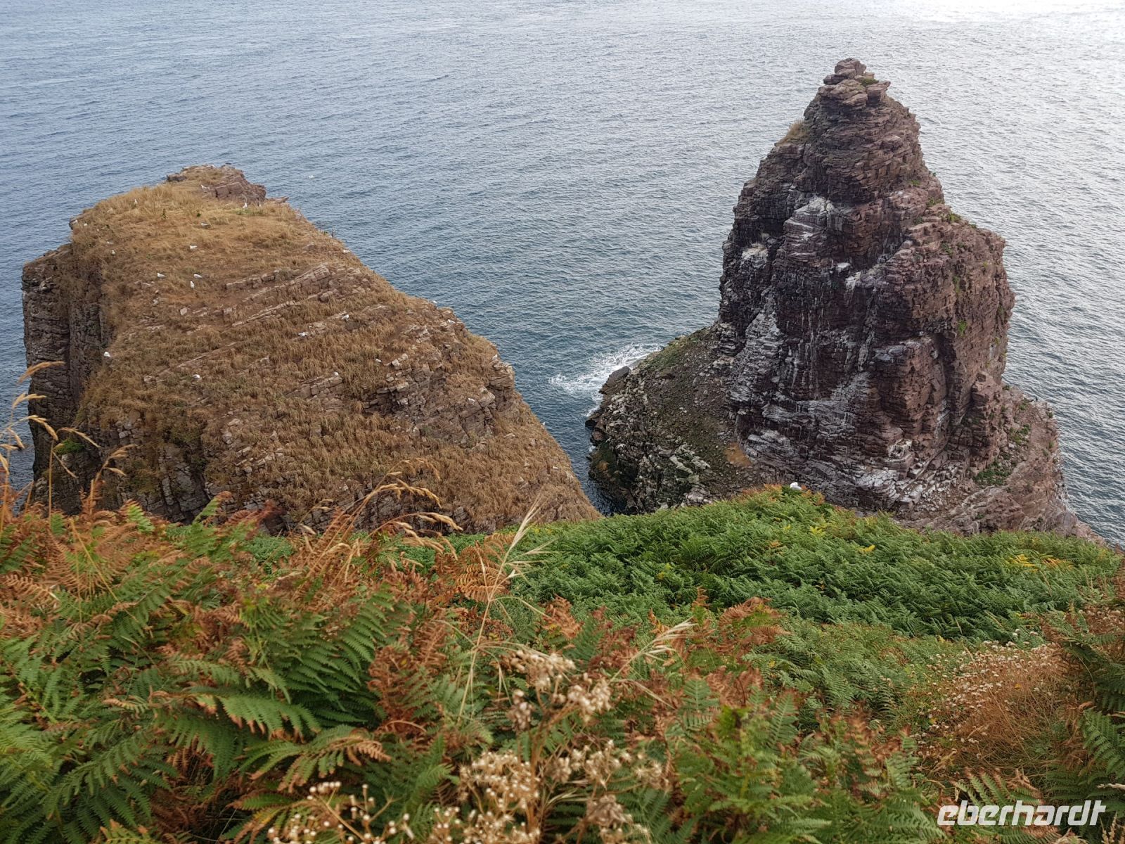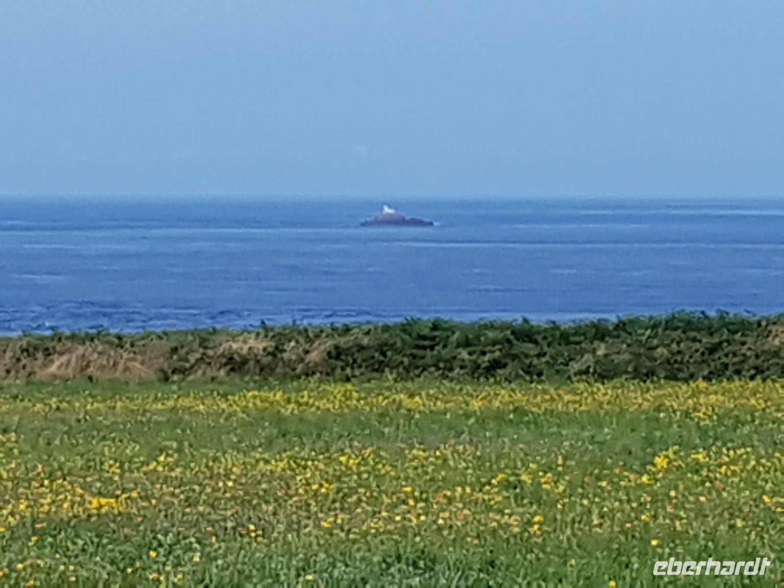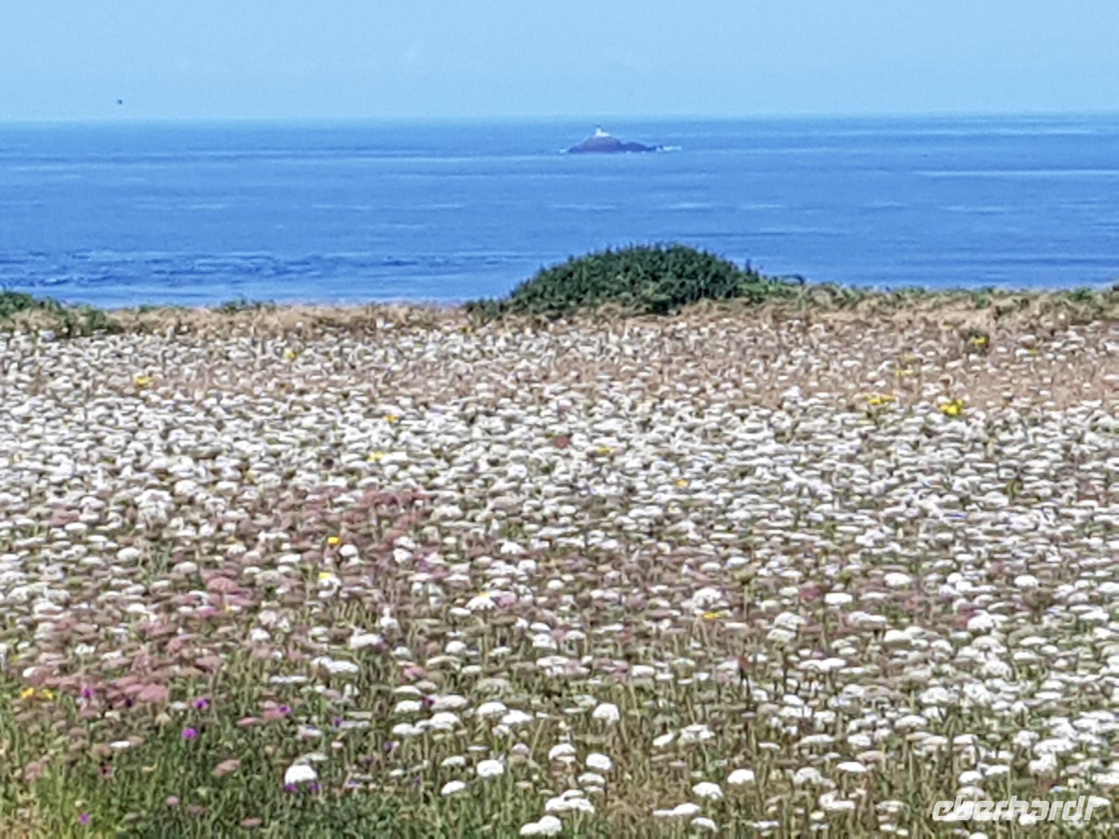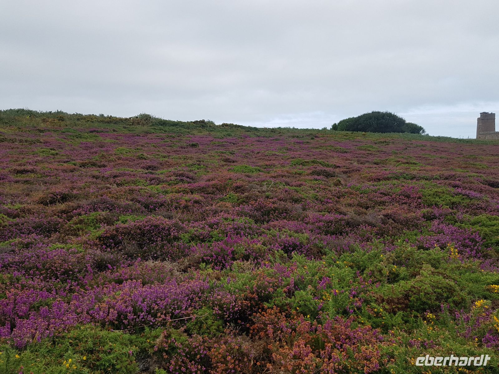 Das Cap Fréhel selbst hat ein 70 m hohen Steilküste. Hier pausierten wir einige Zeit, so dass wir die wunderbare Natur des Kaps erwandern konnten. Wie schön waren die Farben des kräftigen Rot-Violett der Erika und des satten Gelb der Ginsterpflanzen in dem Strauchteppich am Leuchtturm. Auf den steilen Felsen vor der Küste tummelte sich eine wahre Vogelwelt. Im Wasser waren hin und wieder Delphine zu sehen. Was für ein bezauberndes Naturparadies konnten wir hier erleben !