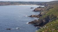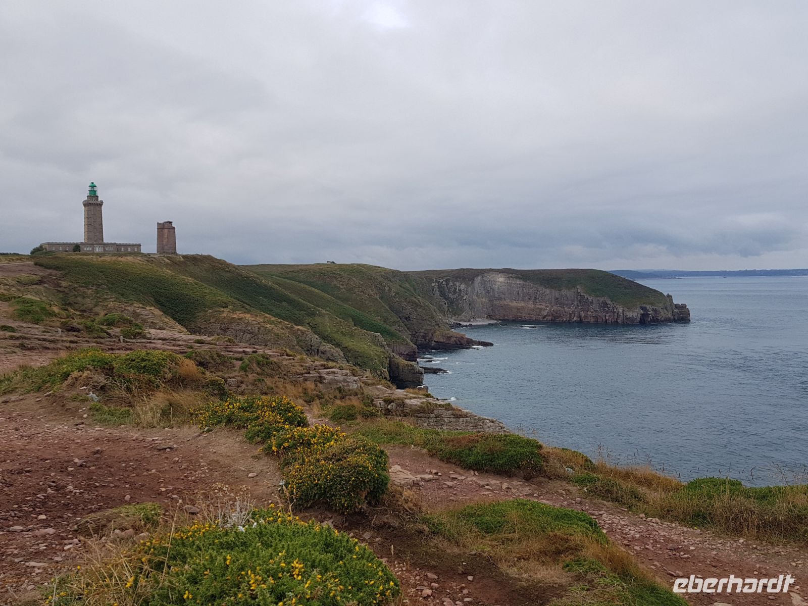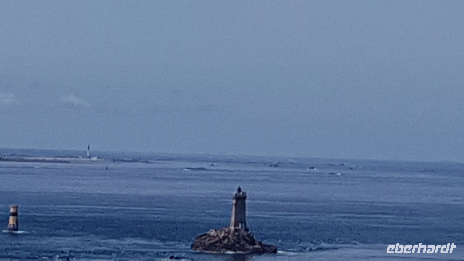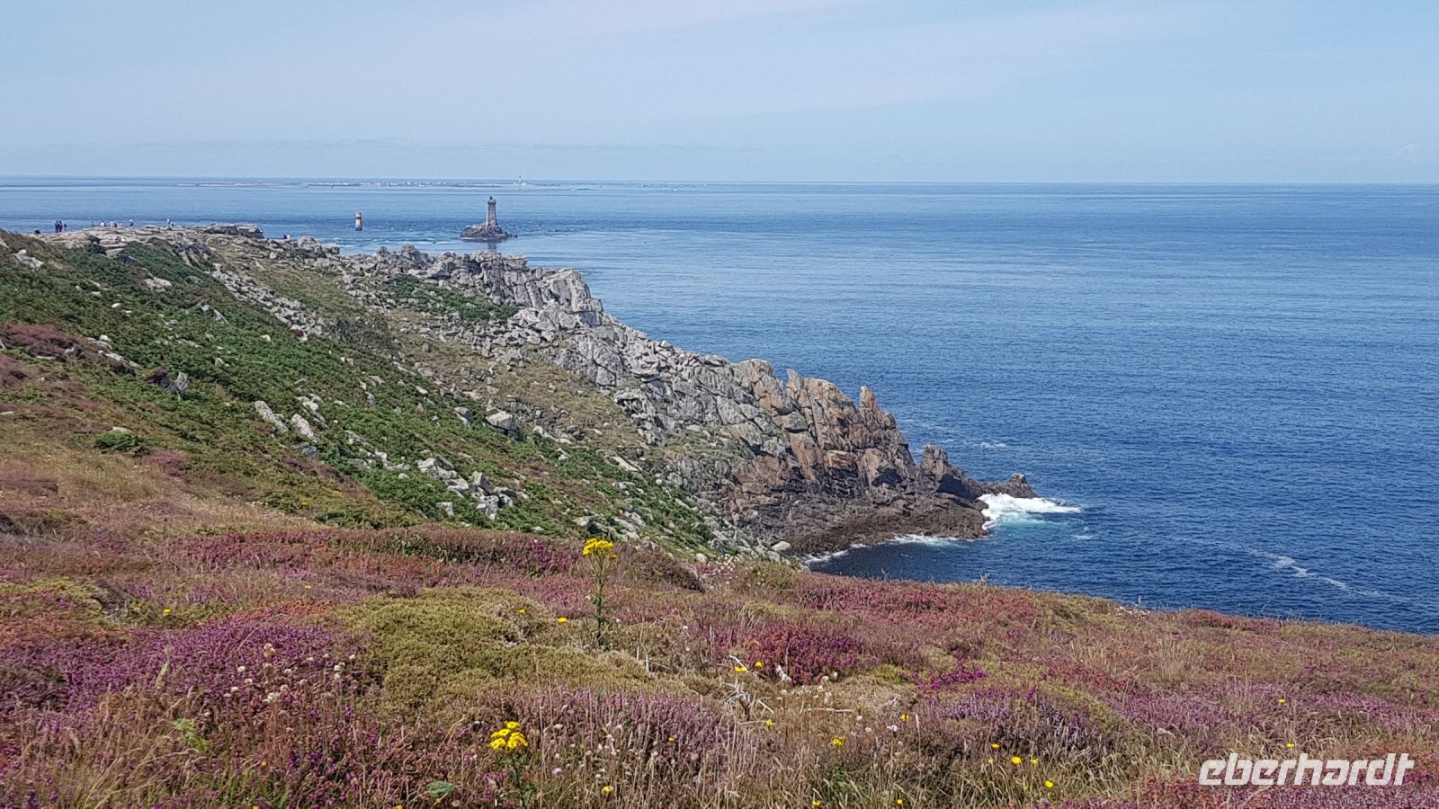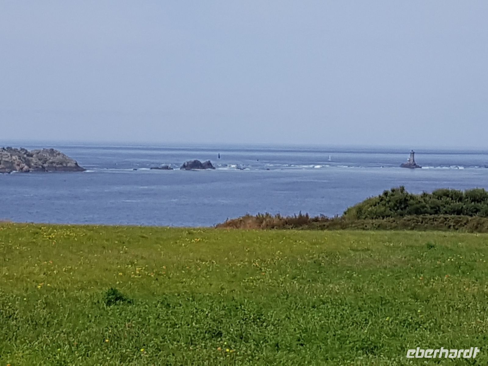 Wir stoppten zuerst an der Pointe de Brézellec, von wo wir einen super Blick entlang der Küste des Caps hatten. Wenig später kamen wir zur Pointe du Van, wo wir ebenfalls eine großartige Aussicht hatten. Anschließend fuhren wir direkt zur Pointe du Raz, wo wir unseren Bus abstellten und zur Felsenküste wanderten. Wir hatten eine super gute Sicht und konnten sogar die ca. 8 km entfernte "Ile de Sein" und die Leuchtturminsel „Le Tévennec“ sehen. Es herrschte fast absolute Windstille, so dass es auch kaum Bewegung im Meer gab. Das Meer war so glatt, dass sich der Leuchtturm darin spiegeln konnte.