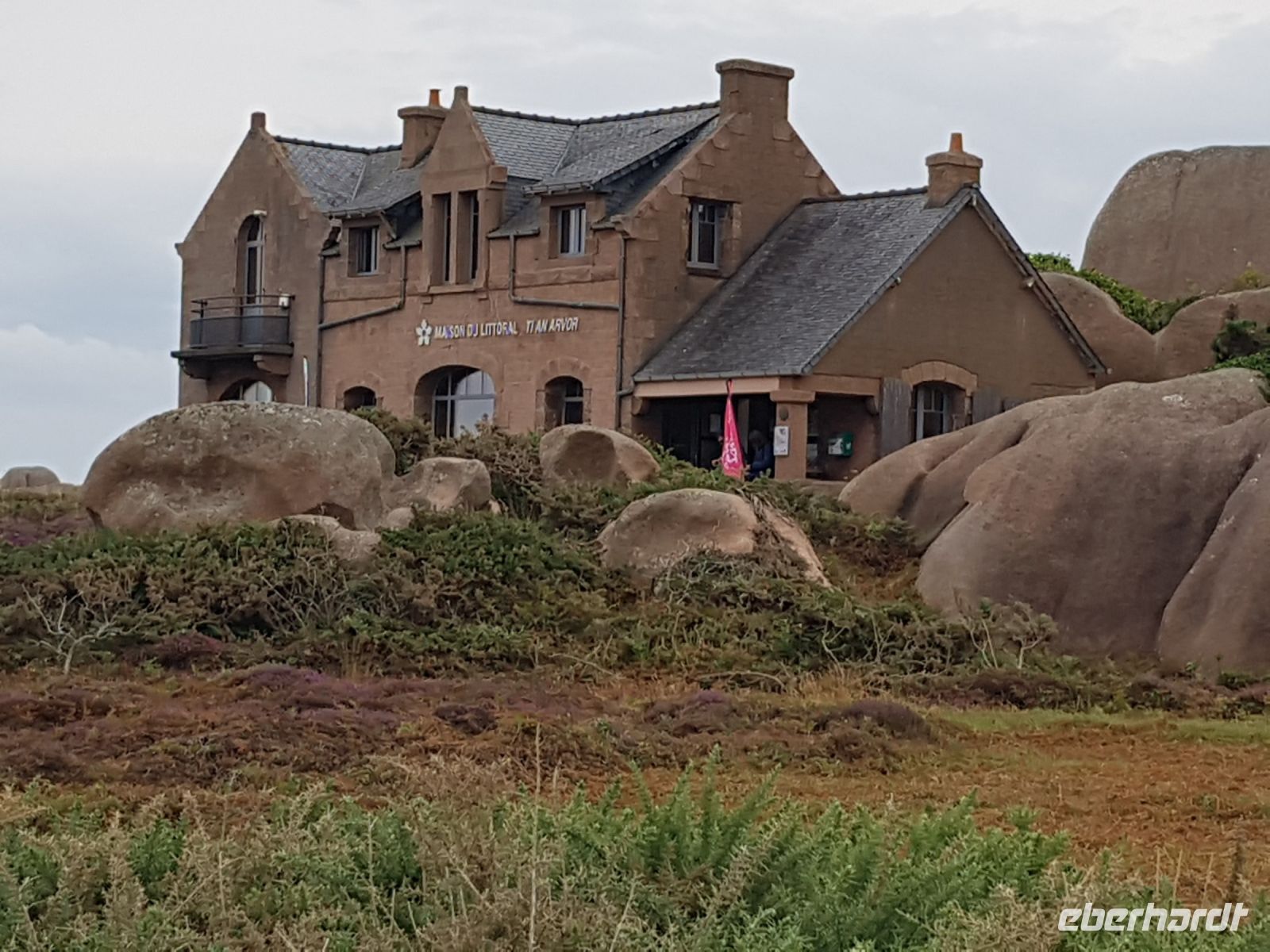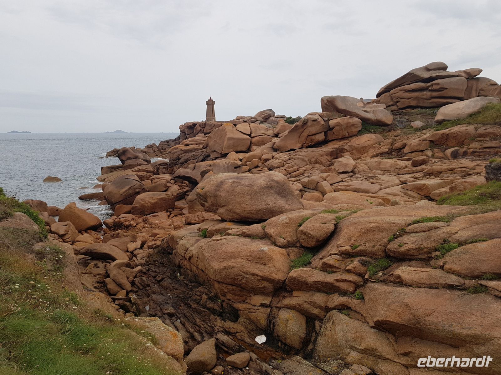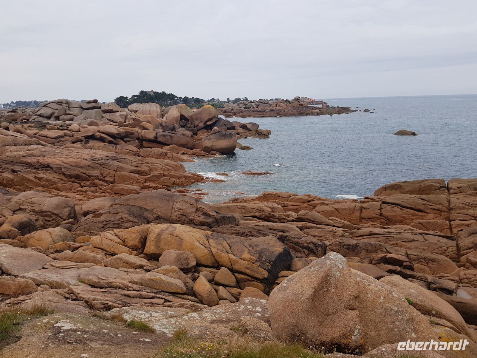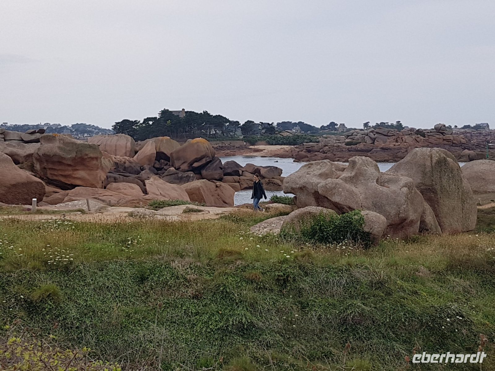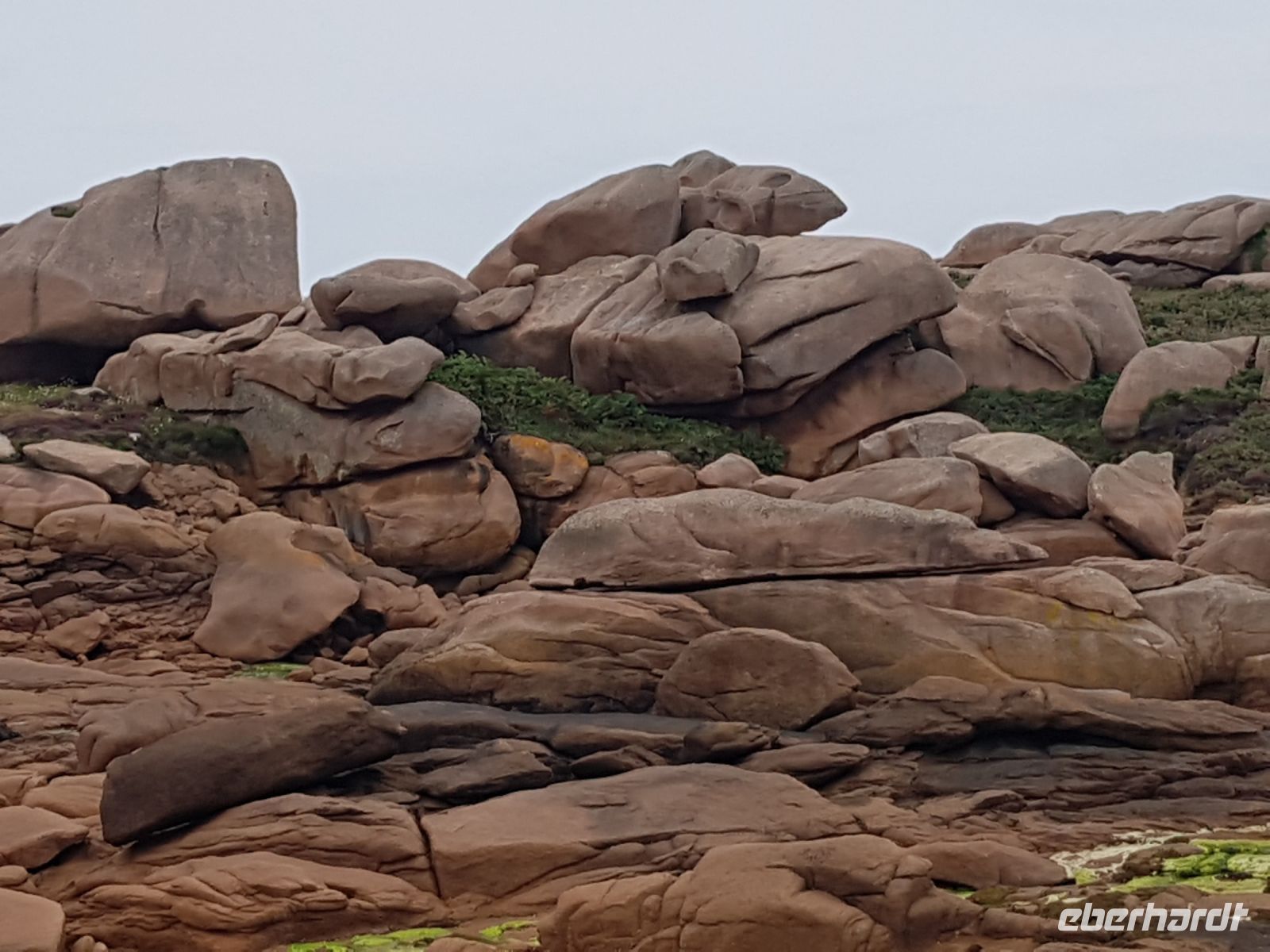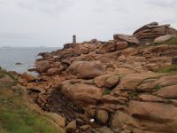 Nach diesem einzigartigen Naturerlebnis warte nun die nächste bretonische Küstenlandschaft auf uns. Es sollte die rosafarbene Granitküste sein. Um zu ihr zu gelangen fuhren wir eine Weile durch das Inland der Bretagne. Dann gegen Mittag erreichten wir diese Küste, wobei wir erste einmal einen Fotostop bei Perros Guirec einlegten. Die Fernsicht war zwar etwas diesig, zeigte aber dennoch die vielen rosafarbenen Klippen und Riffs der Küste. Wenig später begannen wir in Ploumanac'h unsere Wanderung auf dem alten Zöllnerpfad an den bizarr geformten rosafarbenen Granitfelsen entlang. Was entdeckten wir dort für seltsame Fabelwesen, die die Natur als größte Künstlerin erschuf ? Ein Tiermaul, einen schlafenden Hasen, schlangenhaftes Untier und noch vieles mehr zauberte unsere Fantasie hervor.