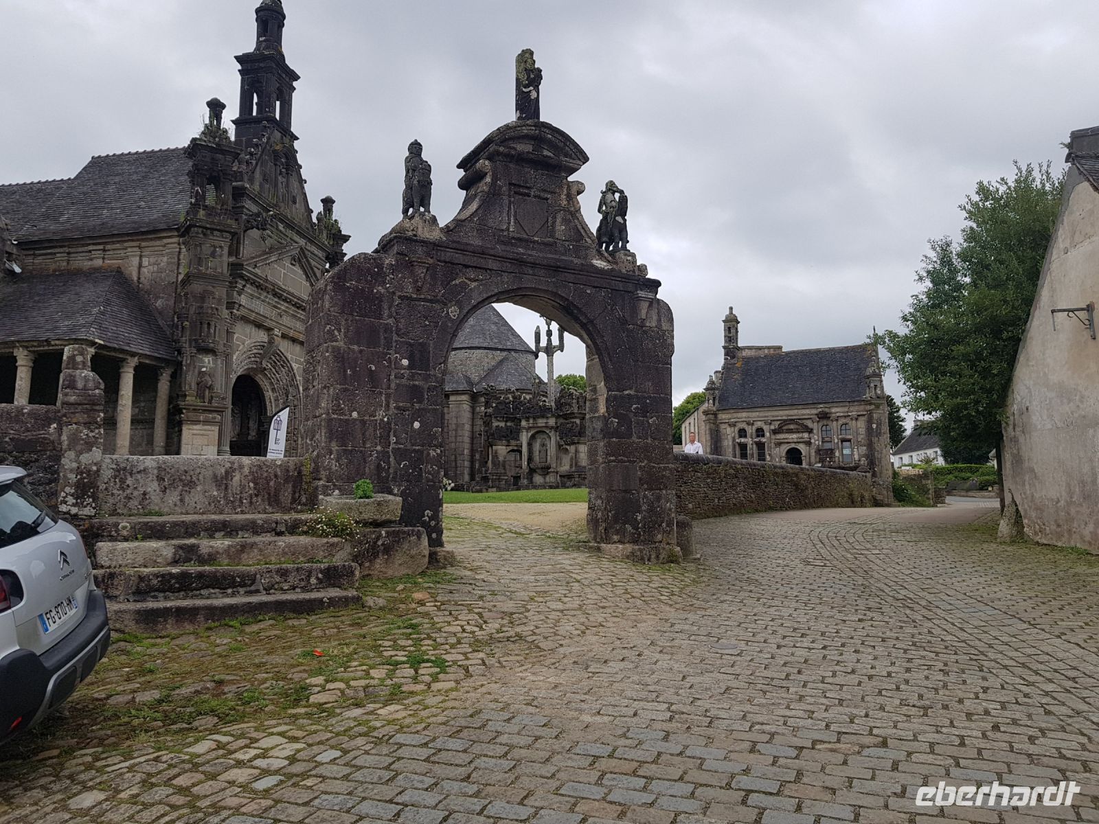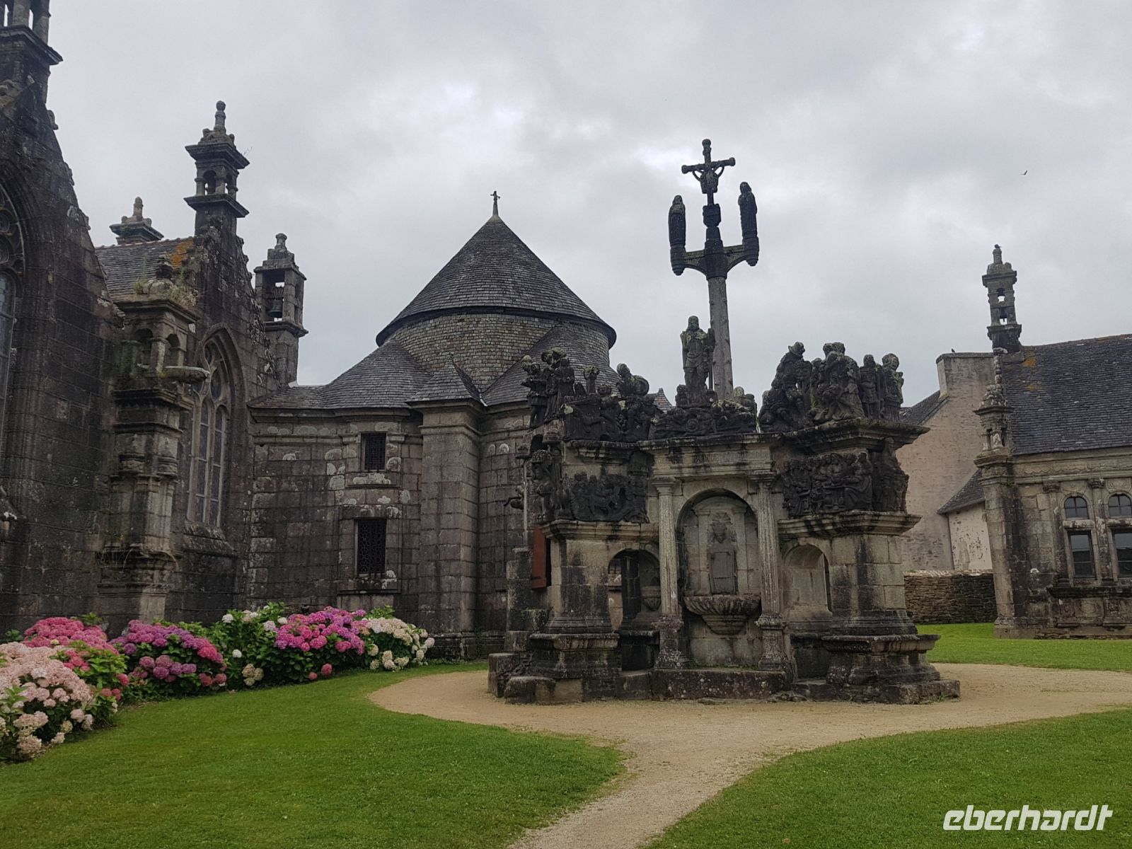 Anschließend nahmen wir von dieser bizarren Felsenküste Abschied und fuhren in das Departement Finistère nach Guimiliau. Dort befindet sich einer der berühmtesten und am vollständigsten erhaltenen Kalvarienberge der Bretagne. Bei ihnen handelt es sich um religiöse Denkmale, die in der Bretagne zwischen Mitte des 15. und dem 17. Jahrhundert entstanden sind. In Guimiliau gibt es einen Kalvarienberg mit besonders vielen Szenen der Passion, die in den Jahren 1581-1588 aus dem harten Granitstein geschaffen wurden. Neben dem Kalvarienberg beeindruckt vor allem die reich ausgestattete Kirche, die u.a. einen wunderschönen barocken Taufpavillon besitzt. Darüber hinaus gibt es hinter dem Kalvarienberg noch das Beinhaus, das vermutlich aus dem selben Zeitraum stammt.