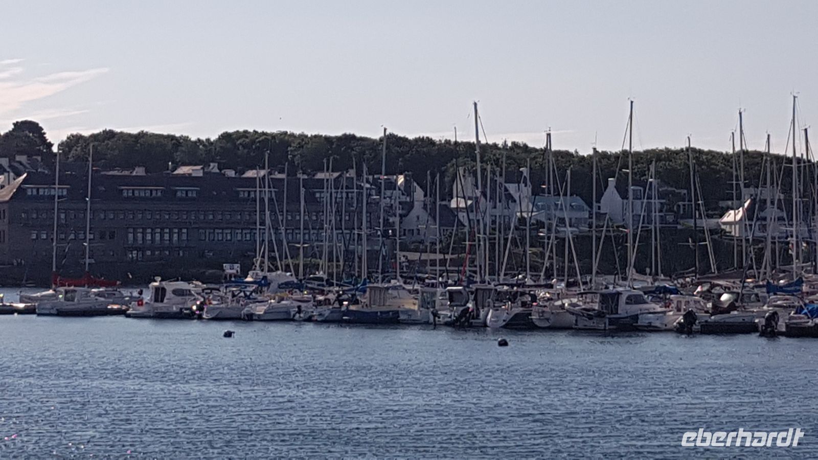 Auf diesem Weg kamen wir nach Concarneau, das mit seiner von einer Festungsmauer umschlossenen Altstadt einen besonderen Charme hat. Diese „ville close“ (Altstadt) war unser erstes Ziel. Wir kamen an dem „Amiral“ vorbei, das durch die Krimis von Jean-Luc Bannalec inzwischen Kultstatus erlangt hat und gingen an den Häfen entlang über die alte Festungsbrücke. Noch war kein Tourist hier unterwegs, die Läden öffneten gerade und die Bars stellten ihre Stühle hinaus. So genossen wir die Atmosphäre in der Hauptgasse der Altstadt und gingen zur Hafenausfahrt. Dann spazierten wir zurück zur Markthalle, wo wir uns an den einzelnen Ständen nicht satt sehen konnten vor lauter Begeisterung für die kunstvollen Arrangement der angebotenen Waren.