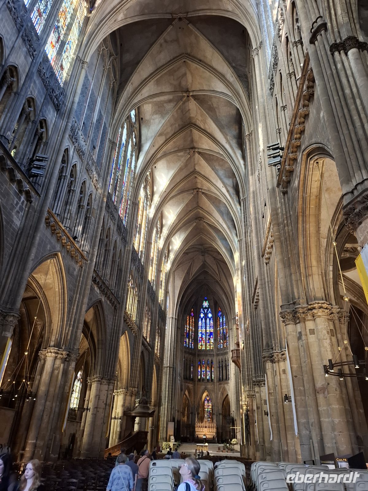 Von unserem Hotel am Rand der hübschen Altstadt von Metz unternahmen wir noch vor dem, Abendessen einen Stadtspaziergang. Einst gehörte Metz zu den Hauptstädten des fränkischen Reiches, war freie Reichs- und später Garnisonsstadt. All dies lässt sich noch in den Gebäuden und Straßenzügen ablesen. Ein historischer Markt außerhalb der einstigen Mauern, heute Place St. Louis, ist mit der Gründungslegende der Stadt verbunden. Darauf verweist das „Haus der Köpfe“, dessen Seitenwand mit einst vergoldeten Stuckköpfen verziert ist, Von hier ging es durch die Fußgängerzone der Hauptstraße zum inneren Markt und von hier zum einstigen Garnisonsplatz, an dessen einer Längsseite sich imposant die Stefans-Kathedrale erhebt. Das gotische Bauwerk, errichtet in fast dreihundertjähriger Bauzeit zwischen 1220 und 1520 gehört zu den bedeutendsten Kirchenbauten in Frankreich und ganz Europa. Bemerkenswert an St. Etienne ist neben der größten Fläche historischer Buntglasfenster in Frankreich – erstaunliche 6.500 m² vor allem ihr Gewölbe. Mit 41 m Höhe ist nicht nur das dritthöchste gotische Kirchengewölbe überhaupt, aber es wirkt einerseits filigran, einfaltet andererseits aber eine beeindruckende Raumwirkung. Wegen dieser und dem Lichteinfall durch die vielfarbigen Fenster, von denen einige von dem berühmten „Maler-Poeten“ Marc Chagall gestaltet wurden, hat man dem Metzer Dom auch den Namen „Laterne des lieben Gottes“ gegeben.
