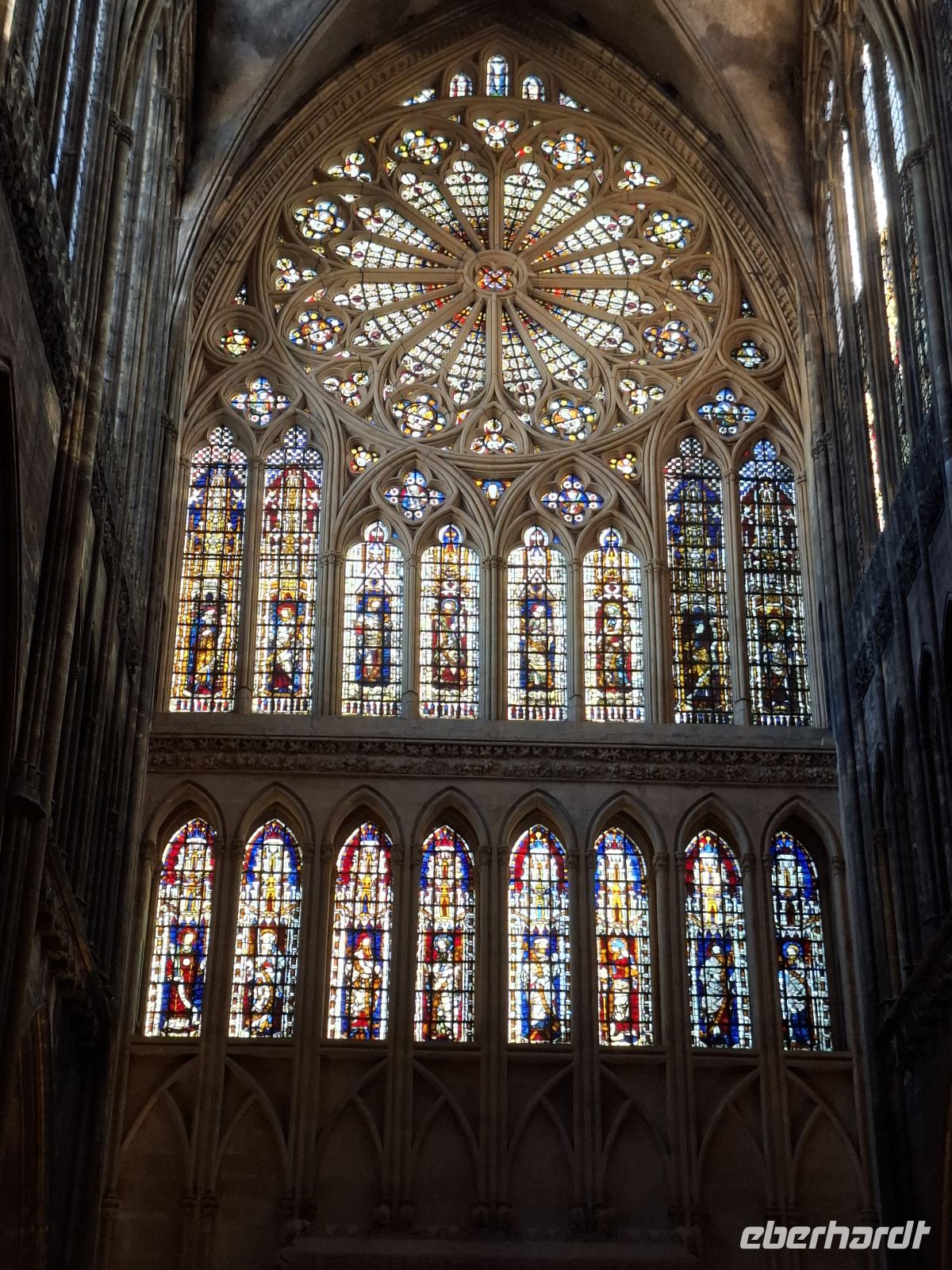 Auch hier in Rouen beeindruckt das Kircheninnere mit phantastischer Raumwirkung. Einmal mehr zeigt sich die Gotik als die „Architektur des Lichts“ – aufgebaut auf der Aussage von Jesus Christus in der Bibel „Ich aber bin das Licht der Welt“. Nach Verlassen der Kathedrale befanden wir uns sogleich in einer der ältesten Fachwerkstraßen. Entlang an Kathedrale und den Resten des einstigen Bischofspalastes – historisch bedeutsam als Schauplatz des Tribunals gegen die französische Nationalheilige Jeanne d’Arc - die als „Jungfrau von Orleans“ eine Wende im „Hundertjährigen Krieg“ Frankreichs gegen England bewirkt hatte und die in Rouen 1431 auf Geheiß der Engländer auf dem Scheiterhaufen verbrannt wurde.