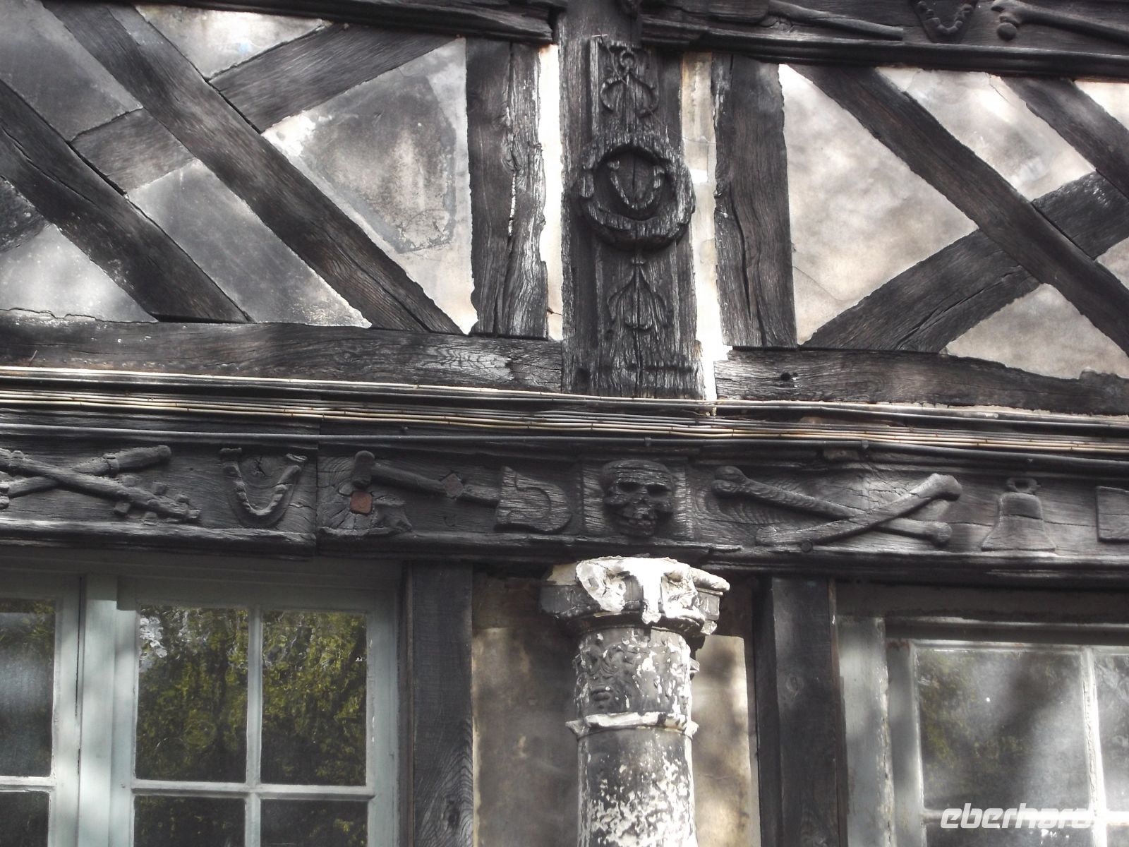 Durch das alte Fachwerkviertel von Rouen besuchten wir hinter der alten Pfarrkirche Saint-Maclou den als „Aitre de Maclou“ bezeichneten ehemaligen Pestfriedhof. Diese leicht makabre Sehenswürdigkeit, an allen Seiten von niedrigen Fachwerkgebäuden umgeben, zeigt Balken deren Schnitzereien mit Totenköpfen, Gebeinen und Beerdigungswerkzeugen versehen sind und gehört zu den ältesten geschlossenen Fachwerkensembles in Europa.