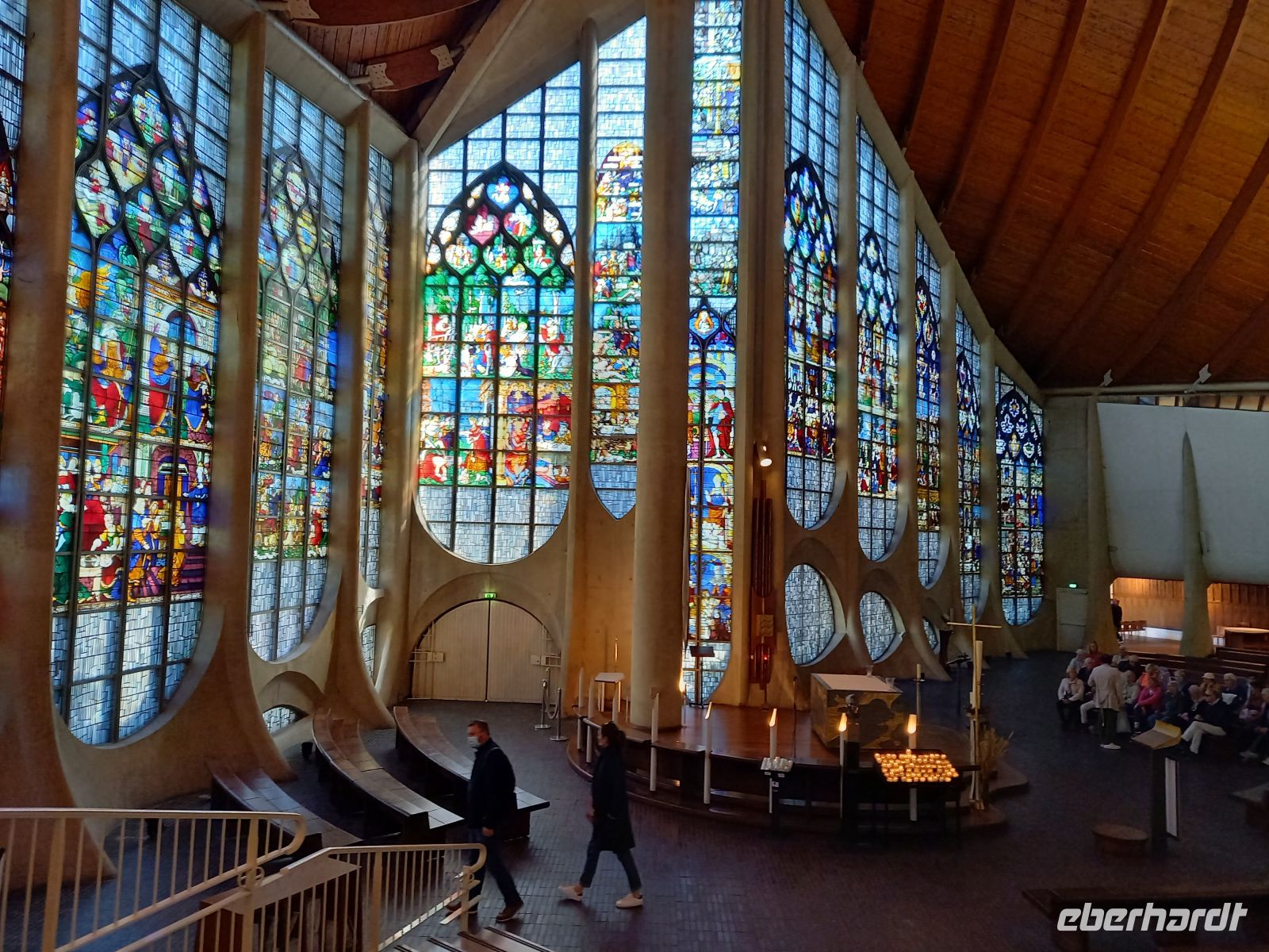 Am historischen Markt von Rouen hatten wir das endgültige Ziel unseres Stadtrundganges erreicht Umstanden von Fachwerkhäusern aus verschiedenen Epochen markiert im Zentrum des Platzers ein großes Kreuz die Stelle, an der 1431 der Scheiterhaufen für die Nationalheldin Jeanne d‘Arc stand. Sie wurde später vom Vorwurf der Ketzerei rehabilitiert und 1920 heiliggesprochen. 1979 errichtete man eine moderne Kirche zu ihrem Gedenken einen seltsam geformten Bau aus Stahlbeton, der als Gesamtbau die Form eines Drachen hat. Im Inneren befinden sich ca. 500 m² farbiger mittelalterlicher Glasfenster, die einst die im Krieg zerstörte Marktkirche zierten. Am Markt hatten wir Freizeit für Mittagsimbiss und Souvenirkäufe.