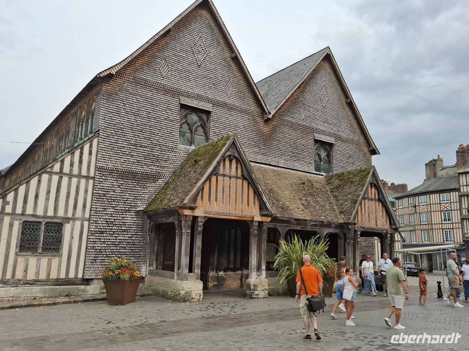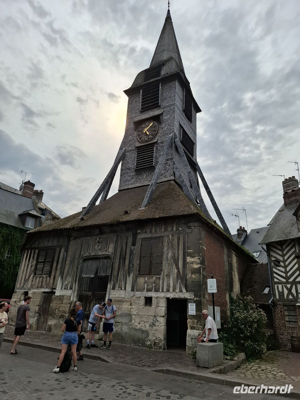 Nachdem auch wir die von den Gezeiten stark beeinflusste Mündung der Seine überquert hatten, erreichten wir die pittoreske Hafenstadt Honfleur. Seit Jahrhunderten zieht ihre vor allem rund um den quadratischen alten Hafen errichtete Altstadt bedeutende Künstler an. Diesem Hafen und den Künstlern verdankt Honfleur vor allem seinen Ruf als bedeutende normannische Touristenattraktion. Ein weiterer Grund ist die berühmten Holzkirche Sainte-Catherine. Kurz nach dem französischen Sieg im hundertjährigen Krieg erbaut, fehlten dem Ort nicht nur Geld, sondern auch Baumeister und Steinmetze. Daher wurde die – für Kirchenbauten ungewöhnliche zweischiffige – Kirche von Schiffszimmerleuten erbaut und zwar angeblich aus den Materialien abgewrackter Schiffe.