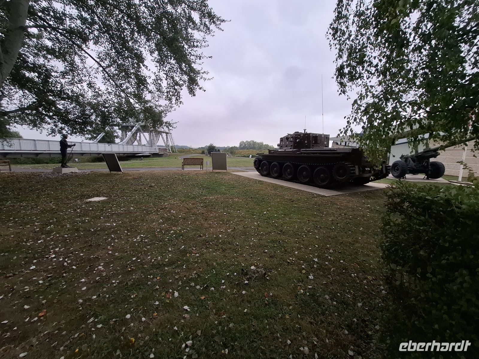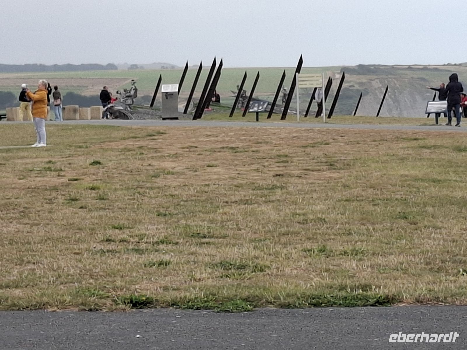 Erstes Ziel heute war die „Pegasusbrücke“ im Vorort Benouville. Hier hatten in nächtlicher Vorbereitung der Lande-Operation britische Fallschirmjäger eine wichtige Naschschublinie hinter der deutschen Front unter ihre Kontrolle gebracht. Dann ging es auf der Küstenstraße, deren Verlauf seit dem Krieg unverändert ist, an zahlreichen Gedenkorten der Landungen am „Sword“-Beach und „Juno“-Beach vorbei. Der nächste Halt war an einem Bunker bei Asnelles, wo als Kriegsgedenkstätte neben Denkmalen und einer Heiligenfigur auch alte Pontonbrücken lagen und man zur Illustration die zum Schutz gegen Lastensegler aufgestellten schrägen Speerspitzen aufgestellt hatte. Von hier waren auch die unweit des Strandes liegenden „Mulberry“-Häfen zu sehen. Diese gewaltigen Betonklötze sind die Überreste der mächtigen Senkkästen, die die größten Schiffe der Alliierten zwischen sich befördert hatten, denn da die Küste für eine Landung nicht geeignet war, mussten sie Hafenanlagen mitbringen: Anlegeplätze, Molen und Fahrstraßen aus dem Beton in einst 33 riesigen Senkkästen.