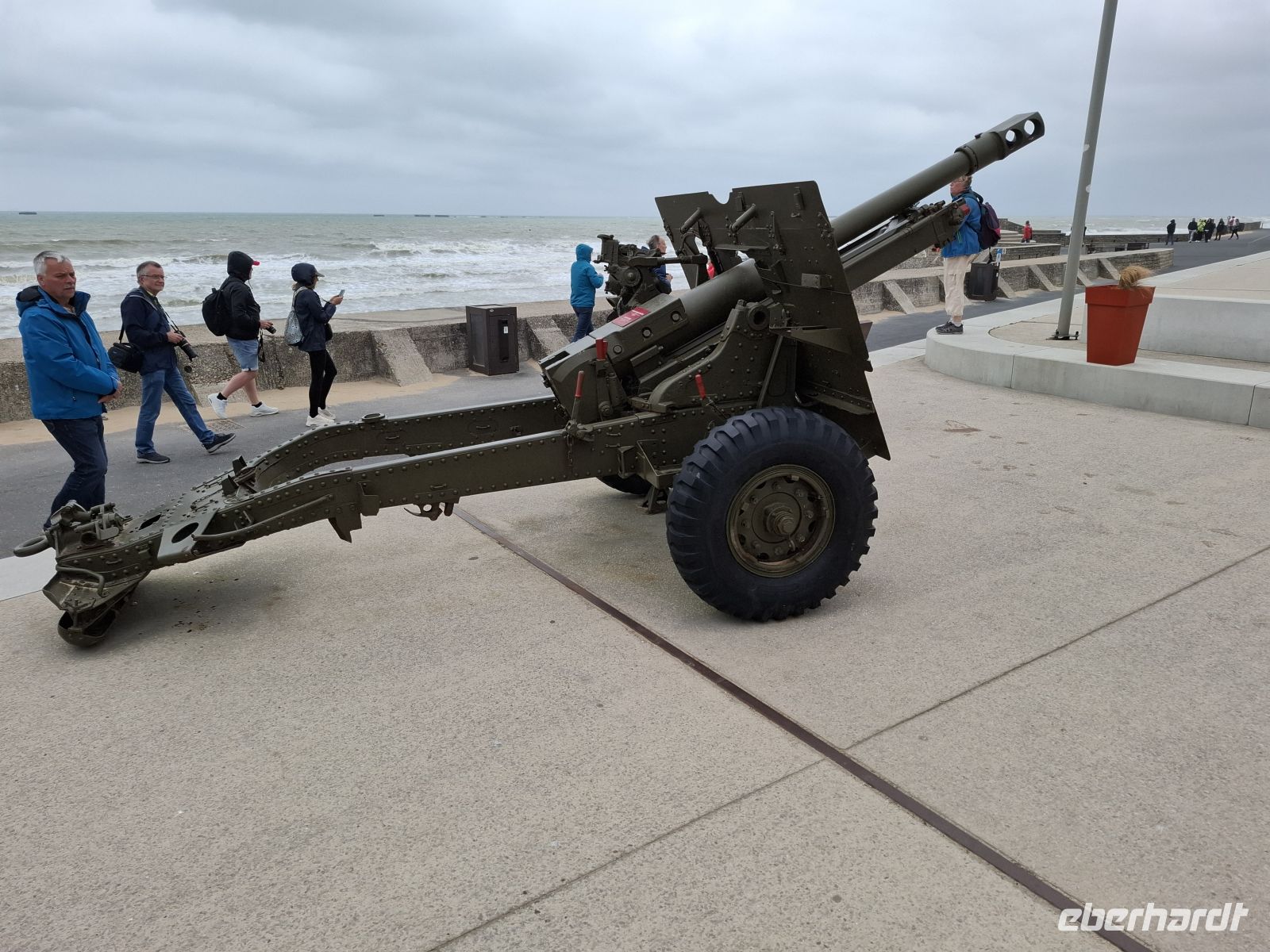 Von diesem Aussichtspunkt ging es ins nahe Arromanches, wo wir zum bekannten „Gold“-Beach spazierten, an dessen Strand noch historische Pontons liegen und wo vor dem Landungs-Museum, zu dessen Besuch wir Zeit hatten, Geschützerz und Kettenfahrzeuge stehen. - .