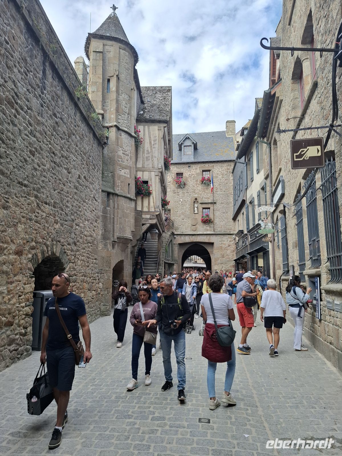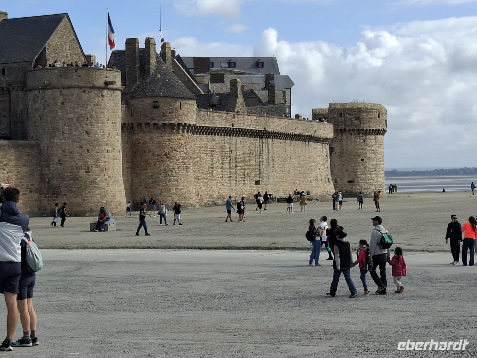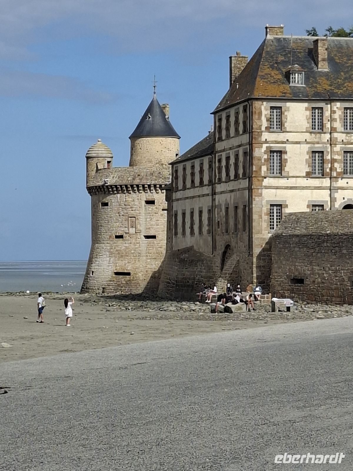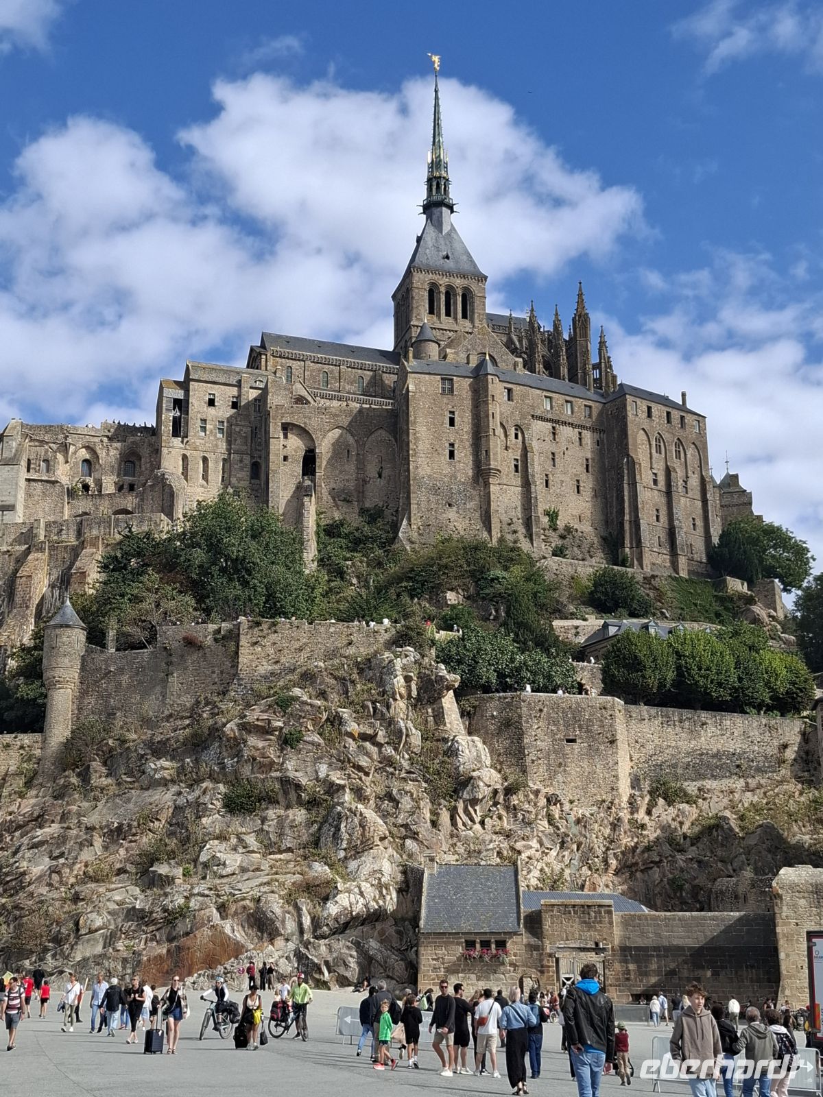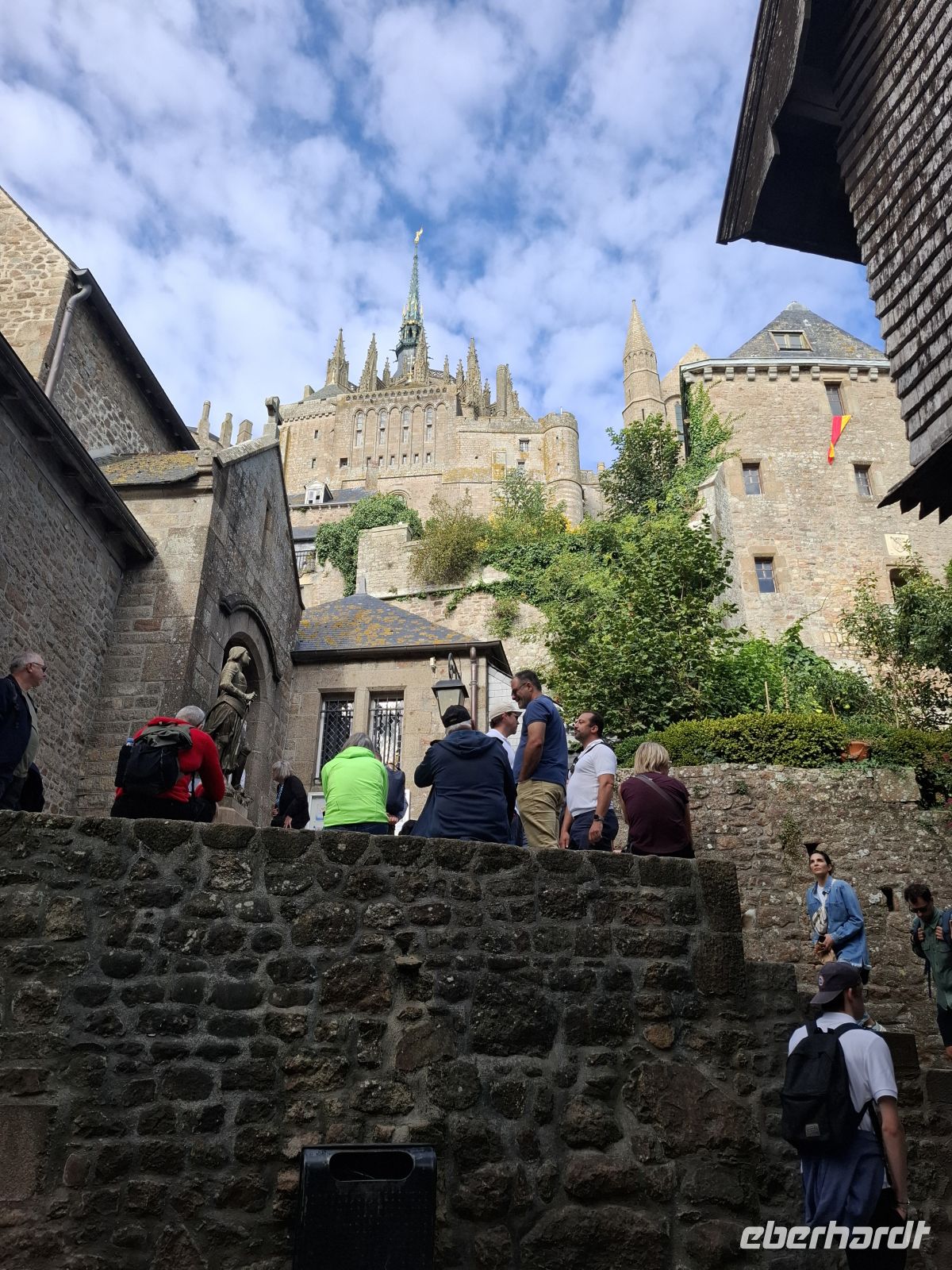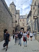 Früh brachen wir heute auf, um das „Wunder des Abendlandes“ zu sehen. So nannte man schon seit dem Mittelalter die Klosterfestung Mont St.Michel genannt. Wir lernten diesen eins bedeutenden mittelalterlichen Wallfahrtsort bei herrlichem Wetter kennen. Er hat seinen Beinamen wahrlich verdient und natürlich auch seinen seit 1979 bestehenden Status als UNESCO-Weltkulturerbe. Wuchtig und doch filigran türmt sich der Mont St.Michel – eine Mischung aus Kloster, Dorf und Festung bis 150 m aus dem Meer auf. Die Bauten entstammen verschiedenen Epochen und lassen sich auf Heiligtum für den Erzengel Michael zurückführe, das Anfang des 8. Jh. auf einer felsigen Gezeiteninsel errichtetet wurde. Heute erhebt sich der wie eine Burg befestigte Klosterberg mitten aus einer von sehr starken Gezeiten mit bis zu 12 m Tidenhub geprägten Bucht. Mit der Bedeutung des Ortes als Wallfahrtsort und dem damit verbundenen Reliquienhandel stiegen Bautätigkeit und Ausbau der Wehranlagen. Zudem entstanden gewaltige, massiv aufstrebende Stützmauern, die bis heute die deutliche Last von Aufbauten wie Profangebäude, Schlossbauten, Kirchen und eines gotischen Klosters tragen, an dem insgesamt weit über 500 Jahre gebaut wurde. Die Spitze der großartigen Kirchenanlage krönt eine Figur des Erzengels Michael. Tatsächlich kann man angesichts der Bauten, ihrer Pracht, Vielfältigkeit und den Besonderheiten der Anlage nur staunen, zumal der Klosterberg bei nahezu jeder Beleuchtung und jedem Wasserstand anders wirkt. Nach dem recht anstrengendem Aufstieg oben gelegenen Eingang ins Innere des Klosterberges wurde der Gang durch die bautechnischen Meisterleistungen zu einer Zeitreise durch die Vergangenheit, bei der die Einmaligkeit des Ortes, die Wucht seiner Bauten und die spürbare Mystik erahnen lassen, warum von hier Wundergeschichten erzählt wurden, die ihn für Jahrhunderte nach Jerusalem und Rom zu einem der wichtigsten Wallfahrtsorte der Christenheit machten.