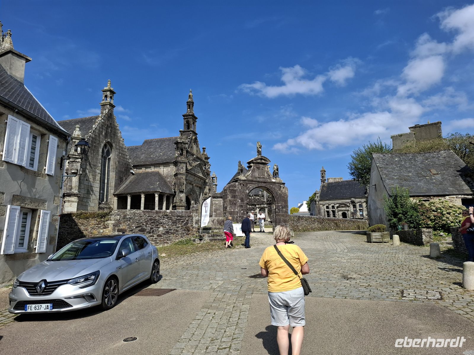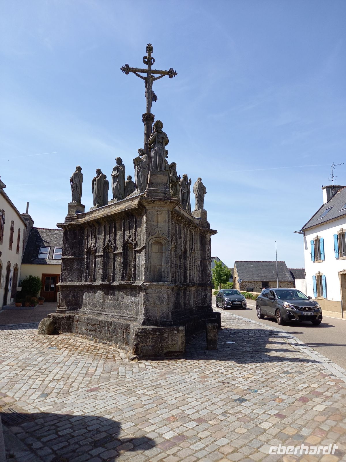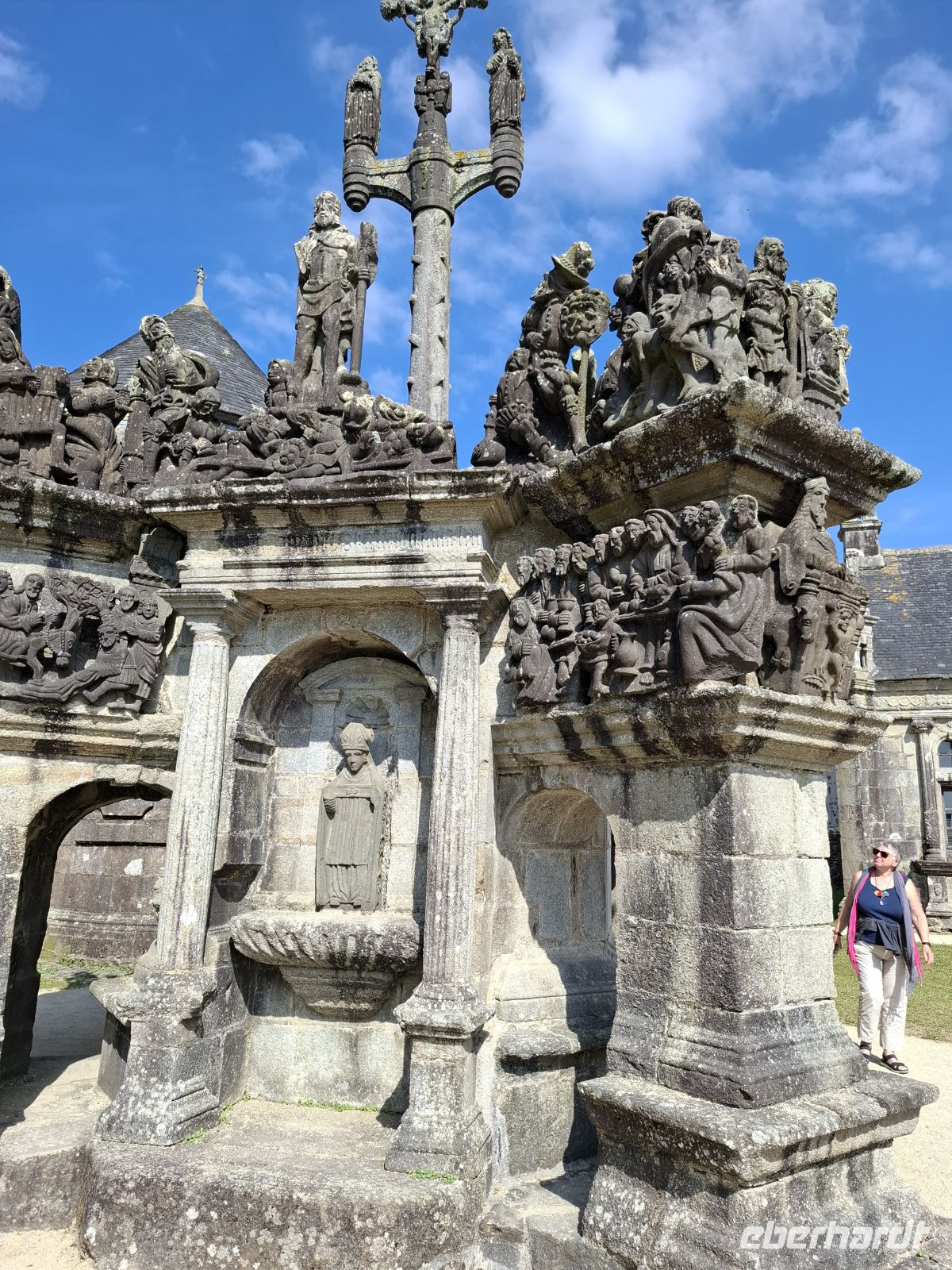 Am Nachmittag schließlich erlebten wir eine bretonische Besonderheit, eng verbunden mit dem starken katholischen Glauben und religiösen Traditionen des Landesteils. Eine Vielzahl „umfriedeter Pfarrhöfe“ gibt es hier – Ensembles, bestehend aus einer Dorfkirche mit meist vorgelagerter Eingangshalle, ummauertem Friedhof mit Triumphtor, einem Beinhaus und einem „Kalvarienberg“. Ein besonders bekanntes und sehenswertes Exemplar unter den etwa 70 noch vorhandenen ist der Pfarrhof im Dörfchen Guimiliau.