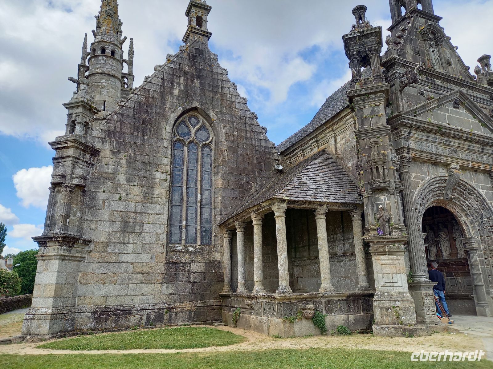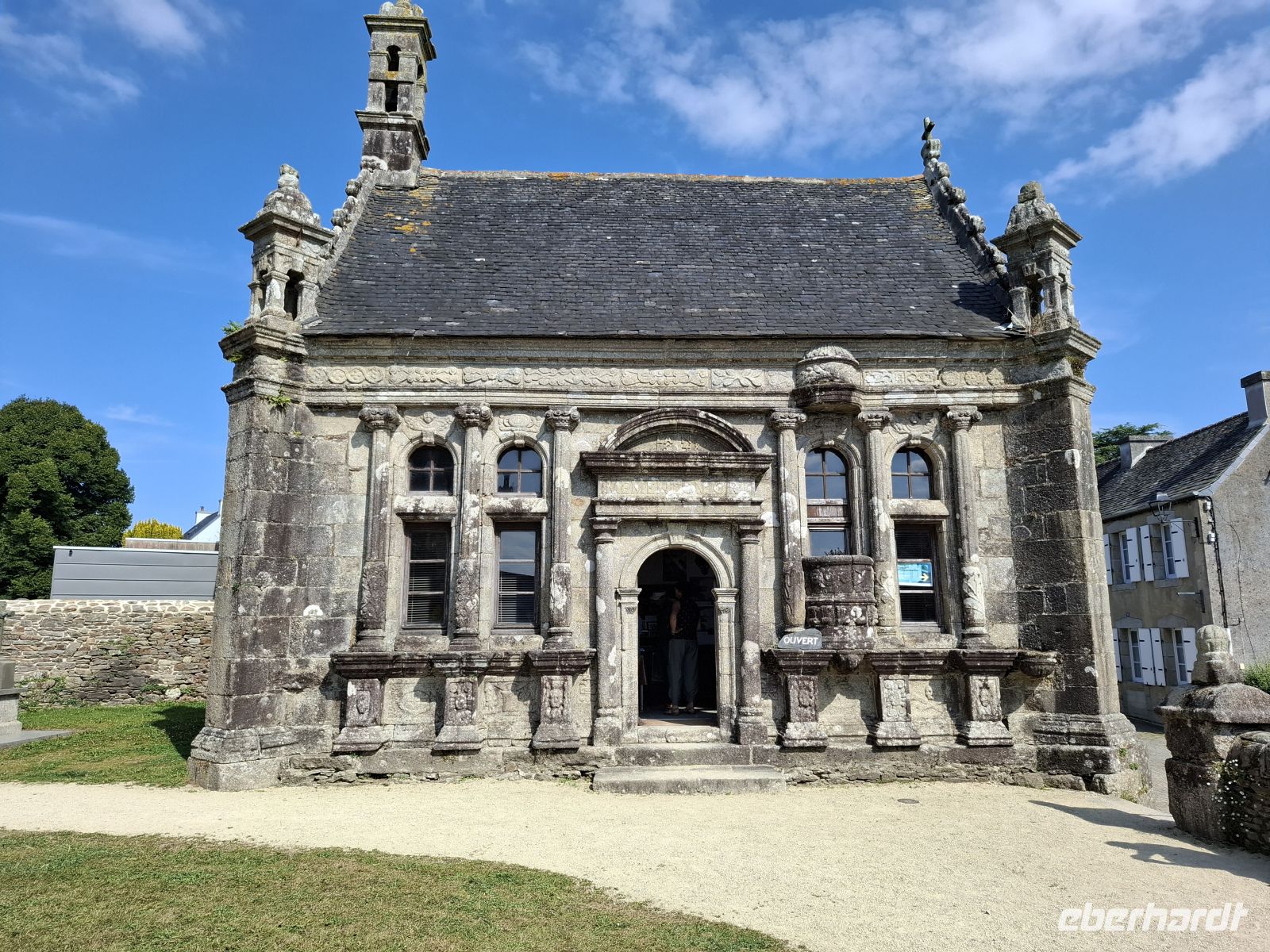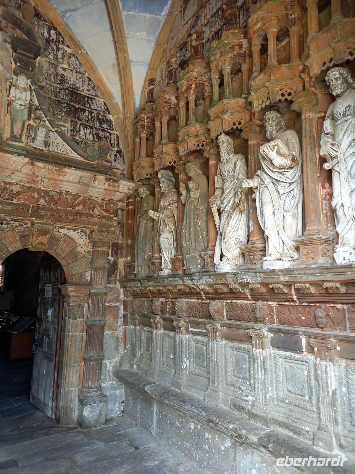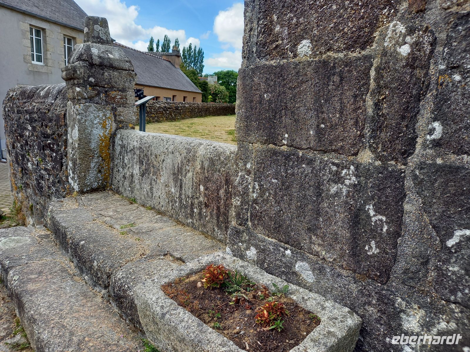 Am Nachmittag schließlich erlebten wir eine bretonische Besonderheit, eng verbunden mit dem starken katholischen Glauben und religiösen Traditionen des Landesteils. Eine Vielzahl „umfriedeter Pfarrhöfe“ gibt es hier – Ensembles, bestehend aus einer Dorfkirche mit meist vorgelagerter Eingangshalle, ummauertem Friedhof mit Triumphtor, einem Beinhaus und einem „Kalvarienberg“. Ein besonders bekanntes und sehenswertes Exemplar unter den etwa 70 noch vorhandenen ist der Pfarrhof im Dörfchen Guimiliau.