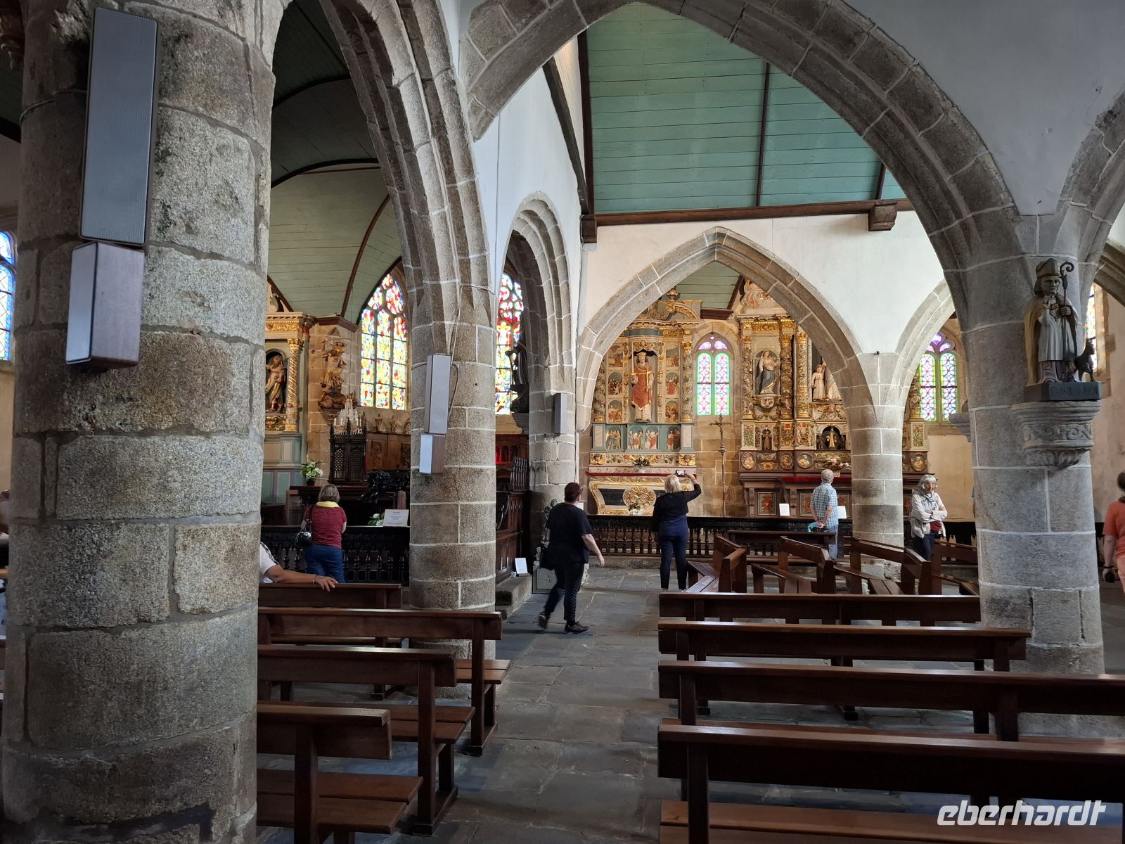 Danach führte uns der Weg vorbei an der Westküste mit einem Fotostopp an der „Baie des Trepasseés“ mit ihrem Sandstrand. Einen weiteren Stopp gab es an der ausbreitet. Einen weiteren Fotostopp gab es an der Kirche Notre Dame in Confort-Meilars und ihrem Kalvarienberg ein, der aber nicht so reich verziert war wie in Guimiliau. Dafür gab es in der Kirche selbst weine Besonderheit: ein „Wundertätiges Glockenrad“ der Madonna.