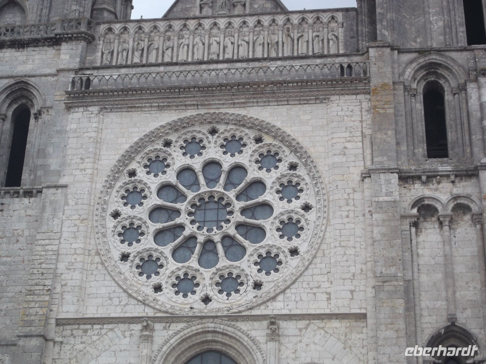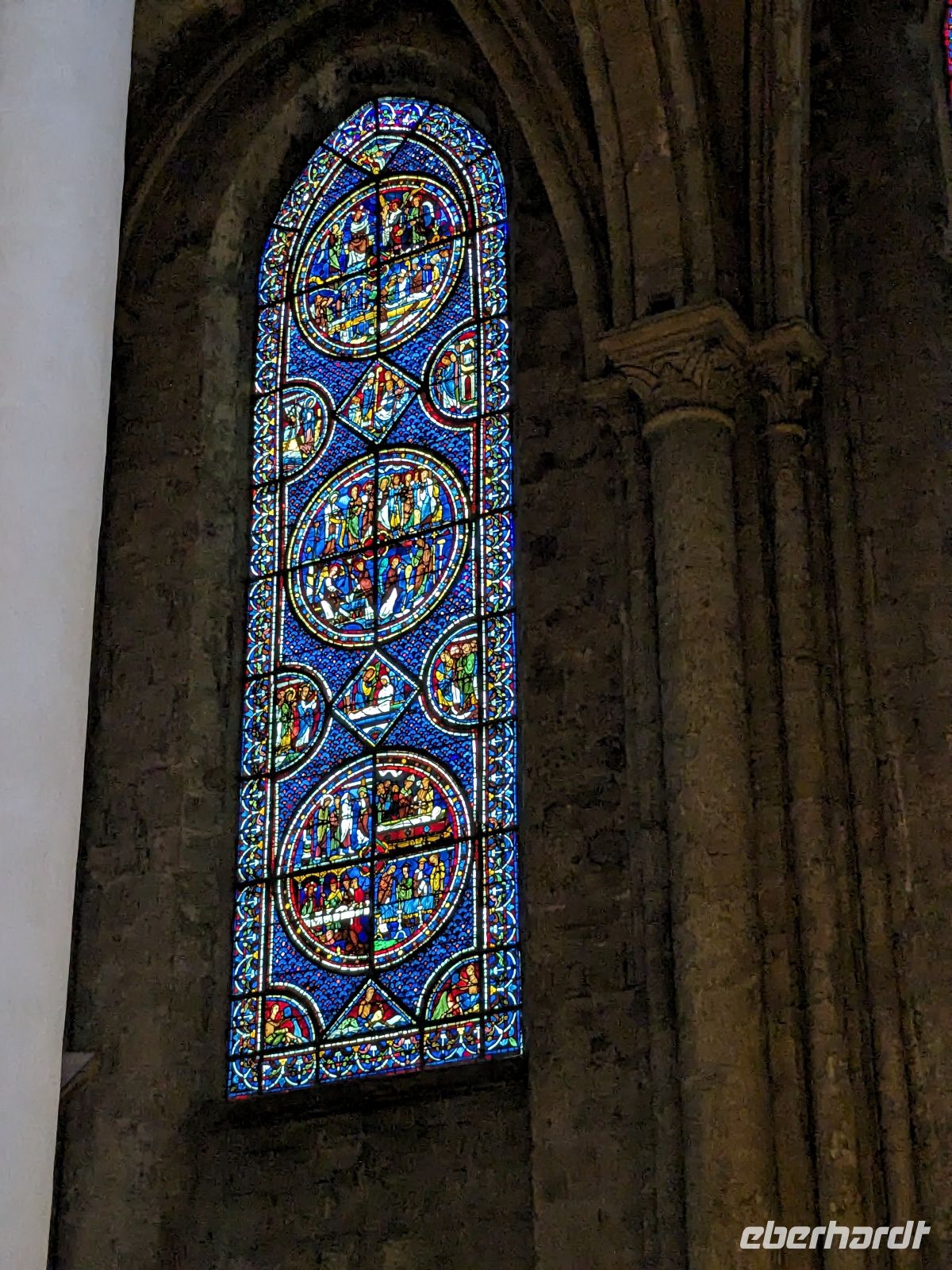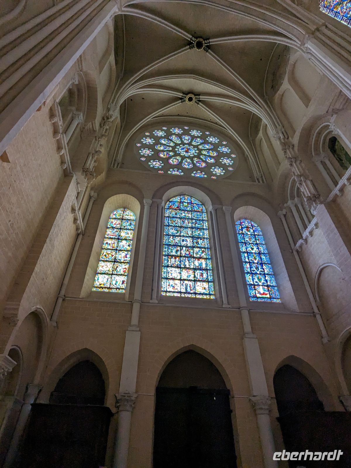 Dann führte unsere Fahrt zum letzten Höhepunkt unserer Reise, In Chartres befindet sich eine der berühmtesten gotischen Kathedralen der Christenheit, die schon seit 1979 auf der Liste des UNESCO-Weltkulturerbes steht. Nach mehreren Brandereignissen wurde auf den spätromanischen Resten seit 1194 eine gotische Marienkirche errichtet, die schon nach erstaunlich kurzer Bauzeit 1260 vollendet war. Die unterschiedlichen Bauphasen lassen sich noch an der Verschiedenheit der zwei Flankierungstürme der viel fotografierten westlichen Eingangsfassade ablesen. Neben einer herrlichen Fensterrose sind vor allem die Eingänge – das reichverzierte sogenannte „Königsportal“ besonders. Die Innenansichten in der Kathedrale sprechen für sich – das „Blau von Chartres“ in den mittelalterlichen Glasfenstern ist weltberühmt und auch die Raumwirkung des Gotteshauses atemberaubend. Für Eingeweihte ist zwischen den Stuhlreihen das in den Fußboden eingearbeitete „Labyrinth von Charters“ zu sehen, das jährlich am Johannistag in einem besonderen Ritual des Abschreitens Sündenerlass gewähren soll.