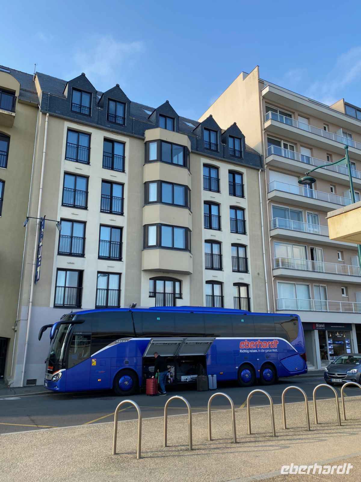 Unser Rundgang endet am Hotel. Dort erwartet uns bereits Evgenij mit unserem Reisegepäck, und das Hotel mit einem bretonischen Begrüßungstrunk. Es gibt Cidre, der hier traditionell aus Keramiktassen getrunken wird.