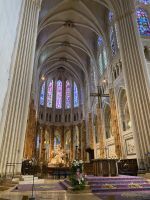 Auf der Autobahn geht es dann zügig weiter Richtung Osten. Am Nachmittag erreichen wir die Stadt Chartres. Hier schließt sich ein Themenkreis: Unsere Reise begann mit der Besichtigung der Kathedrale von Metz, und nun stehen wir in einer anderen der bedeutendsten französischen Domkirchen. Die Glasfenster tauchen den Raum in magisches Licht. Das berühmte Chartres-Blau trägt einen gewaltigen Teil dazu bei, und wir erfahren, dass das Geheimnis dieser Farbe seinen Ursprung im Erzgebirge hat. Von dort importierte man schon vor Jahrhunderten den Grundstoff Kobalt.