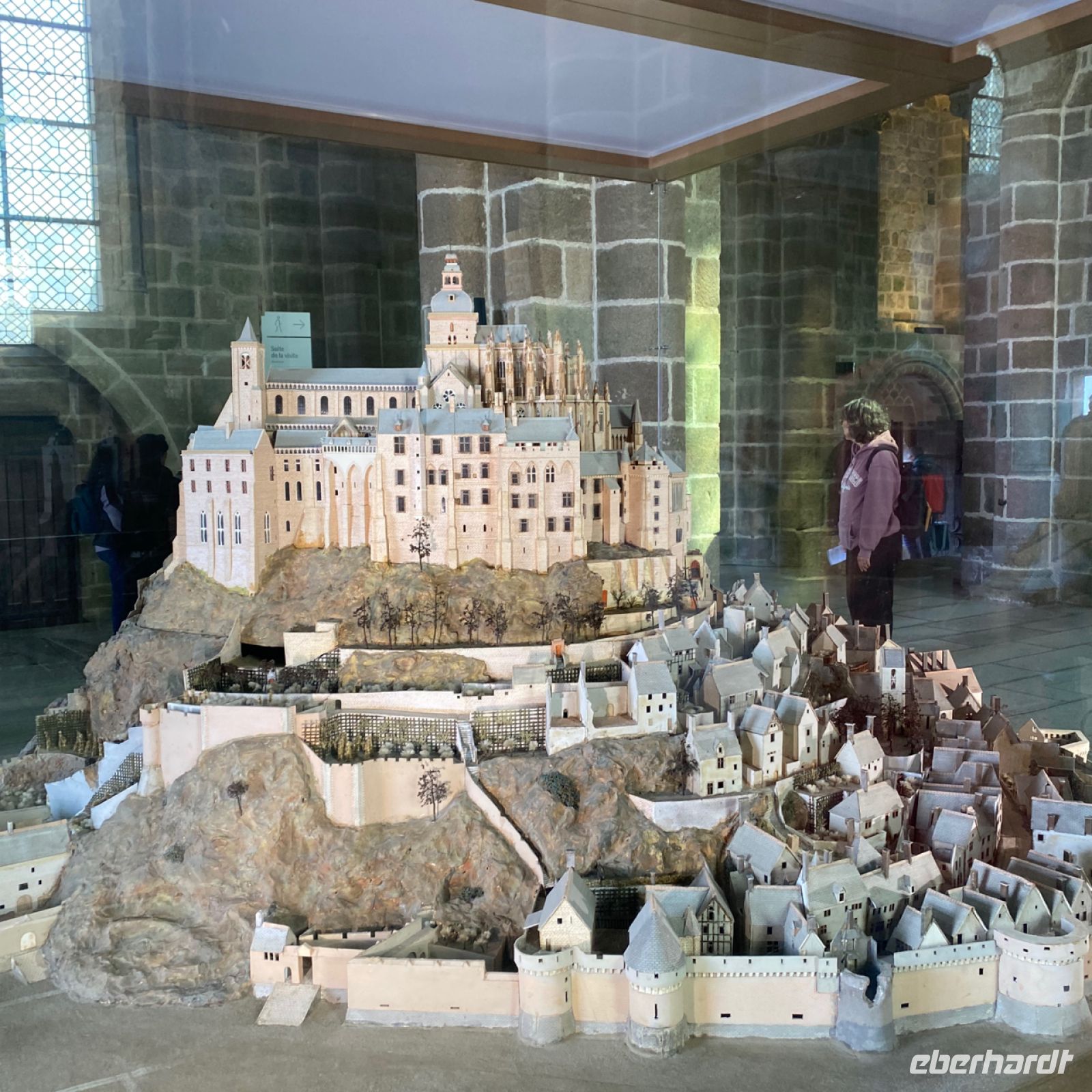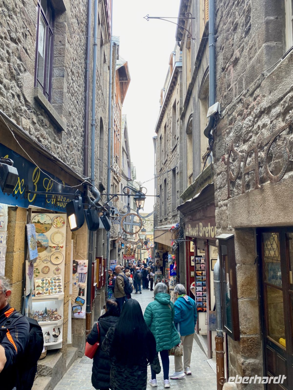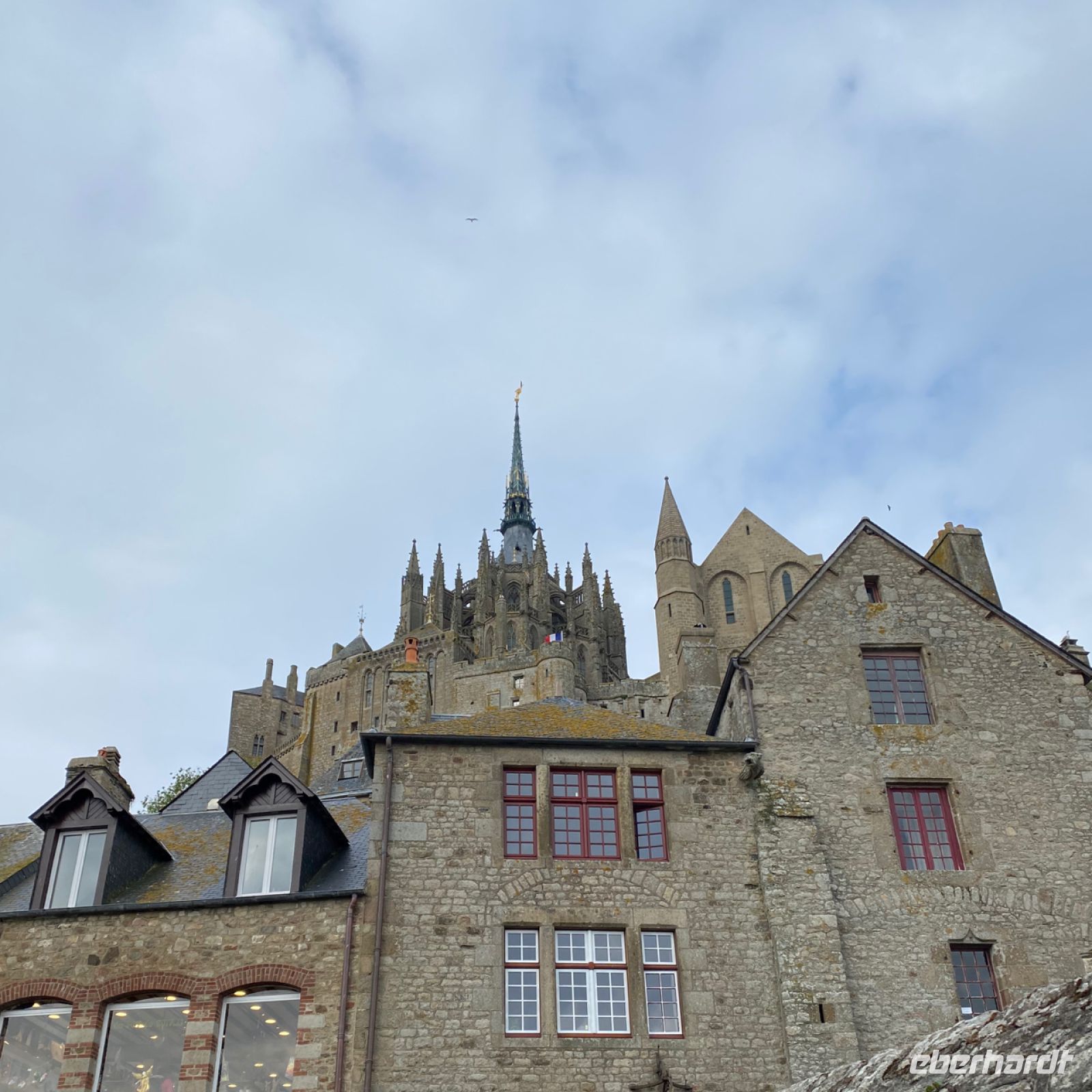 Wir lassen unseren Bus am Festland zurück und werden mit futuristisch anmutenden Shuttle-Bussen über den Damm und eine filigrane Brücke auf die Felseninsel Mont-Saint-Michel, zum Berg des heiligen Michael, gefahren. Im Mittelalter entstand hier eine dem Erzengel gewidmete Abtei, die immer weiter wuchs, zu einer bedeutenden befestigten Anlage inmitten eines kleinen Städtchens. Über die befestigten Mauern geht es bequem, aber teilweise steil nach oben.
