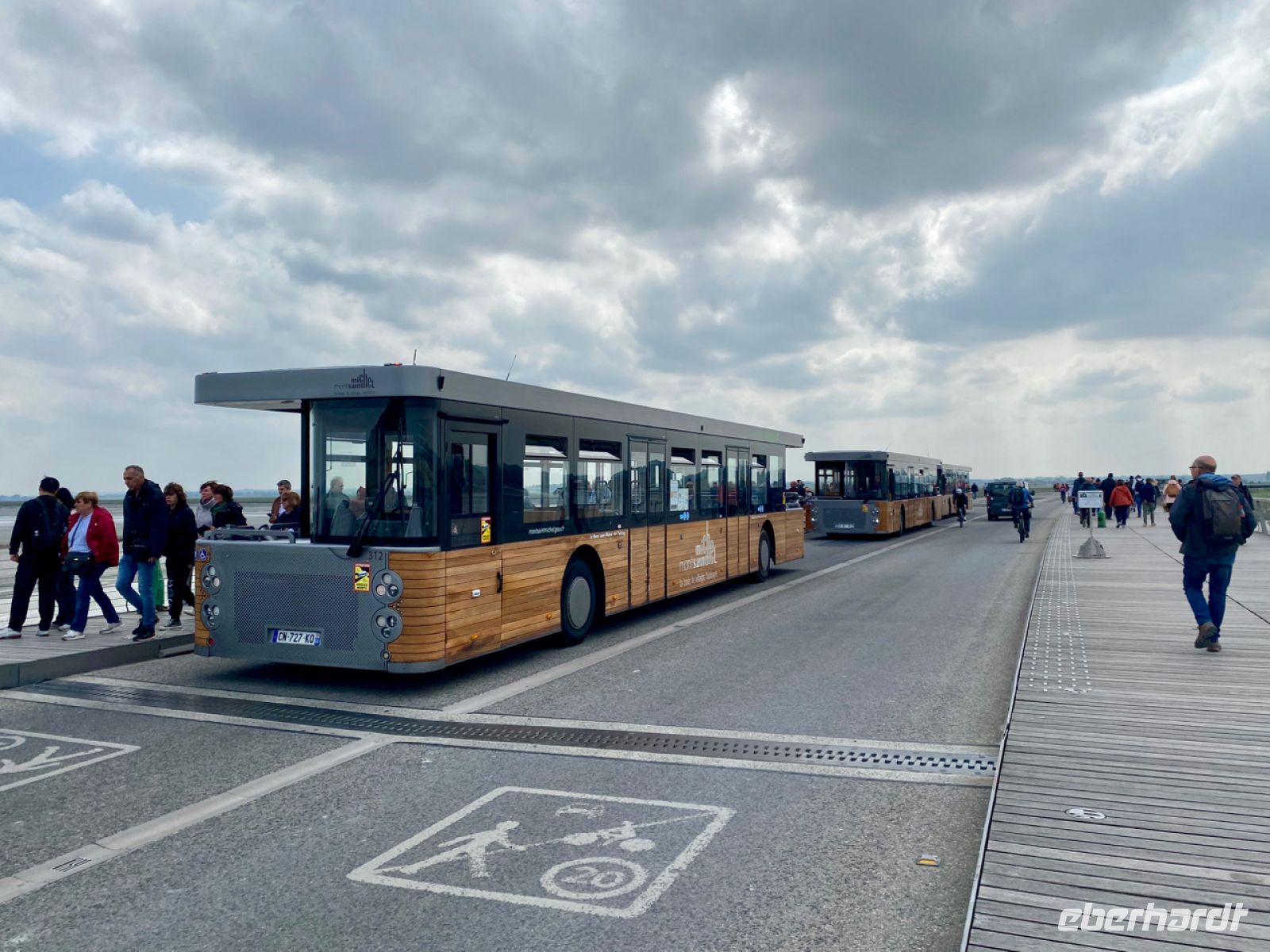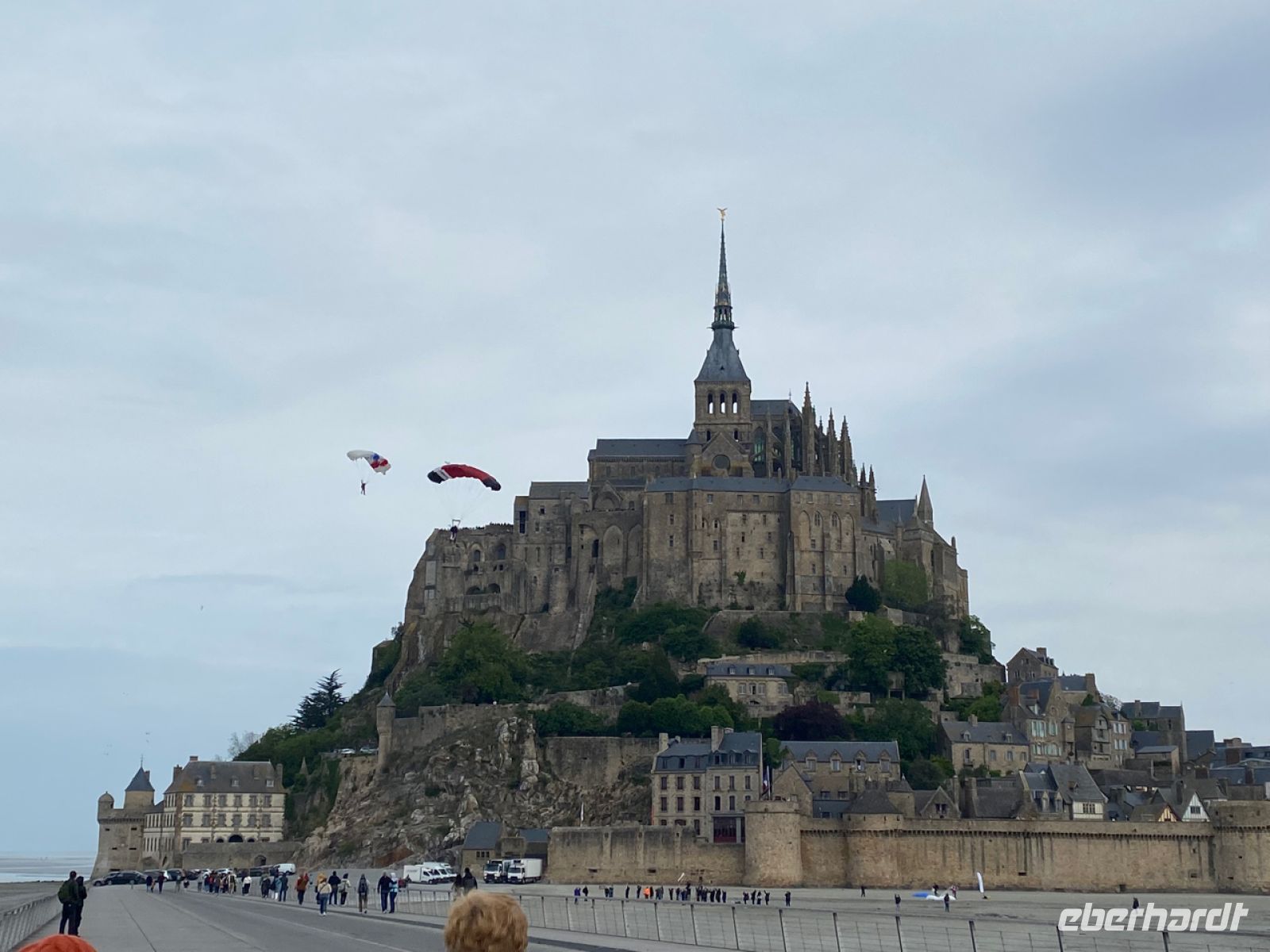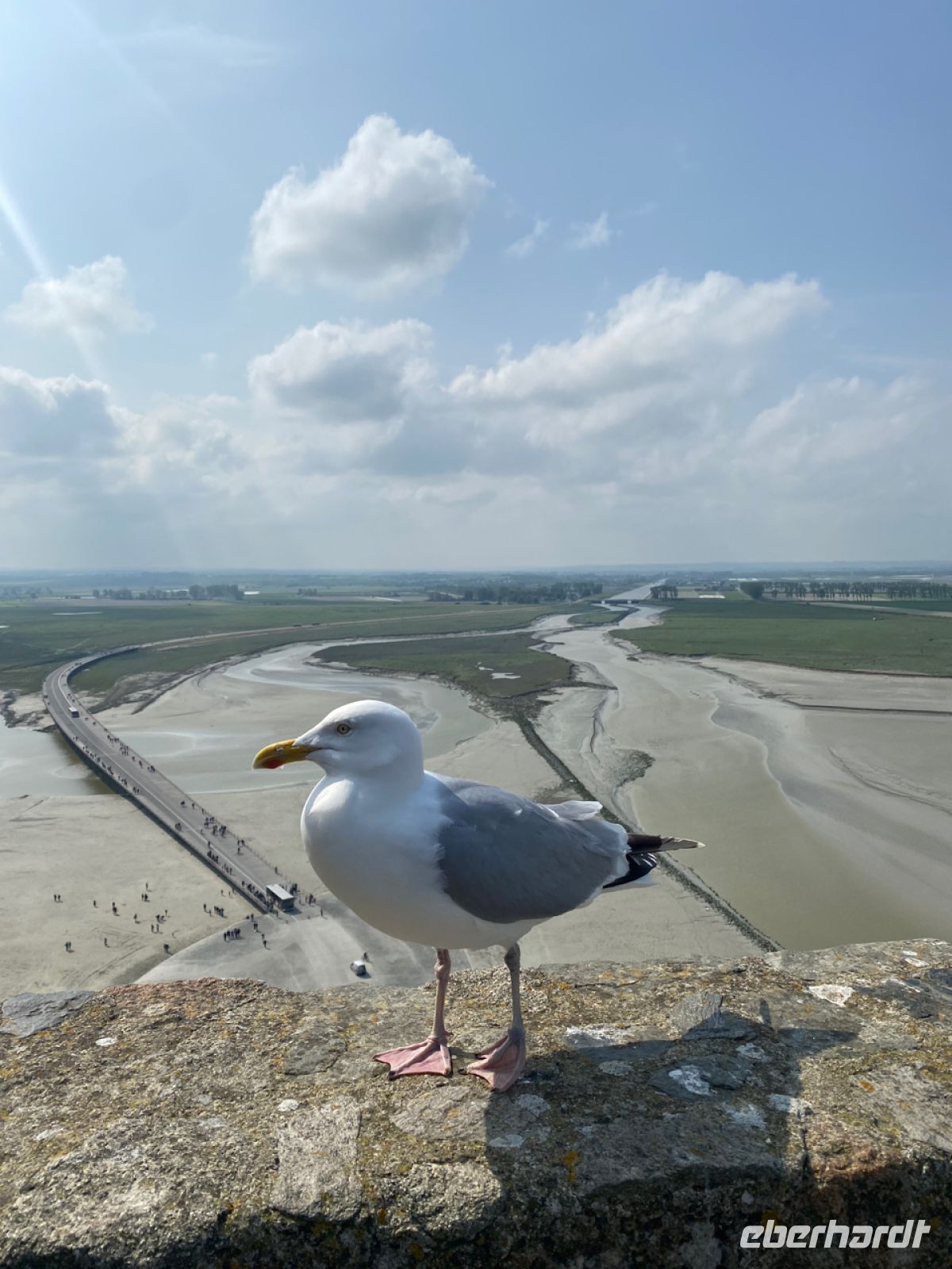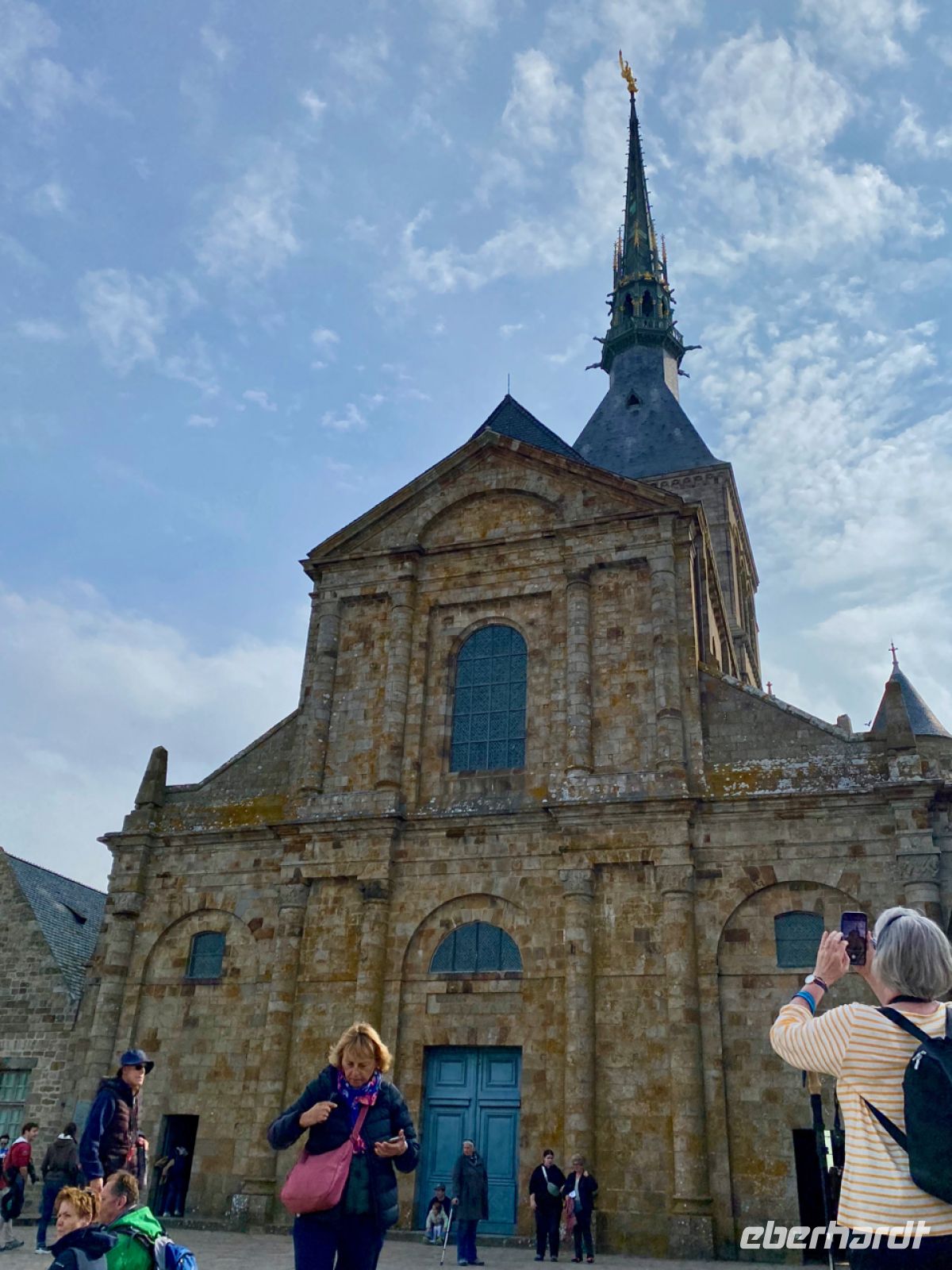Wir lassen unseren Bus am Festland zurück und werden mit futuristisch anmutenden Shuttle-Bussen über den Damm und eine filigrane Brücke auf die Felseninsel Mont-Saint-Michel, zum Berg des heiligen Michael, gefahren. Im Mittelalter entstand hier eine dem Erzengel gewidmete Abtei, die immer weiter wuchs, zu einer bedeutenden befestigten Anlage inmitten eines kleinen Städtchens. Über die befestigten Mauern geht es bequem, aber teilweise steil nach oben.