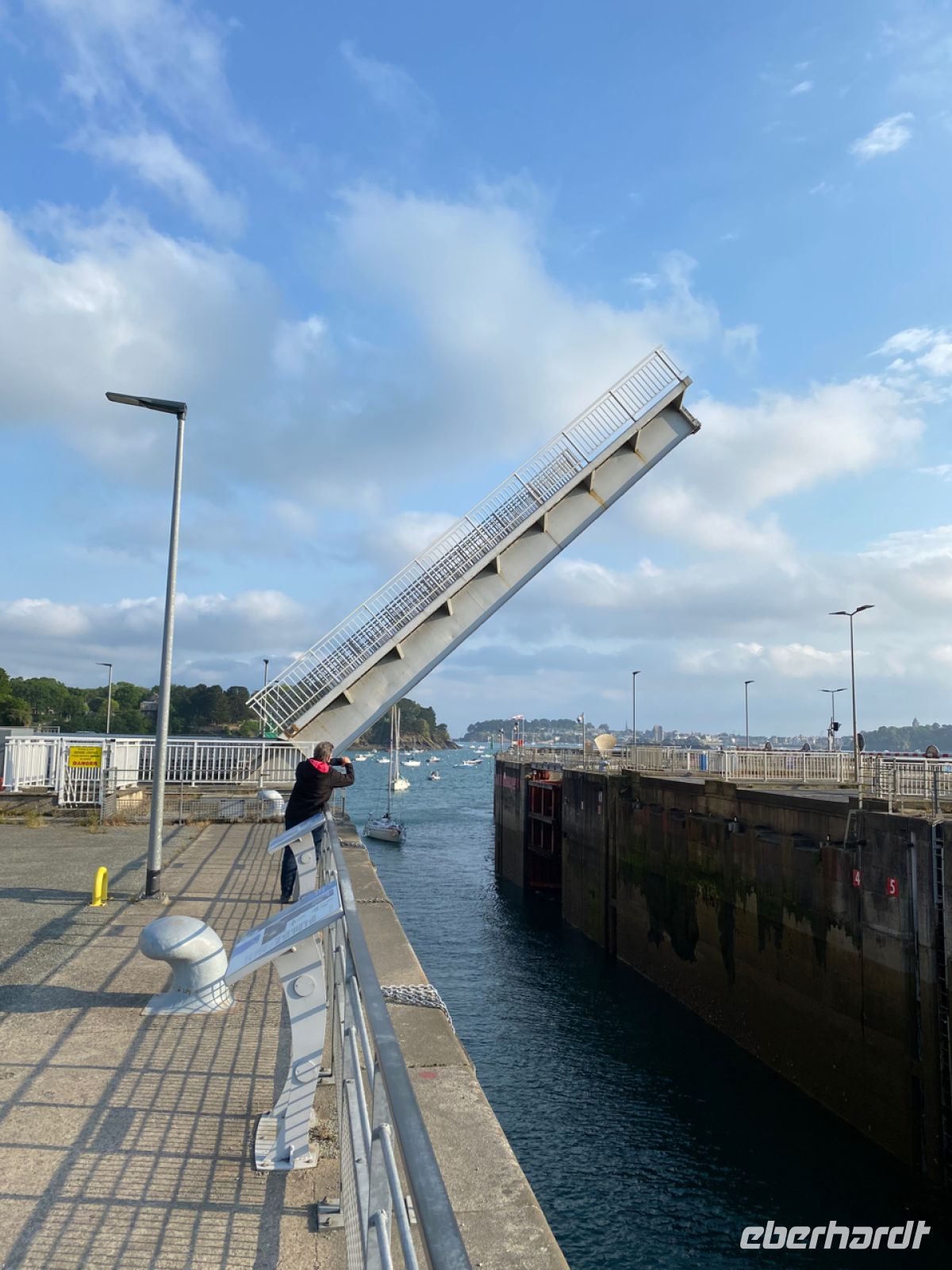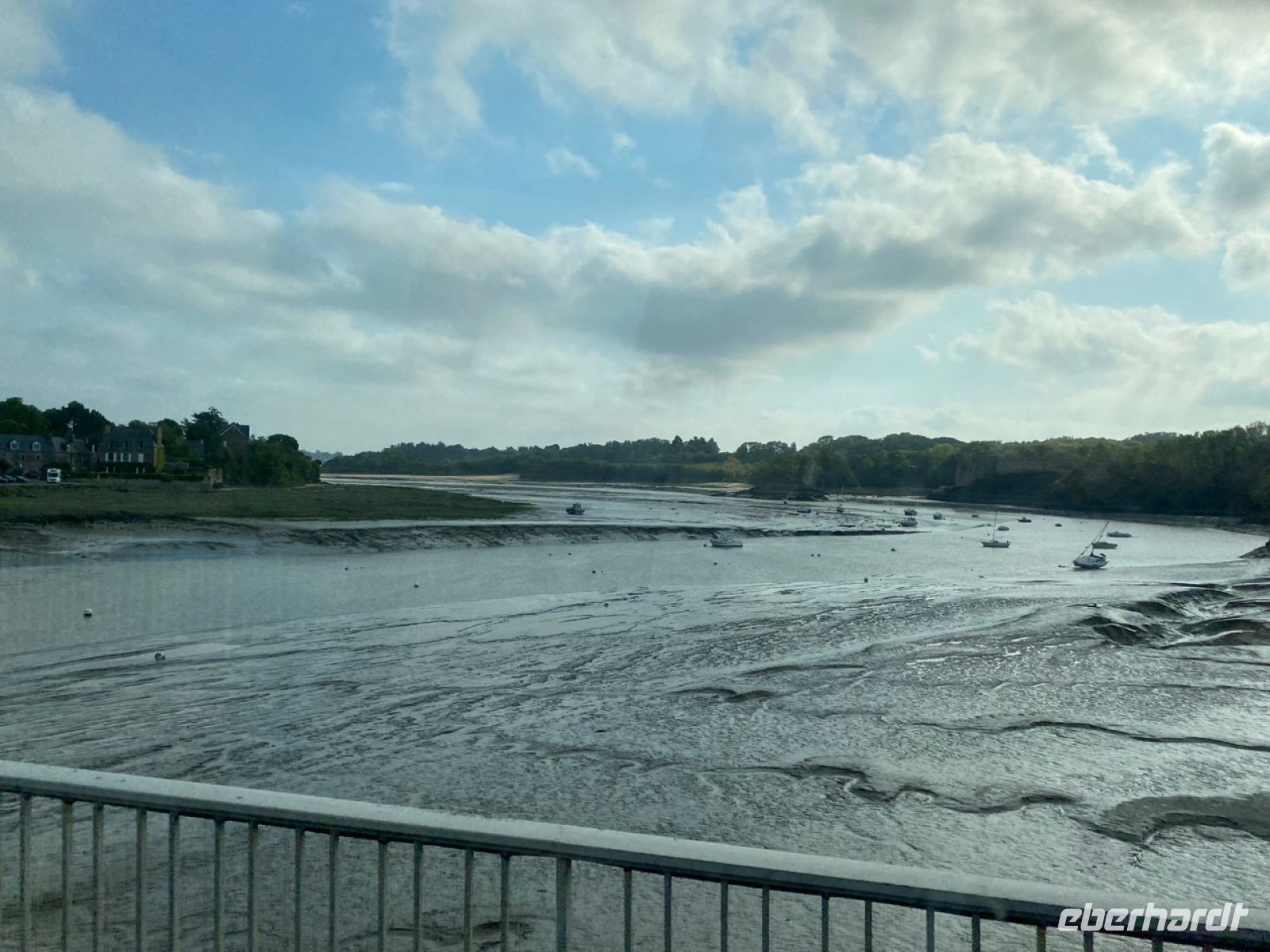 Wir lassen heute Morgen Saint-Malo hinter uns und fahren nach Westen. Am Fluss Rance halten wir dort; dort sehen wir das Gezeitenkraftwerk, das schon seit 60 Jahren Strom für Hunderttausende Menschen produziert. Der gewaltige Tidenhub in der Gegend lässt den Fluss mit großer Kraft abwechselnd in zwei Richtungen fließen.