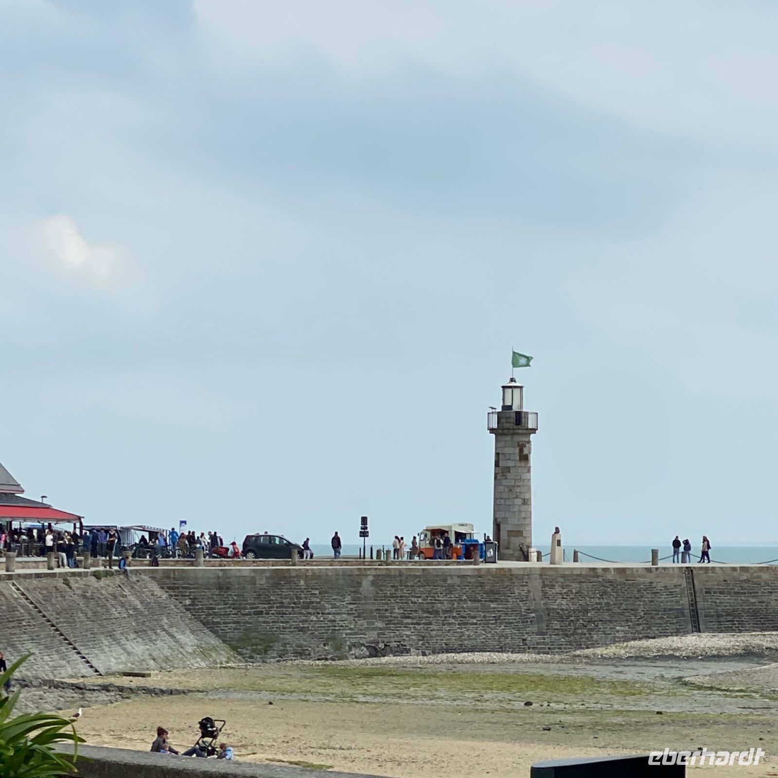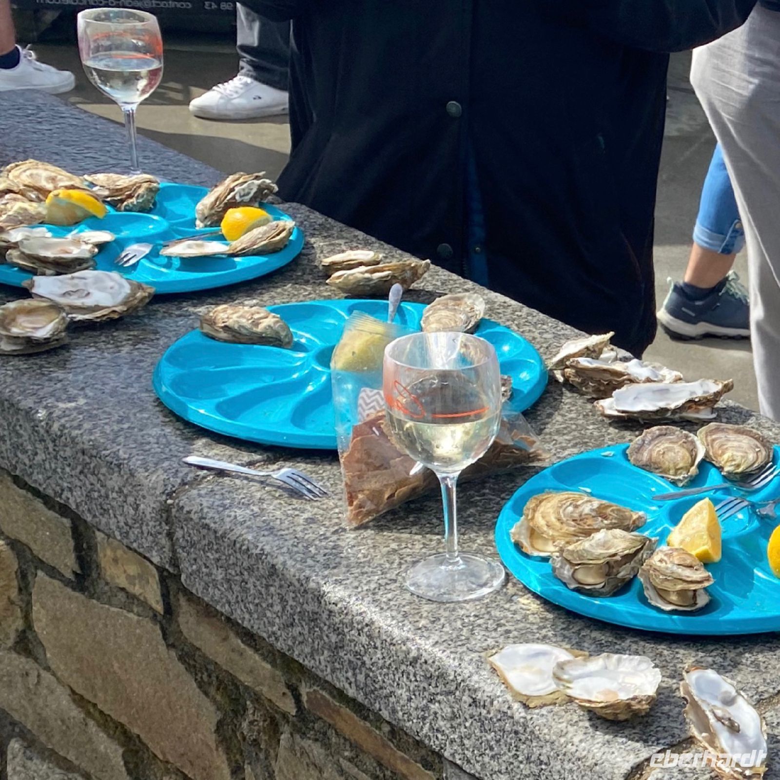 Hier werden seit Jahrhunderten Austern gezüchtet. Es ist gerade Ebbe, so können wir die Austernbänke vor dem Ort gut sehen. Alles wird hier mit großem Aufwand betrieben. Die Arbeit ist sehr intensiv. Kein Wunder, dass Austern exklusiv und teuer sind. Umso besonderer ist das Erlebnis, sie hier frischer als irgendwo anders möglich, direkt am Austernmarkt am Strand zu verkosten. Im Schatten des malerischen Leuchtturms werden wir von einem freundlichen Franzosen namens Pierre mit köstlich kühlem Weißwein dazu versorgt. Santé!