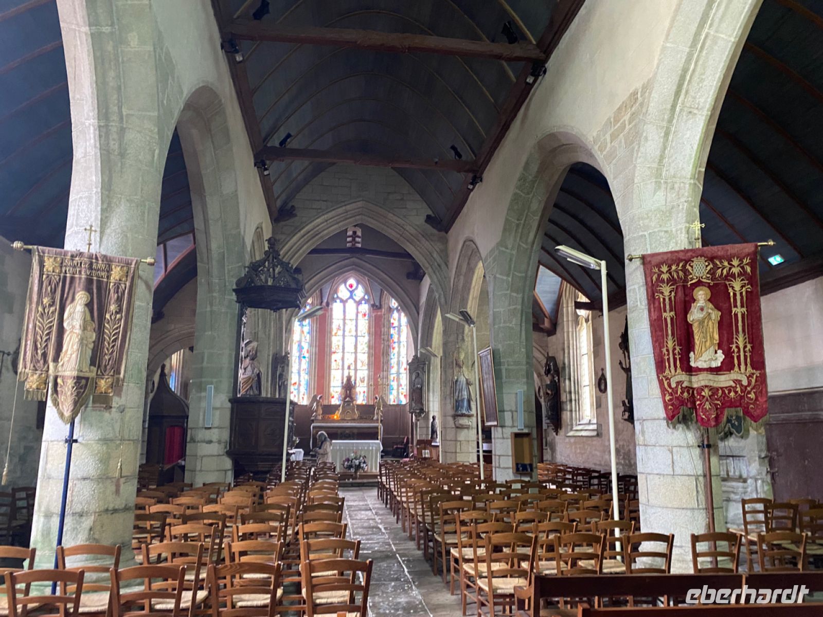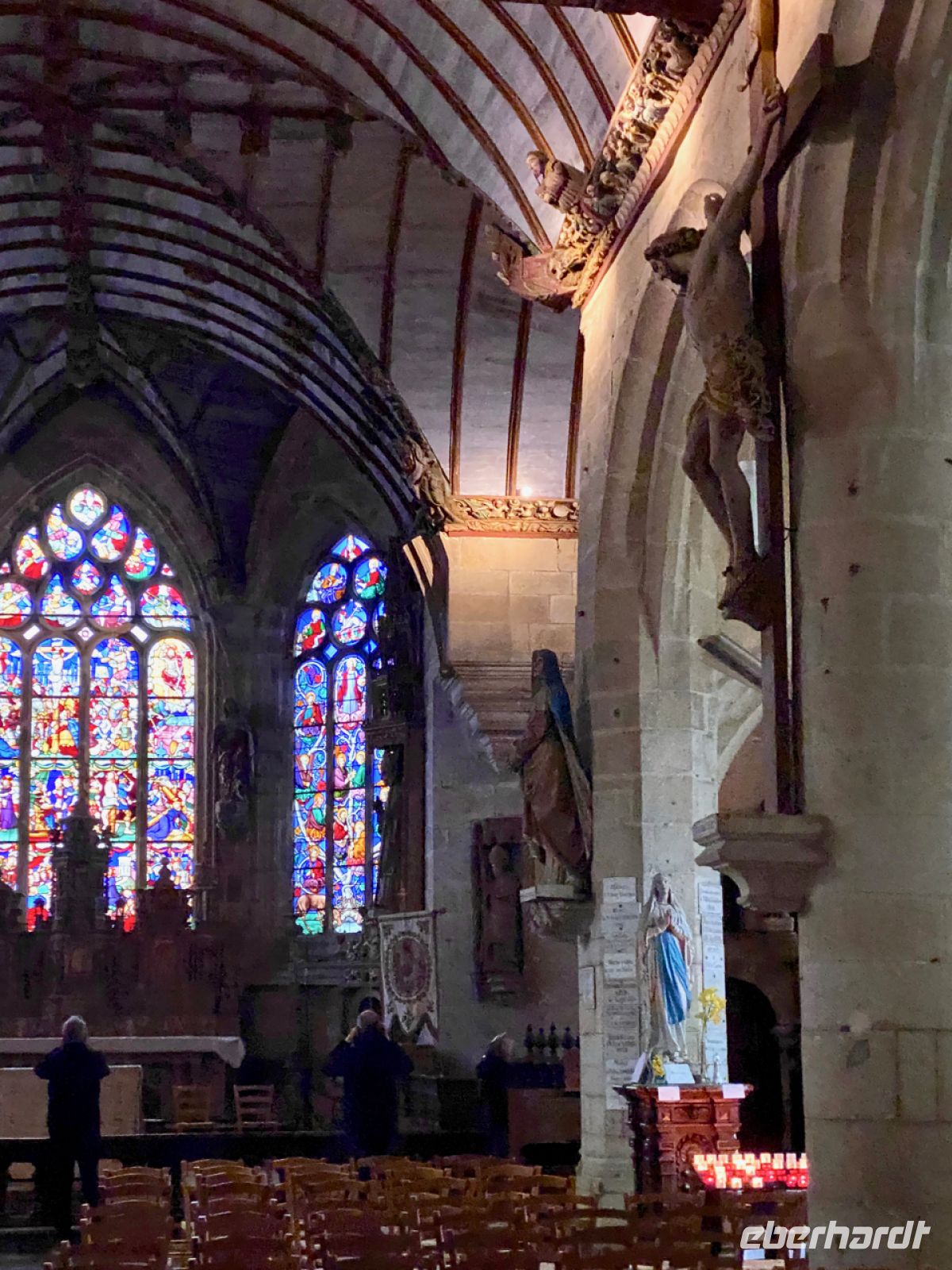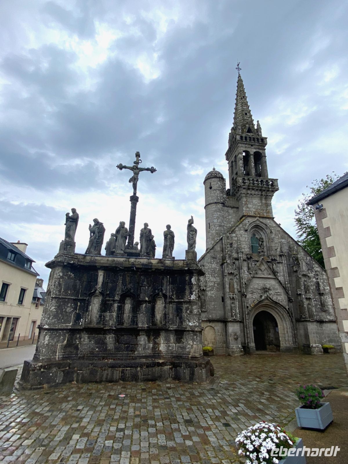 Für uns ist das kein Problem, unsere Unterkunft ist gesichert. In der Stadt Quimper wartet unser nächstes Hotel auf uns. Auf dem Weg dorthin lernen wir nun eine der faszinierendsten Seiten der Bretagne kennen: Die Welt der alten Kirchen mit ihren prunkvollen Ausstattungen ist einzigartig. Zur Zeit der Gegenreformation hat man alles aufgefahren, was die bretonische Handwerkskunst ihrer Zeit zu bieten hatte; der Reichtum der Segeltuchmacher aus der Gegend machte es möglich.
