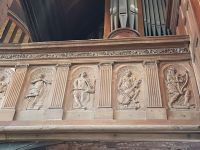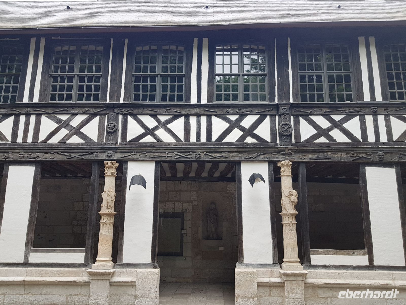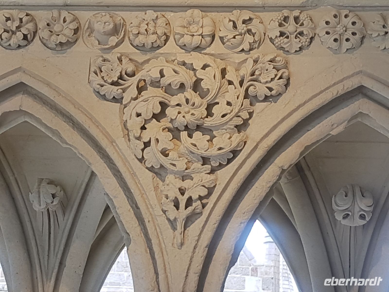 Dann ging es über den aus dem 17. Jahrhundert stammenden Place St. Sauveur zum Hotel d'Escorville, das ein Beispiel für die wunderschöne Architektur der Frührenaissance in Caen vor der Kriegszerstörung gibt, zur Kirche St. Pierre. Ihre Bauzeit erstreckt sich zwischen dem 13. und dem 16. Jahrhundert, wobei das von Hector Solier geschaffen Gewölbe 1518-1548 datiert ist. Dieses geniale Gewölbe erinnert an die zur selben Zeit erbauten Loireschlösser, wie z. B. an das berühmte Schloss Chambord.