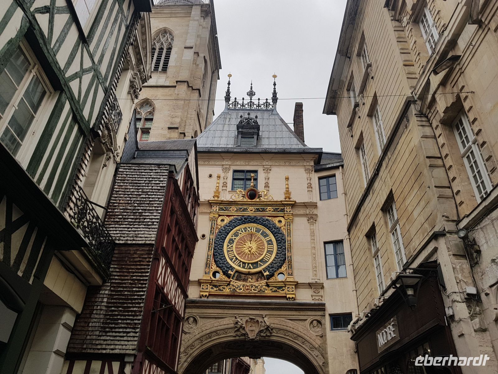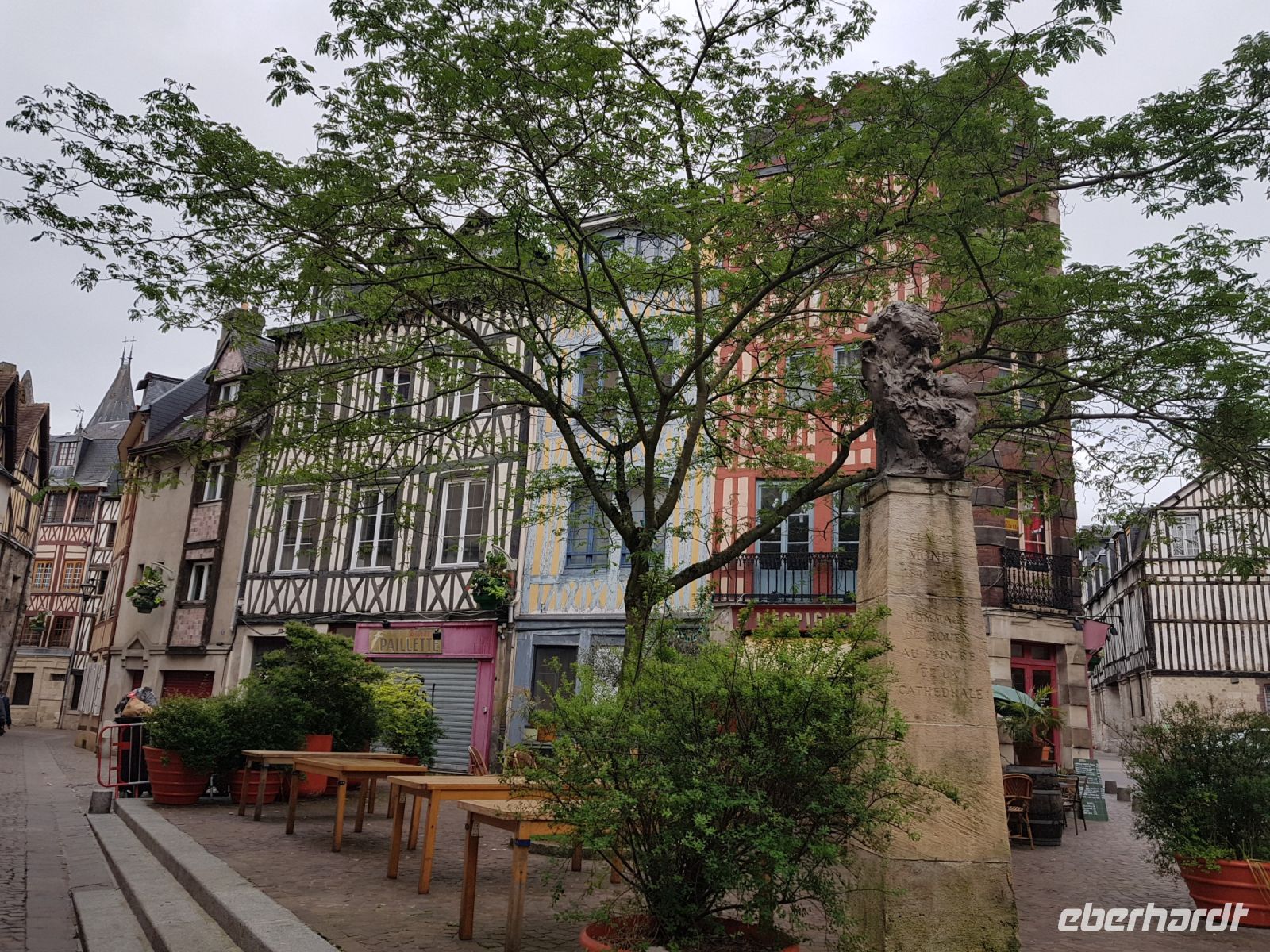 Nach dem Frühstück in der Bar im 8. Stock unseres Hotels, wo wir über die Dächer von Paris blickten, begannen unsere Rundreise. Wir luden die Koffer in unseren Reisebus, der uns in den folgenden vier Tagen zur Verfügung stehen sollte. Mit einem örtlichen Reiseleiter ging es dann in die historische Hauptstadt der Normandie, nach Rouen. Hier führte er uns zur Kathedrale von Rouen, Krönungsort und Grablege der Herzöge der Normandie, zum alten Pestfriedhof, dem Aitre St. Maclou, zur ehemaligen Abteikirche Saint-Ouen sowie durch die malerischen Fachwerkgassen der Altstadt zum Justitzpalast mit seiner filigran gestalteten Fassade, zur Großen Uhr bis zum Alten Mark, wo das ein Kreuz und die von Louis Arretche entworfene Kirche an den grausamen Tod von Jeanne d'Arc erinnerte. Dort verabschiedeten wir uns von unserem örtlichen Reiseleiter und setzten wenig später unsere Reise durch die Normandie fort.
