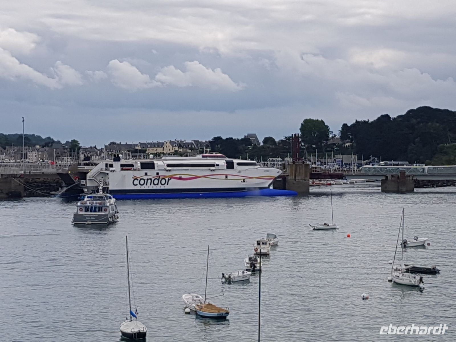Hier checkten wir zur Überfahrt nach Saint-Malo ein und gaben unsere Koffer auf. Unsere Überfahrt fand zum Glück wieder mit einer kleinen, schnellen Fähre statt, auf der einige Teilnehmer aus unserer Reisegruppe das Angebot der Bar zu einem Abendessen nutzten.