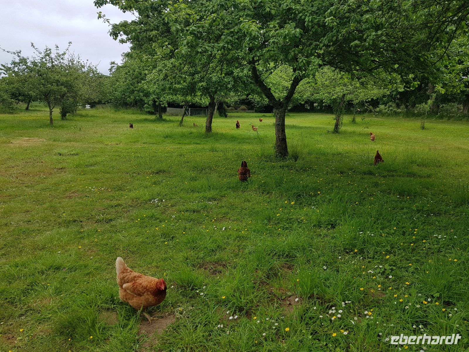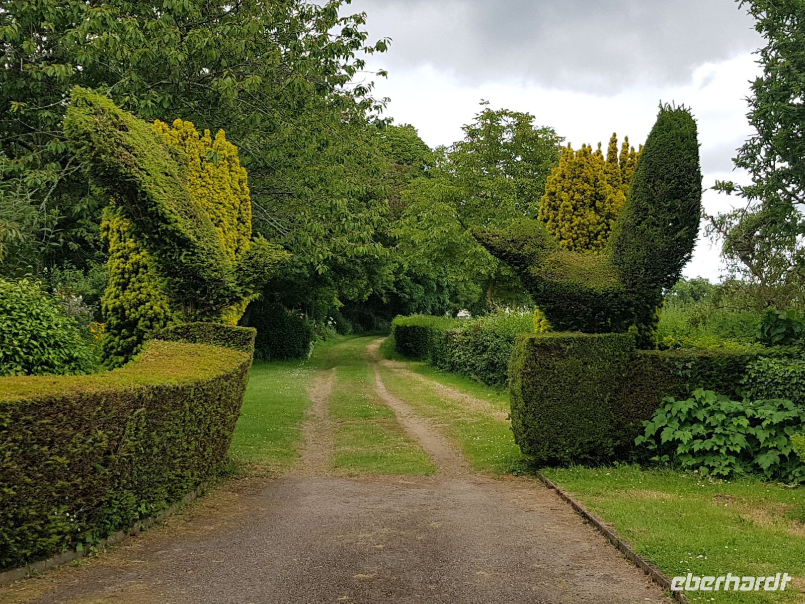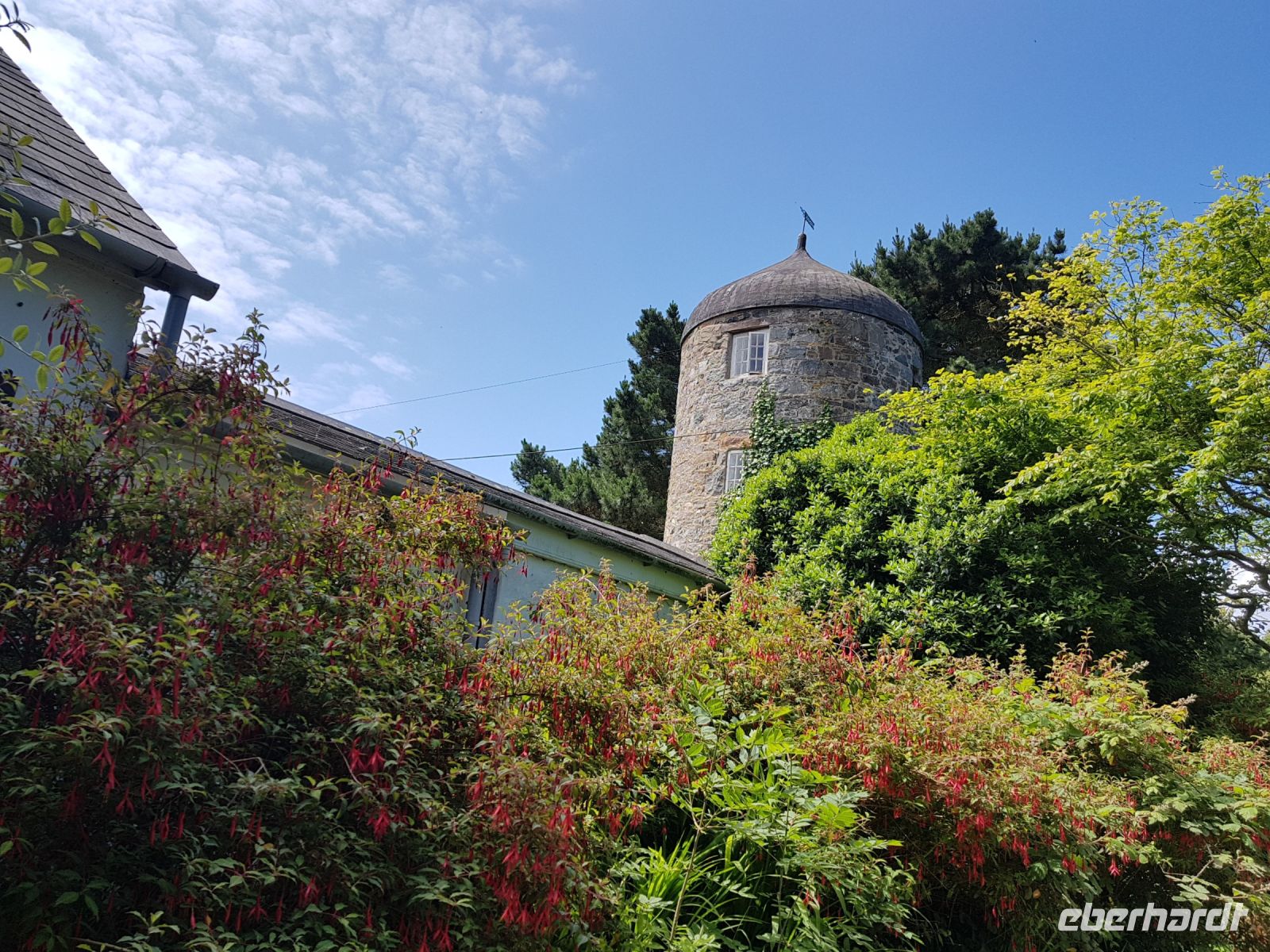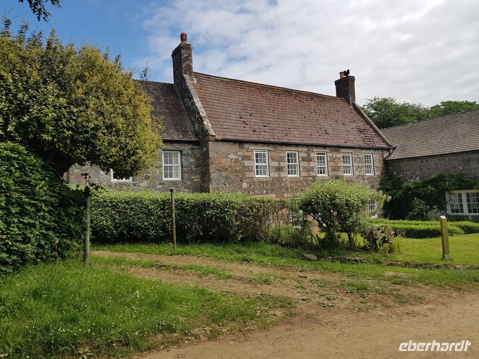 Im zweiten Garten, den wir besuchten, war die Eigentümerin und Bewohnerin des dazugehörigen Hauses, eine Künstlerin, zunächst weder zu Hause noch telefonisch erreichbar. Unsere örtliche Führerin zeigte uns daher zunächst die Außenanlagen um das Wohnhaus, das das älteste heute noch bewohnte Wohnhaus auf Jersey war. Wir sahen den Swimmingpool, das von der Form der Palette der Malerin inspirierte Labyrinth sowie die Wiesen und Weiden um das Haus herum. Als die Künstlerin später eintraf, erzählte Sie uns, das ihre letzten Arbeiten stark von der Szenerie, die der Sturm in ihrem Garten geschaffen hat, inspiriert wurden, indem sie dort ganz neue Motive fand.
