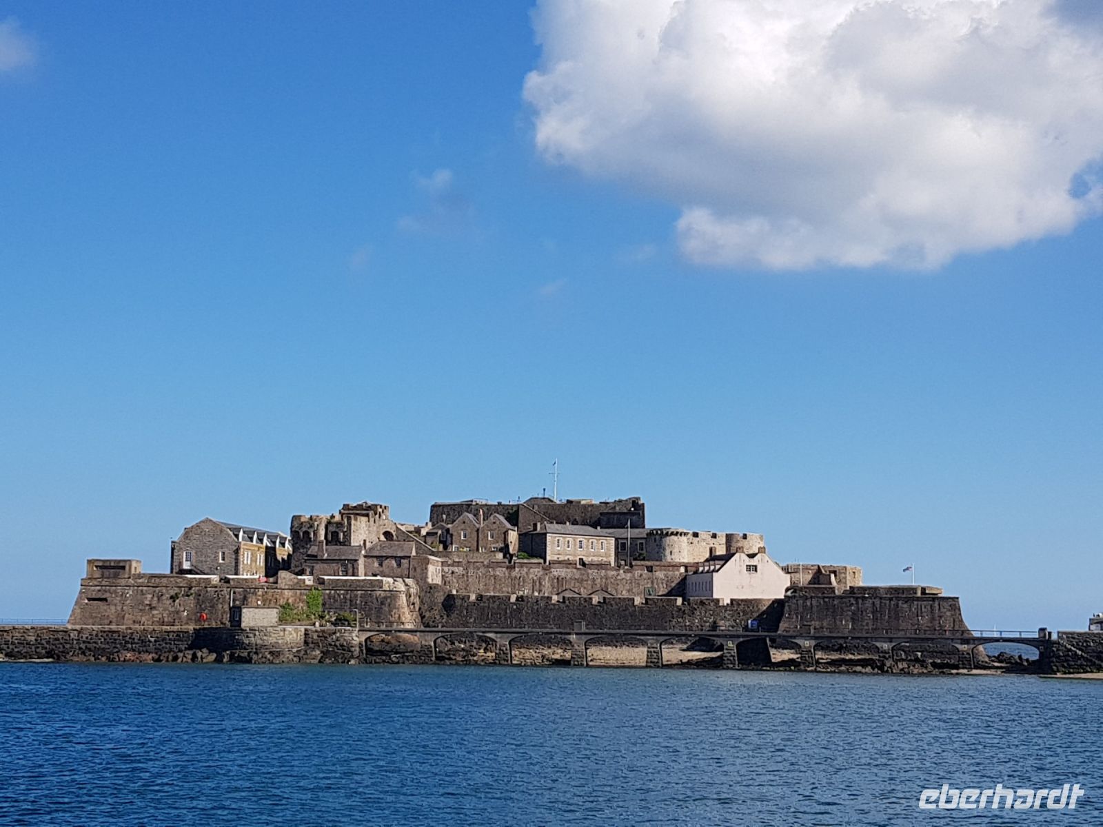 Nachdem unsere Fähre abgelegt hatte, bot sich uns ein phantastisches Bild der zahlreichen, mit Forts besetzten Inseln vor der Küste von San Malo, die die Sicherheit der Korsarenstadt jahrhundertelang garantiert haben. Nach einer guten Stunde legte die Fähre im Hafen von St. Helier auf Jersey an, wo wir plötzlich alle aussteigen mussten. Es hieß vom Team der Fähre, dass unsere Koffer auf den Schiff bleiben und wir auch wieder auf dasselbe Schiff zurück kommen werden. Wir gingen zum Transitraum des Fährhafens von St. Helier und warteten dort, bis wir wieder zurück auf das Schiff gelassen wurden. Dann ging unsere Fährüberfahrt weiter, wo wir eine Stunde später im Fährhafen von St. Peter Port auf der Insel Guernsey eintrafen.