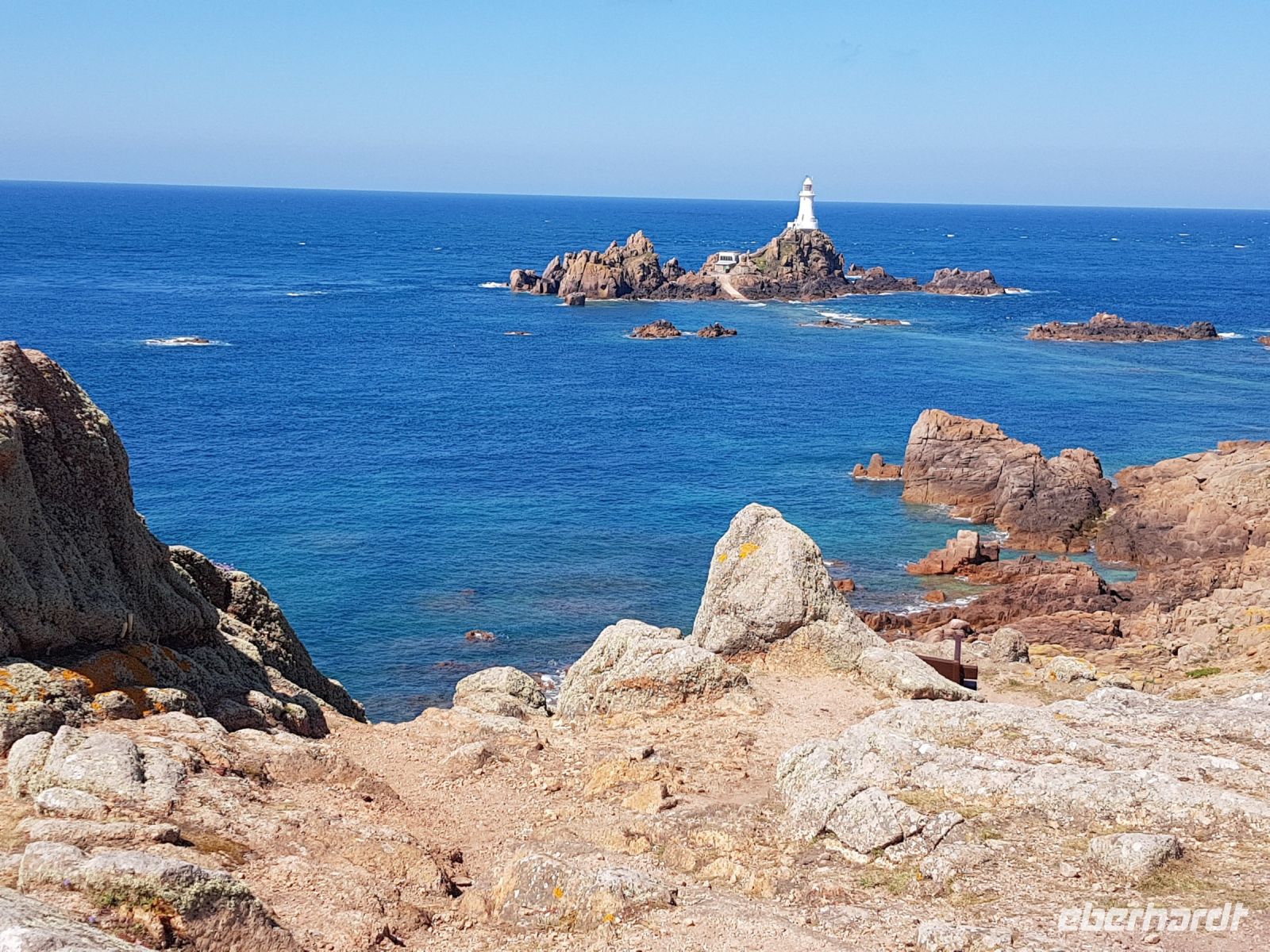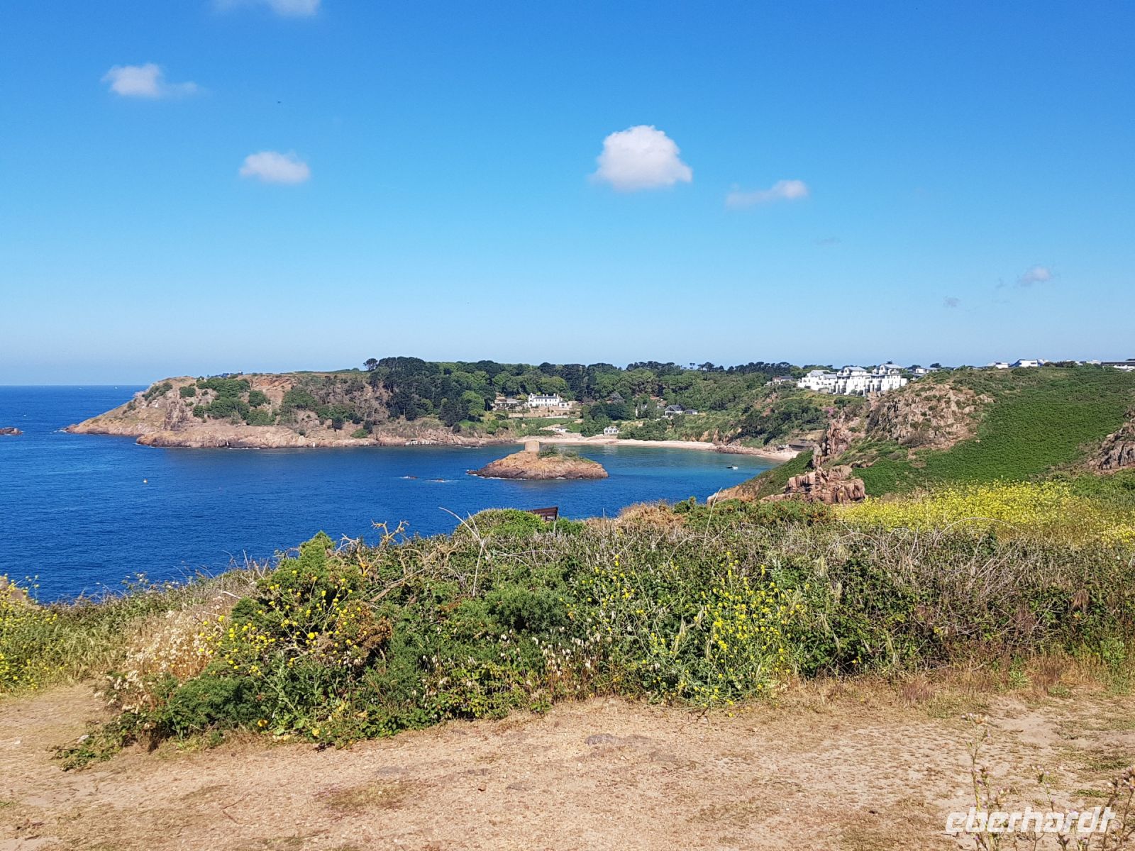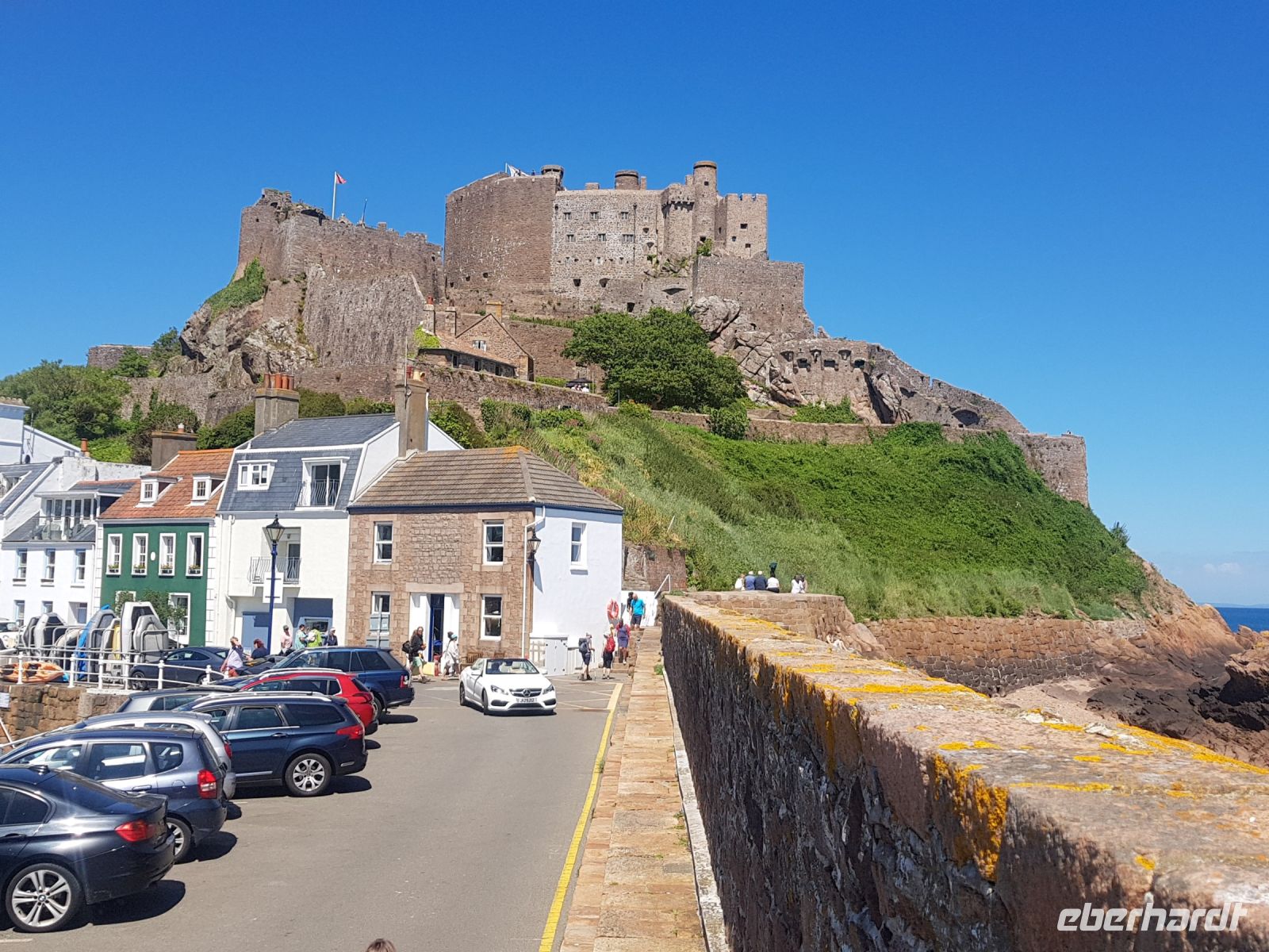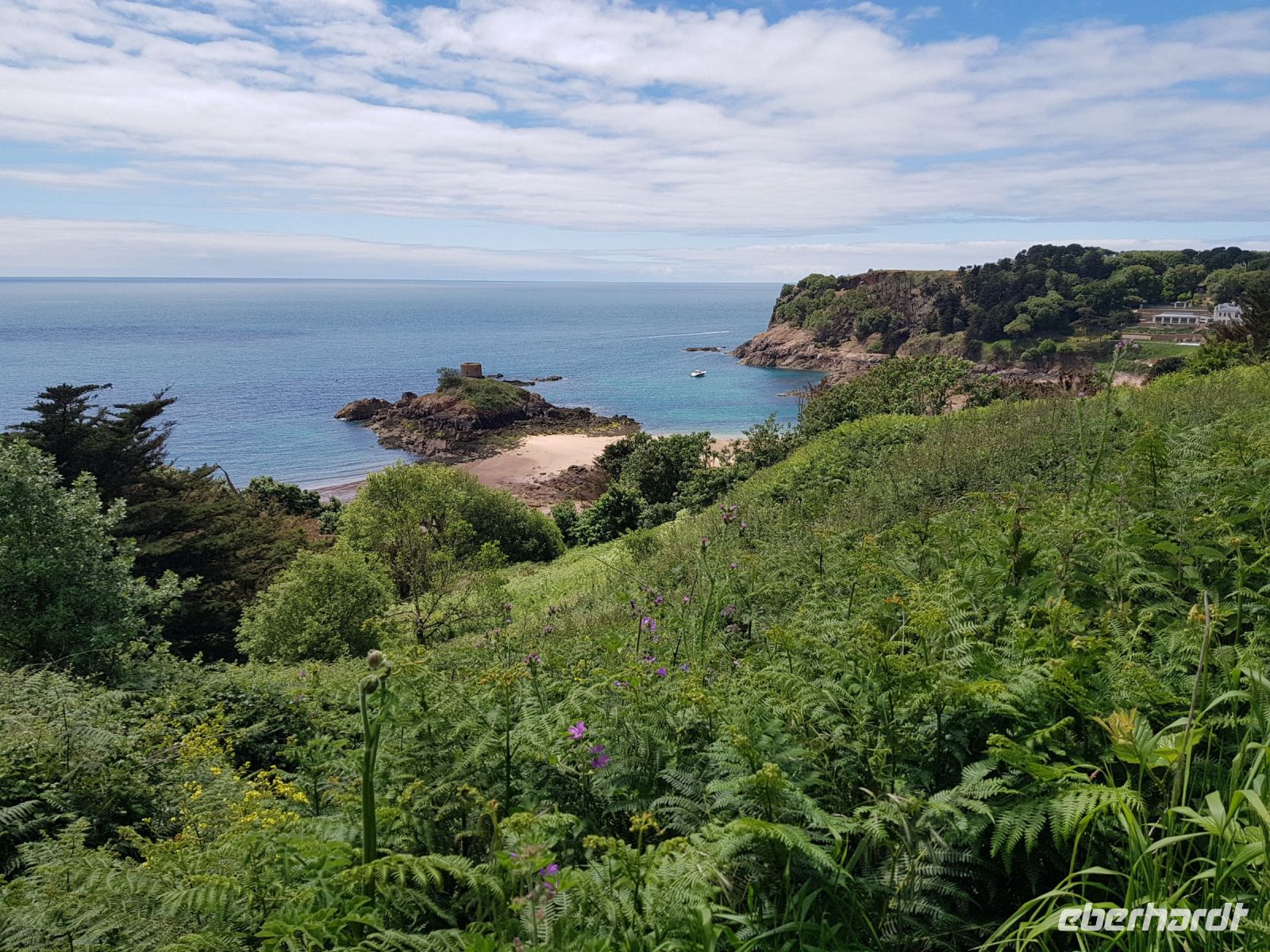 Nach der wunderschönen Tour am Vortag stiegen wir gespannt auf neue Eindrücke in unseren kleinen Reisebus. Heute stand eine Inselrundfahrt auf dem Programm. Wir fuhren an der St. Aubin's Bay entlang und erreichten den Noirmont Point oberhalb der Portelet Bay, wo wir am Vortag zum Mittagessen eingekehrt waren. Dann ging es an der Küste weiter zum Corbière Point, wo wir wieder einen Fotostopp einlegten. Von dort aus fuhren wir an der St. Ouens' Bay entlang zur Nordküste, wo wir über den langen Strand von Greve de Lecq staunten. Später kehrten wir hier im Restaurant „Fontaine Tavern“ zum Mittagessen ein. Verträumte Buchten, malerische Hafenstädte, Jahrhunderte alte Wachtürme und idyllische Wiesentäler beeindruckten uns am Nachmittag bei unserer Weiterfahrt entlang der Nordküste. An der Ostküste legten wir einen Stopp am Gory Castle ein. Hier unternahm unsere örtliche Führerin mit uns einen traumhaften Spaziergang, der am Gory Castle entlang hinunter zum Hafen von Gory führte. Dort hatten wir noch etwas Freizeit, in der einige Reiseteilnehmer aus unserer Gruppe in den Kaffees einkehrten, andere Fotos machen oder geruhsam die Atmosphäre in der nachmittäglichen Sonne an der mittelalterlichen Burg von Gory Castle auf sich wirken ließen. Unseren letzten Fotostopp legten wir in La Rocque Harbour ein, wo uns die Bucht bei Ebbe mit all ihren Felsen wie eine gigantische Mondlandschaft erschien.