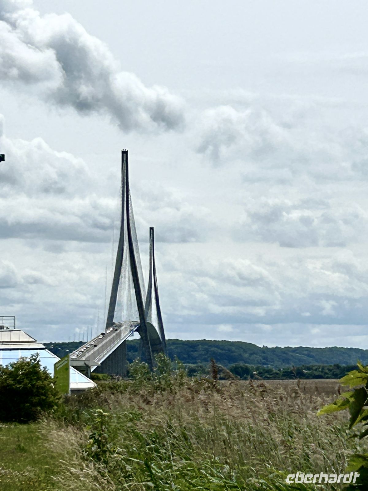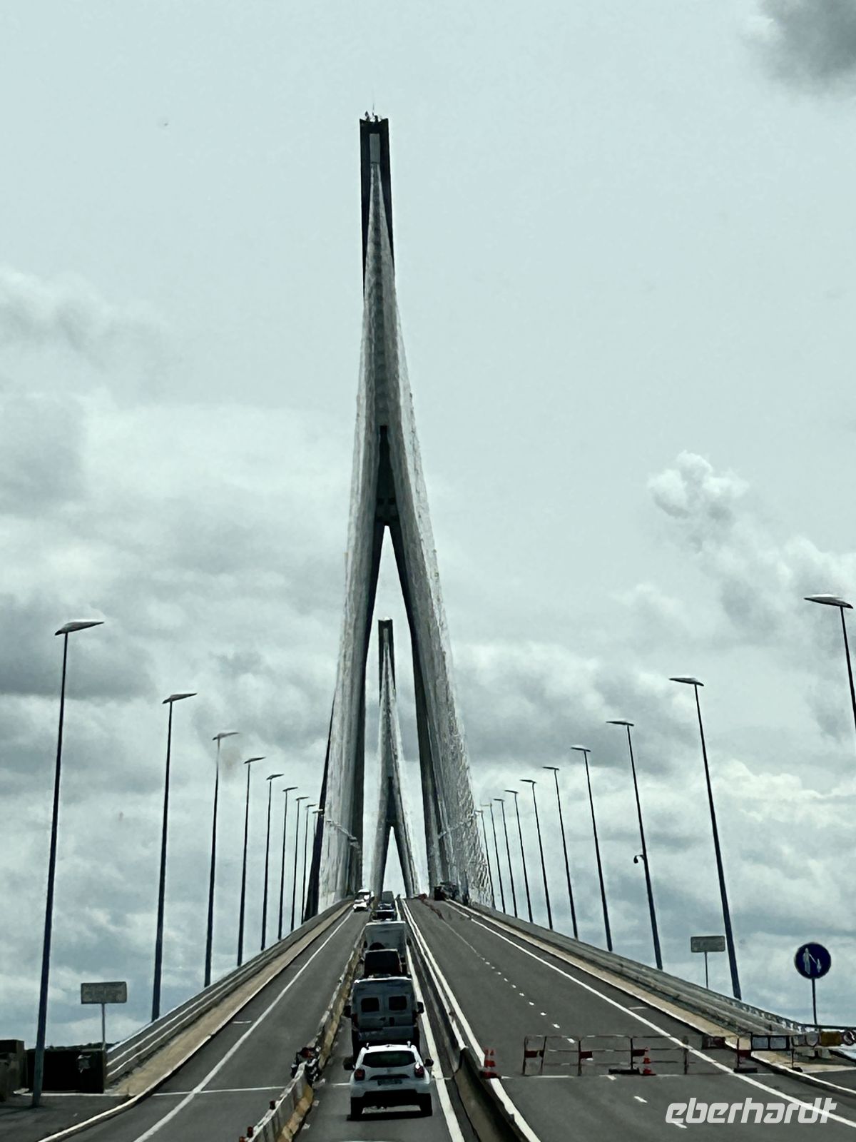 Erster Halt: die Pont de Normandie; das 1995 nach 7 Jahren Bauzeit in Betrieb genommene technische Meisterwerk war damals die höchste Schrägseilbrücke der Welt, mit 2141m Länge verbindet sie über die Seine hinweg die obere und untere Normandie;