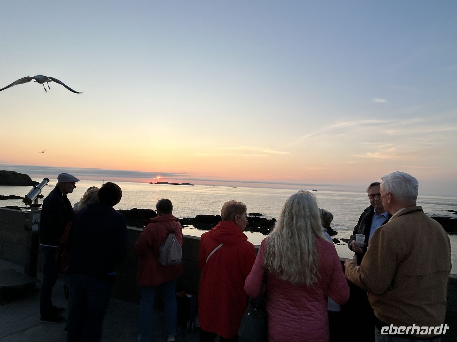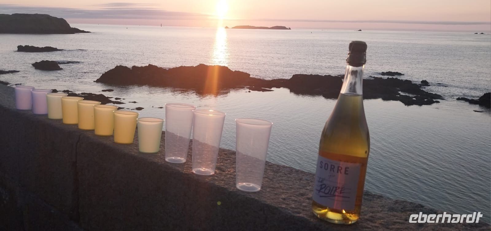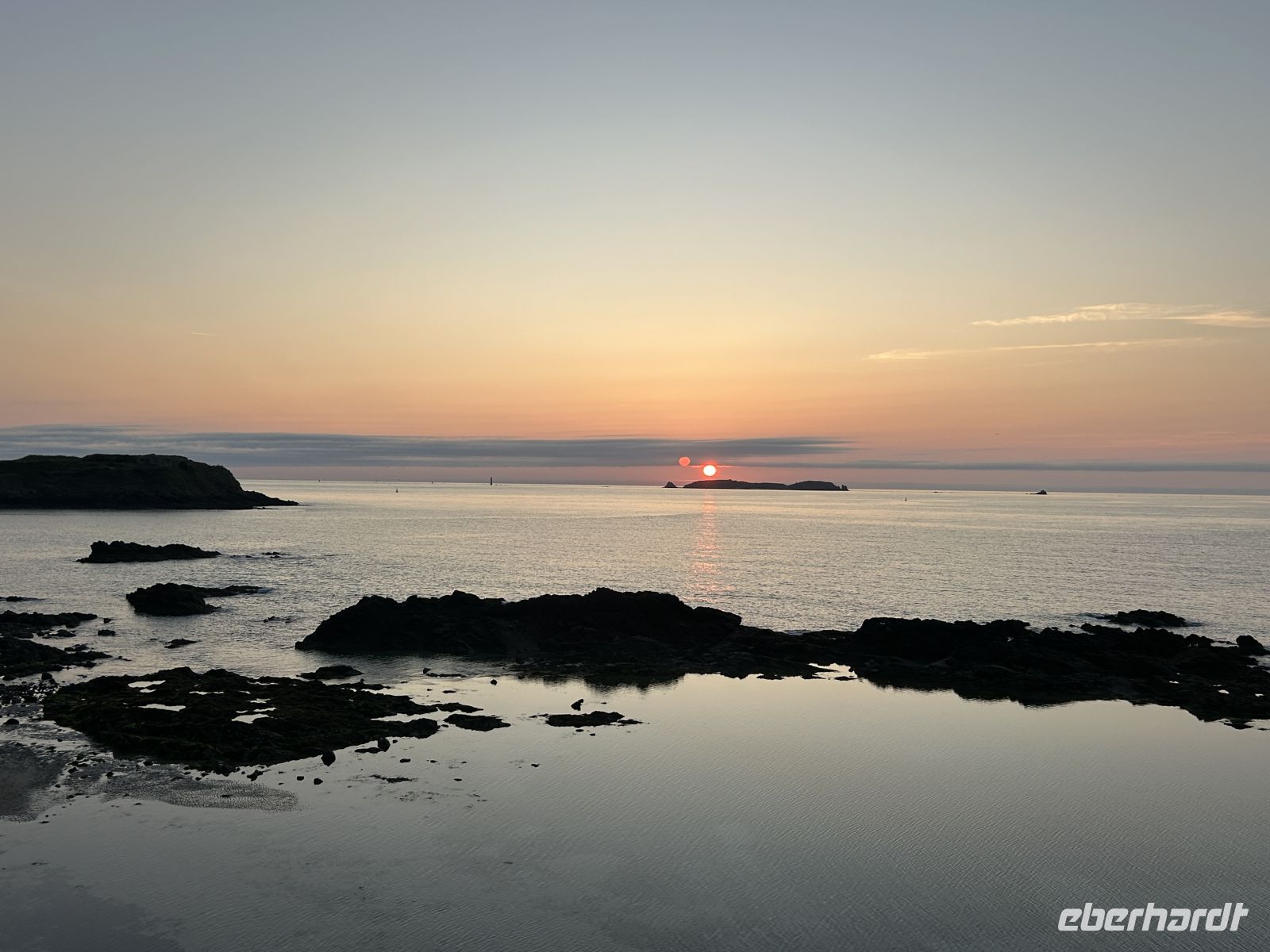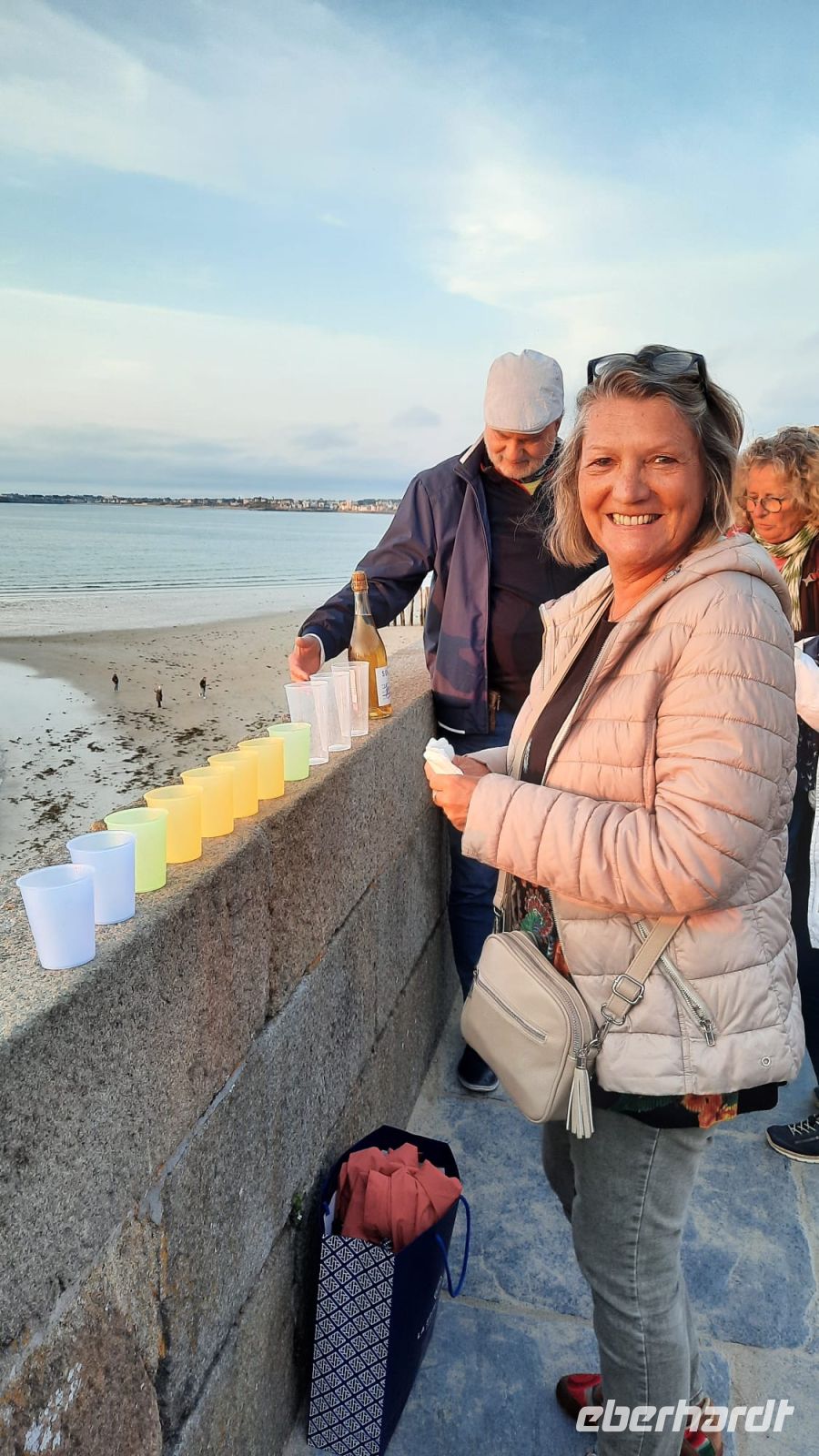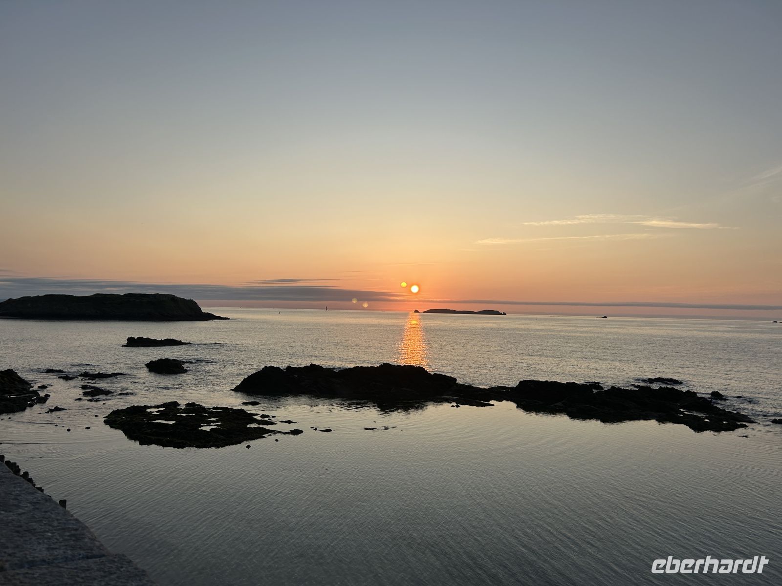Nach dem Abendessen erwartet uns noch eine kleine Überraschung. Zum Sonnenuntergang erklimmen wir nochmals die nahe gelegene Stadtmauer und bewundern wie die Sonne tiefrot im Meer versinkt - natürlich mit einem typischen Cidre in der Hand, diesmal aus Birnen gemacht. Santé !!