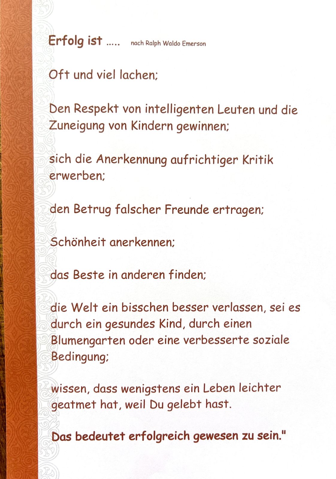 Ich wünsche euch weiterhin eine freudvolle und erlebnisreiche Zeit, mit hoffentlich vielen Reisen und bei bester Gesundheit. Und vergesst nicht viel zu lachen – ihr wisst schon, um erfolgreich gewesen zu sein ??