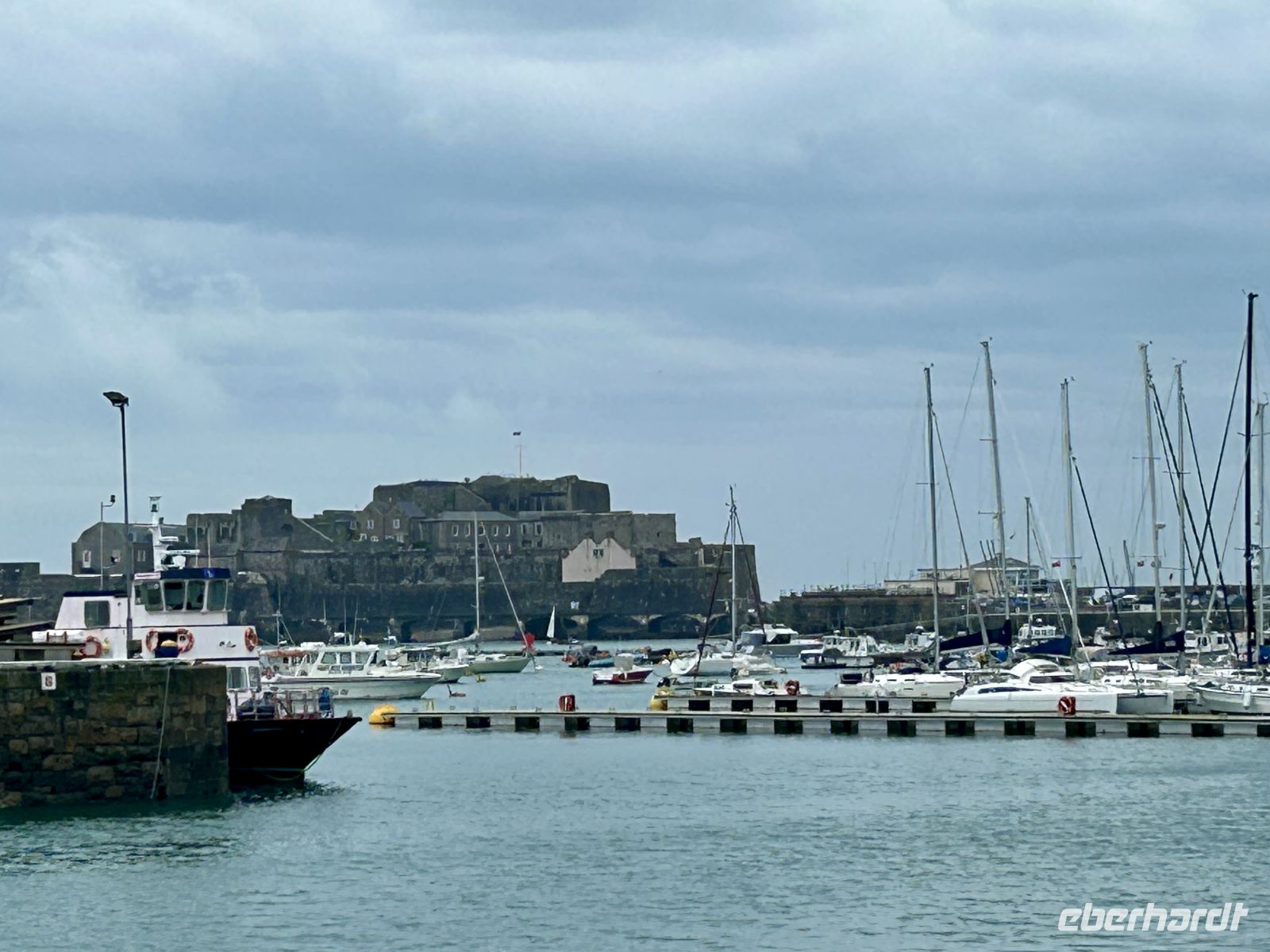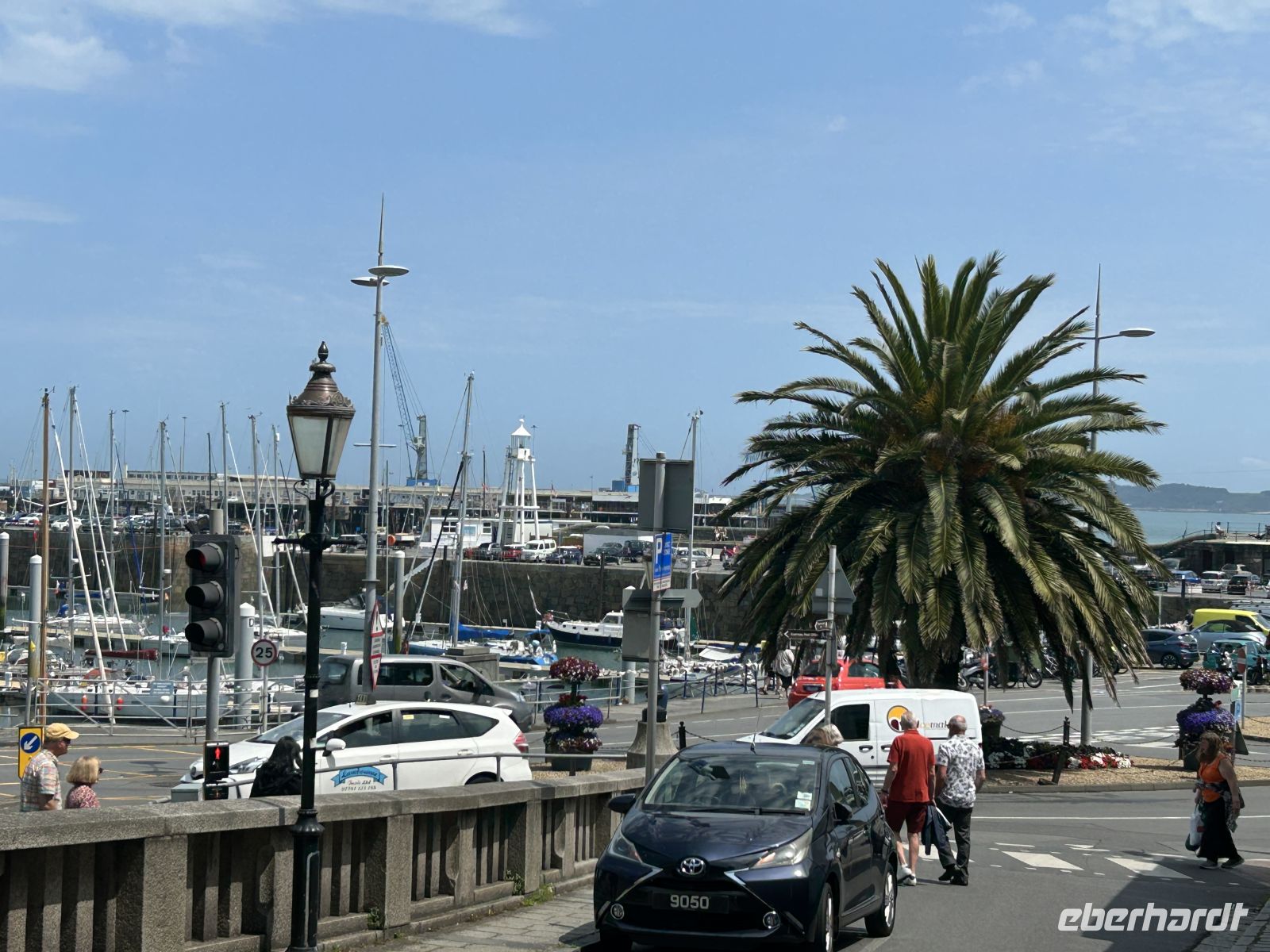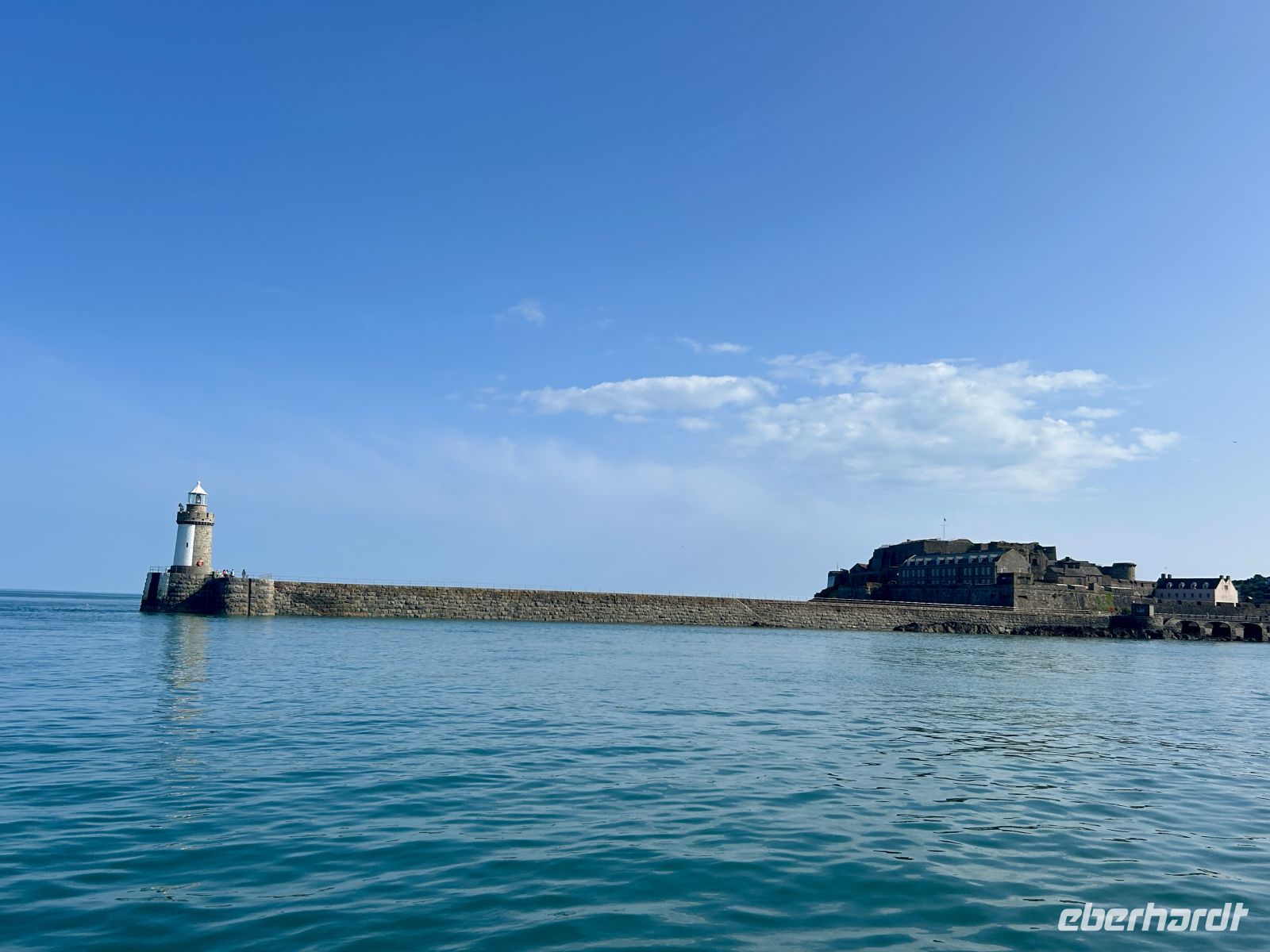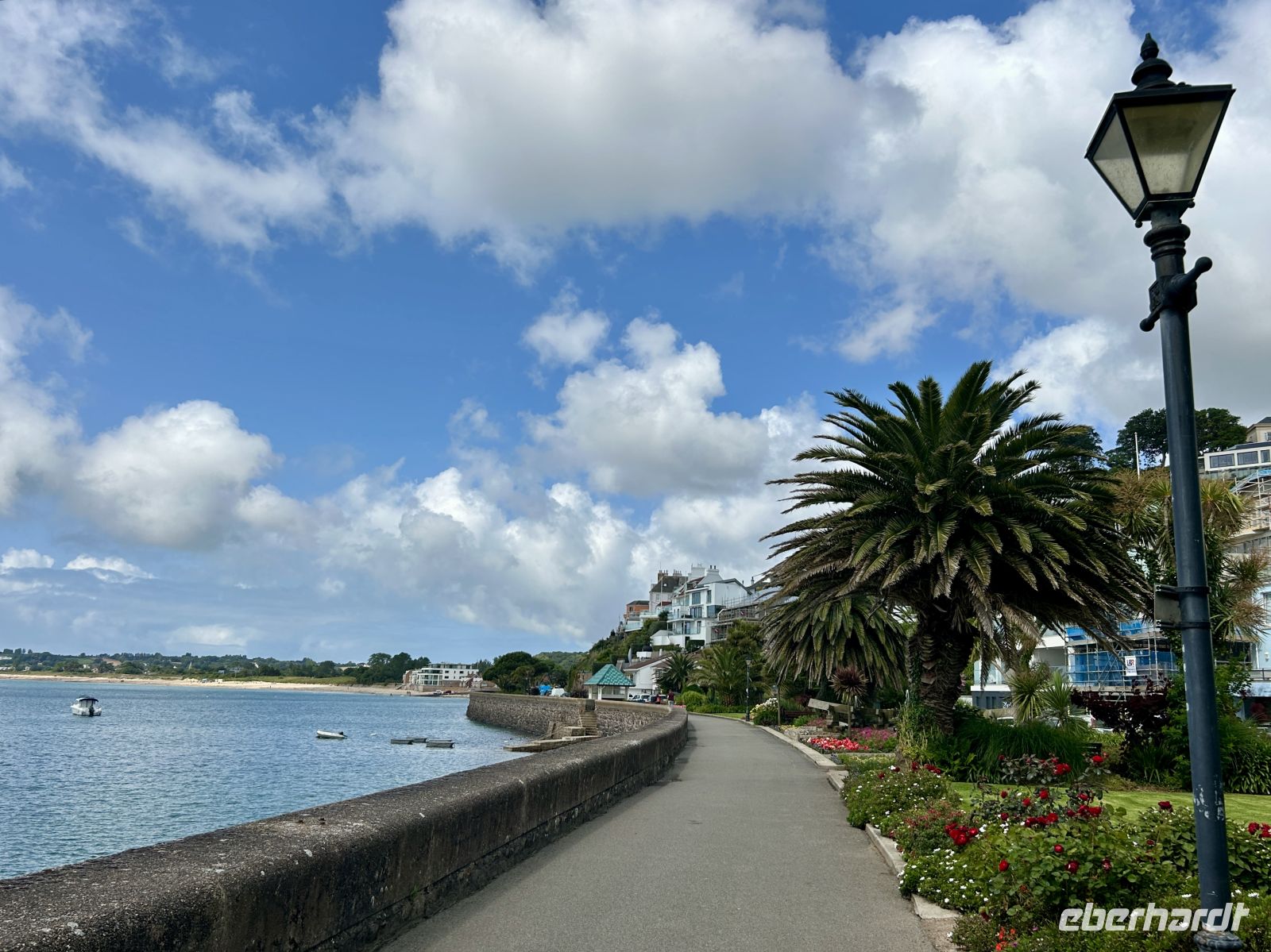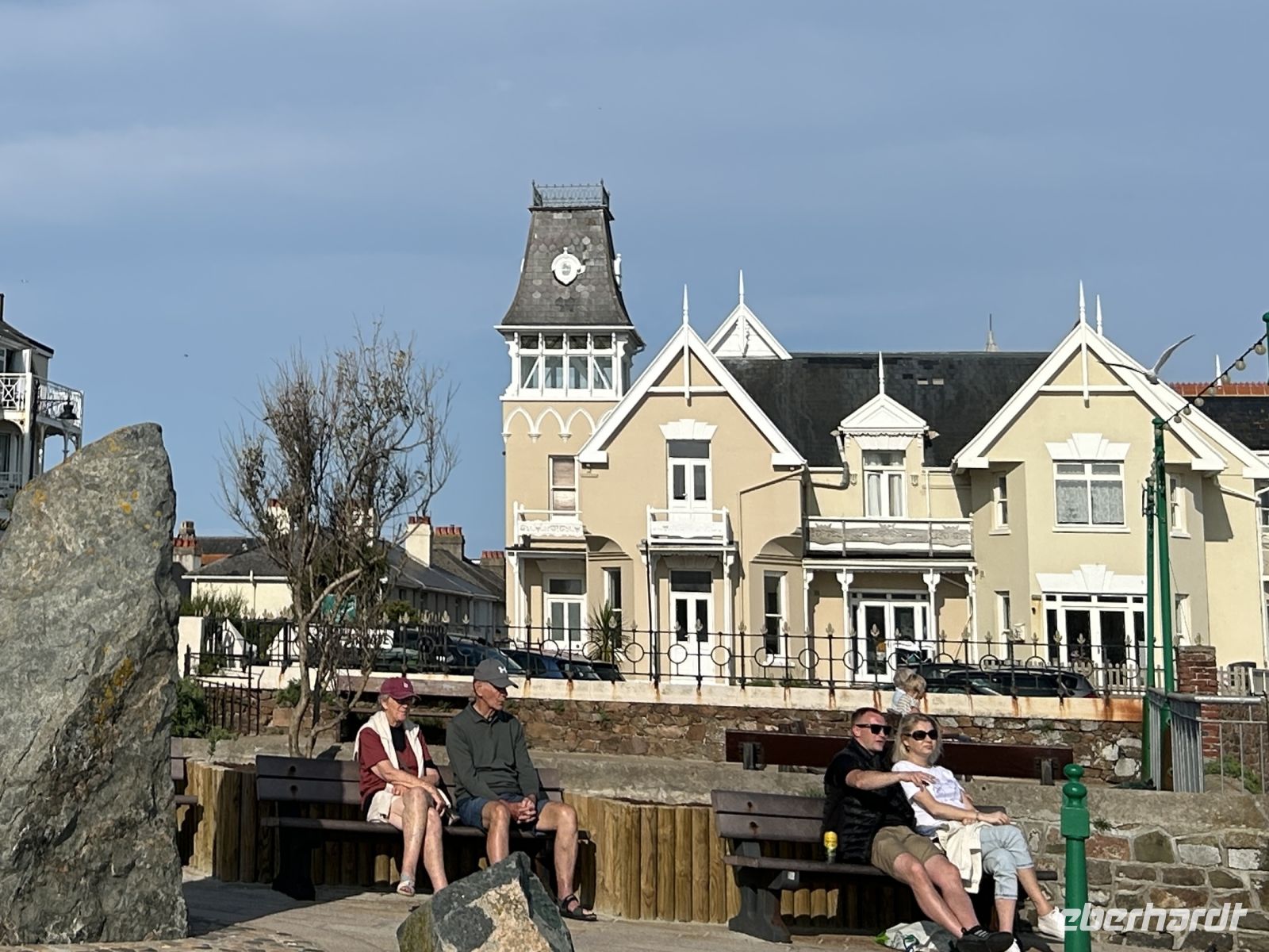 Am Vormittag erkunden wir nochmals St. Peter Port auf eigene Faust, eine kurze Stippvisite hatten wir bereits am Vortag gemeinsam mit Ken. Nun wollen wir noch etwas in den Lädchen stöbern oder schöne Fotos sammeln. Am Nachmittag setzen wir über zur größten der Kanalinseln, Jersey, und staunen über die abwechslungsreiche Küstenlinie. Vom Fährhafen aus blicken wir auf ein imposantes Fort, malerische Hafenhäuser, eine Vielzahl von Segelbooten und hören das Krächzen von Möwen, bevor wir zu unserem Hotel weiterfahren. Den Abend verbringen wir mit ersten Erkundungen entlang der Promenade von St. Helier und genießen den goldenen Abendhimmel