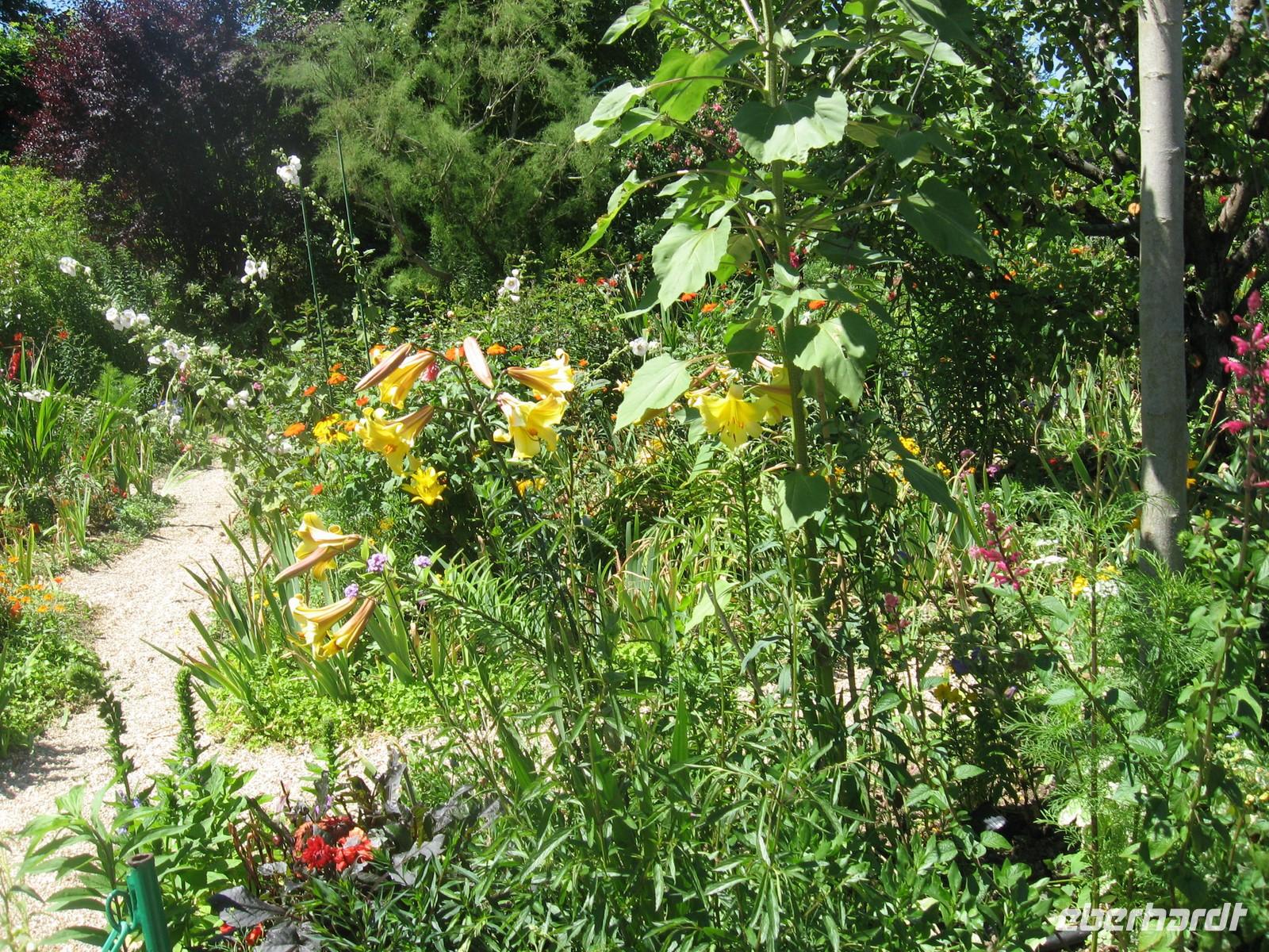 Rankende Pflanzengewölbe, bunte Blumenbeete, Trauerweiden, Dahlien, Glyzinien, Azaleen…