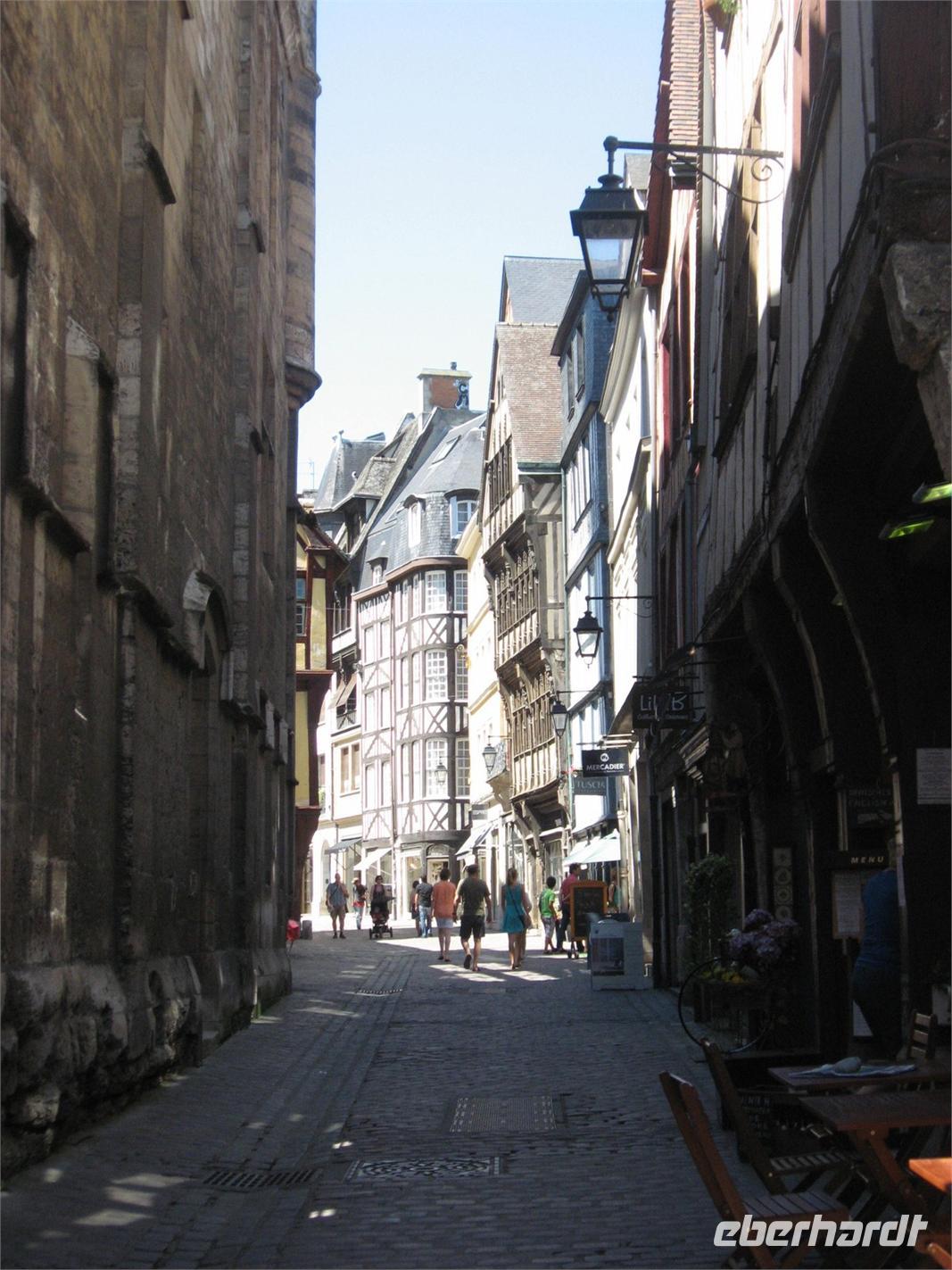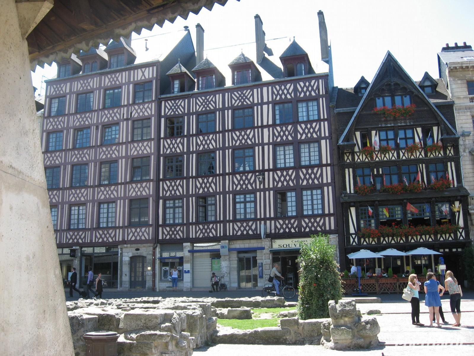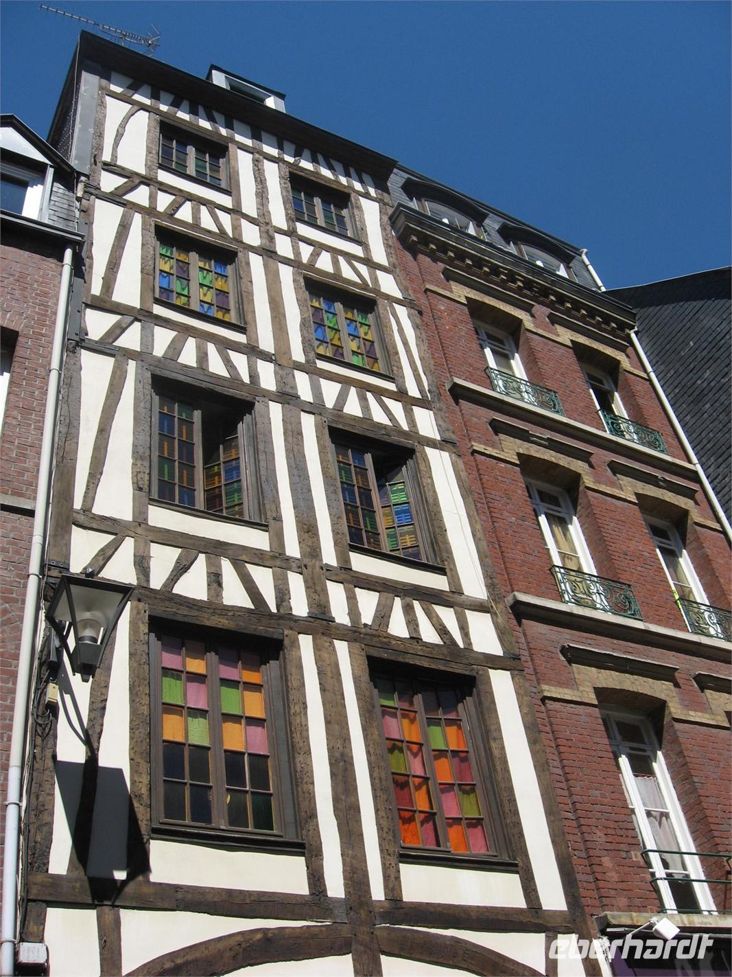 Mittags geht es zurück nach Rouen, der Stadt mit den 100 Kirchtürmen, zunächst zum Mittagessen und dann zur Stadtbesichtigung. Rouen ist die Hauptstadt der oberen Normandie. Die Kathedrale und ihre Rosetten sind nicht zuletzt durch einige Gemälde von Claude Monet berühmt geworden. Unser Stadtrundgang führt uns auch durch die Straßen und Gassen der Stadt, wir sehen viele Fachwerkhäuser, den reich geschmückten Uhrturm () und natürlich den alten Marktplatz, auf dem Johanna von Orléans mit 19 Jahren im Jahre 1431 auf dem Scheiterhaufen verbrannt worden ist.