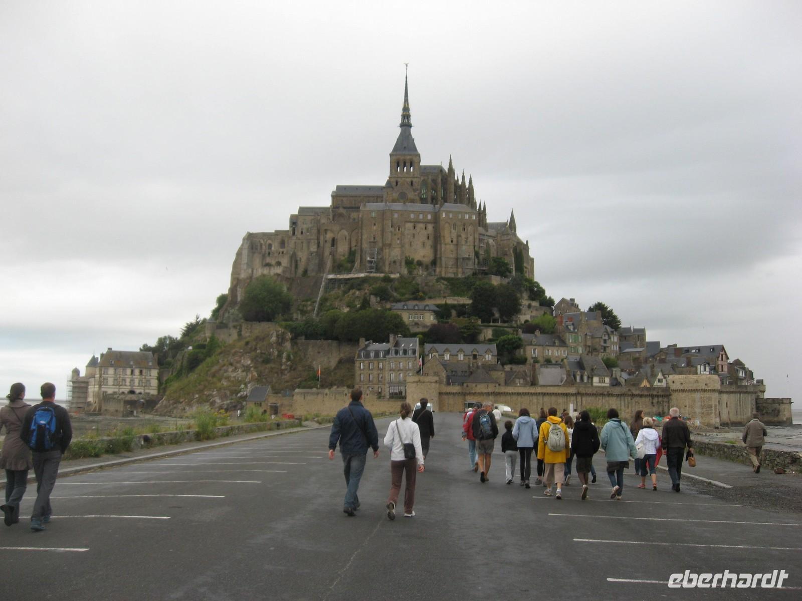 Um 9.00 Uhr morgens sind wir am Mont St. Michel und fahren mit den neuen Shuttlebussen vom Parkplatz aus zum Wunder des Abendlandes. Der Granitfelsen mit 900 m Umfang und die Bucht gehören mit zum UNESCO-Weltkulturerbe. Der Tidenhub, also der Unterschied zwischen dem Scheitelpegel der Flut und dem untersten Pegelstand der Ebbe ist hier besonders hoch.