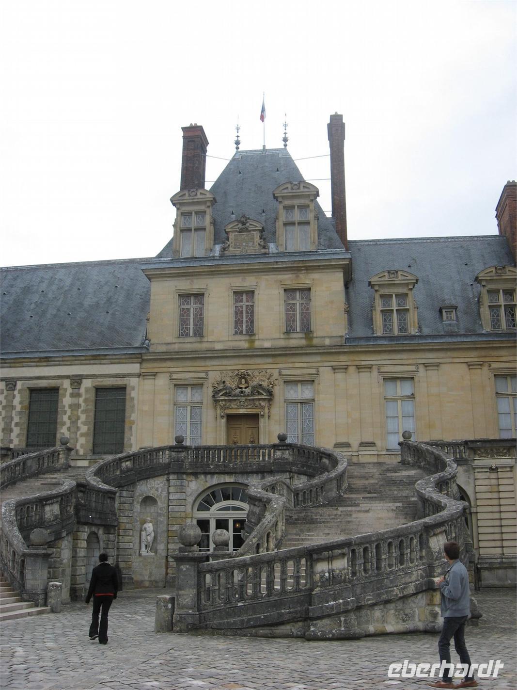 Danach zum Schloß und den schönen Gärten von Fontainebleau, 60 km süd-östllich von Paris. Frankreichs Könige jagten hier seit dem 12. Jahrhundert, Francois I./Franz I. legte im Stil der Renaissance die Basis des heutigen Schlosses; bis hin zu Napoleon wurden immer wieder Veränderungen und Erweiterungen der Gebäude vorge-nommen. Besonders bekannt ist u. a. die große hufeisenförmige Treppe, die vom Hof aus früher in das Schloß führte.