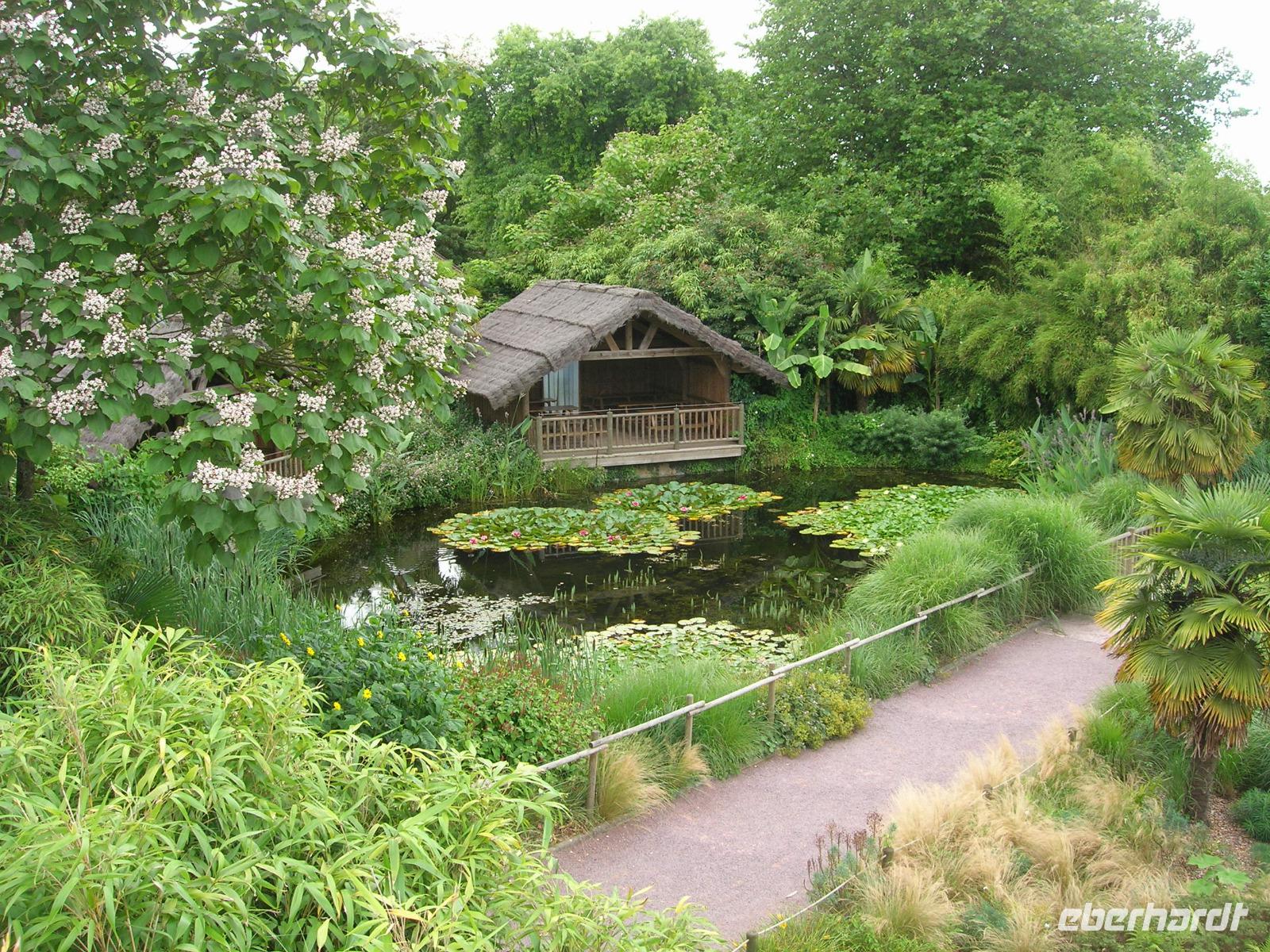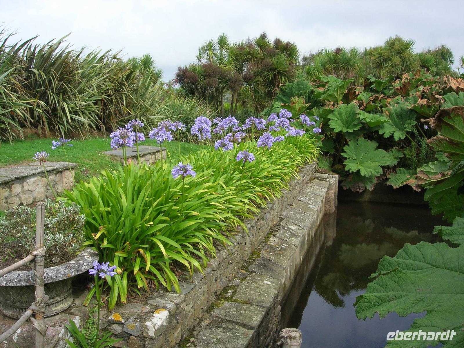 Nach einer Busfahrt, die uns zunächst entlang der Küste der Halbinsel Cotentin und dann durch malerische Dörfer mit Häusern aus Granitgesteinen und liebevoll gestaltete Vorgärten führte, überraschte uns der Garten des "Château de Vauville" mit seinem exotischen Fluidum. Fast wie auf den Kanarischen Inseln kann man sich hier fühlen. Dieses von Eric und Nicole Pellerin ab 1947 angelegte exotische Gartenreich verdankt seine Existenz dem milden Klima des nahen Golfstroms und der Wasserreichtum der Region. Palmen, Aloe, Eukalyptus-Bäume, Bambusstauden .... schaffen eine subtropische Atmosphäre in Nordfrankreich 300 m entfernt vom Atlantik.
