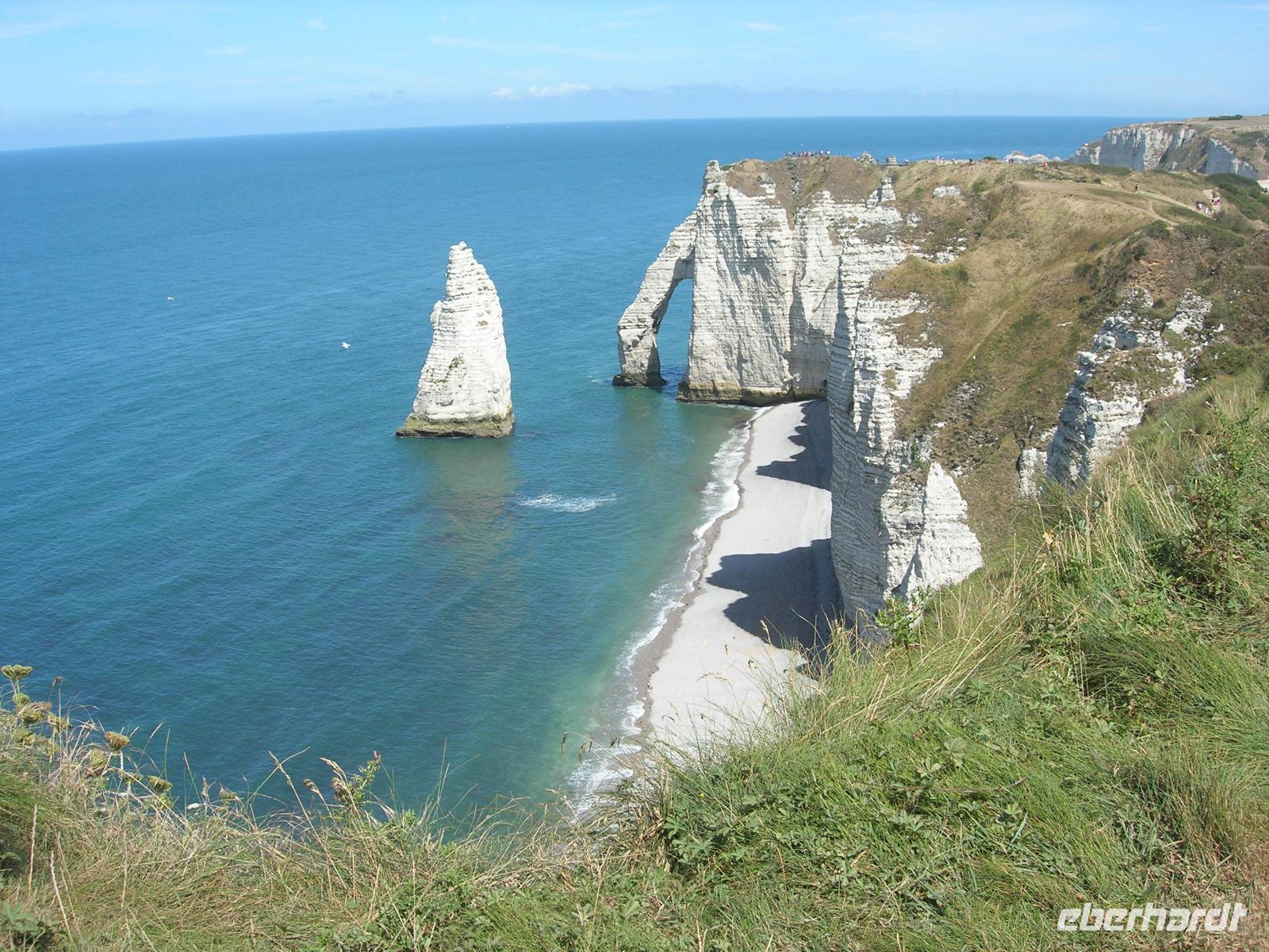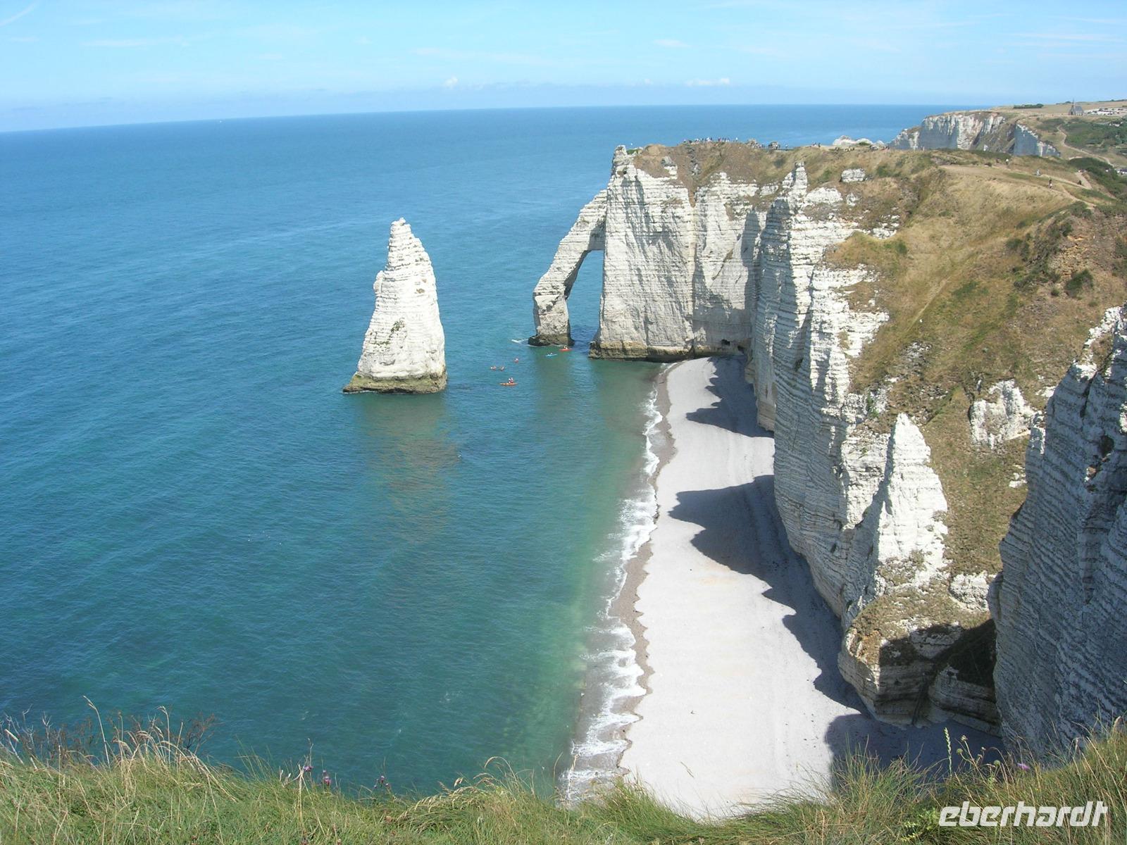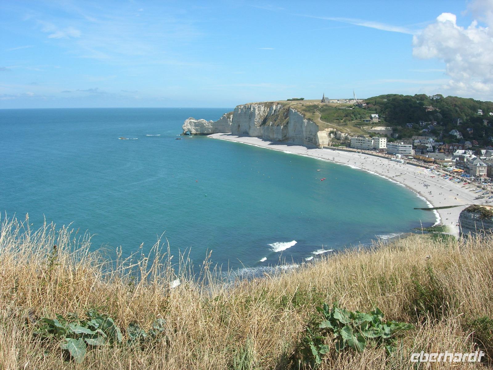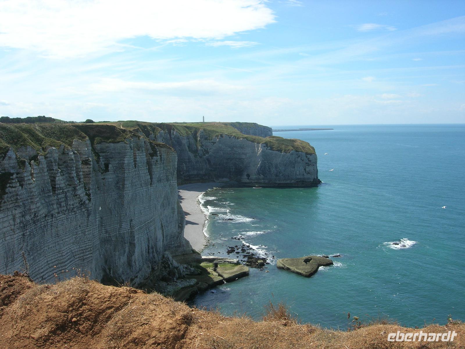 Nun lockte die Küste mit ihren steinigen Stränden und den beeindruckenden Felsen von Étretat. Unter strahlend blauem Himmel verwandelte die Sonne das Wasser in eine smaragdfarben schillernde Materie. Die hellen Felswände der "Falaise d'Aval" links und der "Falaise d'Amont" rechts der malerischen Bucht von Ètretat mit ihren eingelagerten Feuersteinbändern boten ein atemberaubendes Panorama - so unbeschreiblich schön, das es sich kaum fotografieren liess. Ob bei Verweilen auf der Strandpromenade oder bei Wanderungen auf den beiden Steilküsten - der Genuss dieser faszinierenden Küstenlandschaft war vollkommen.