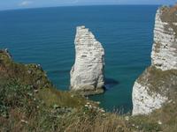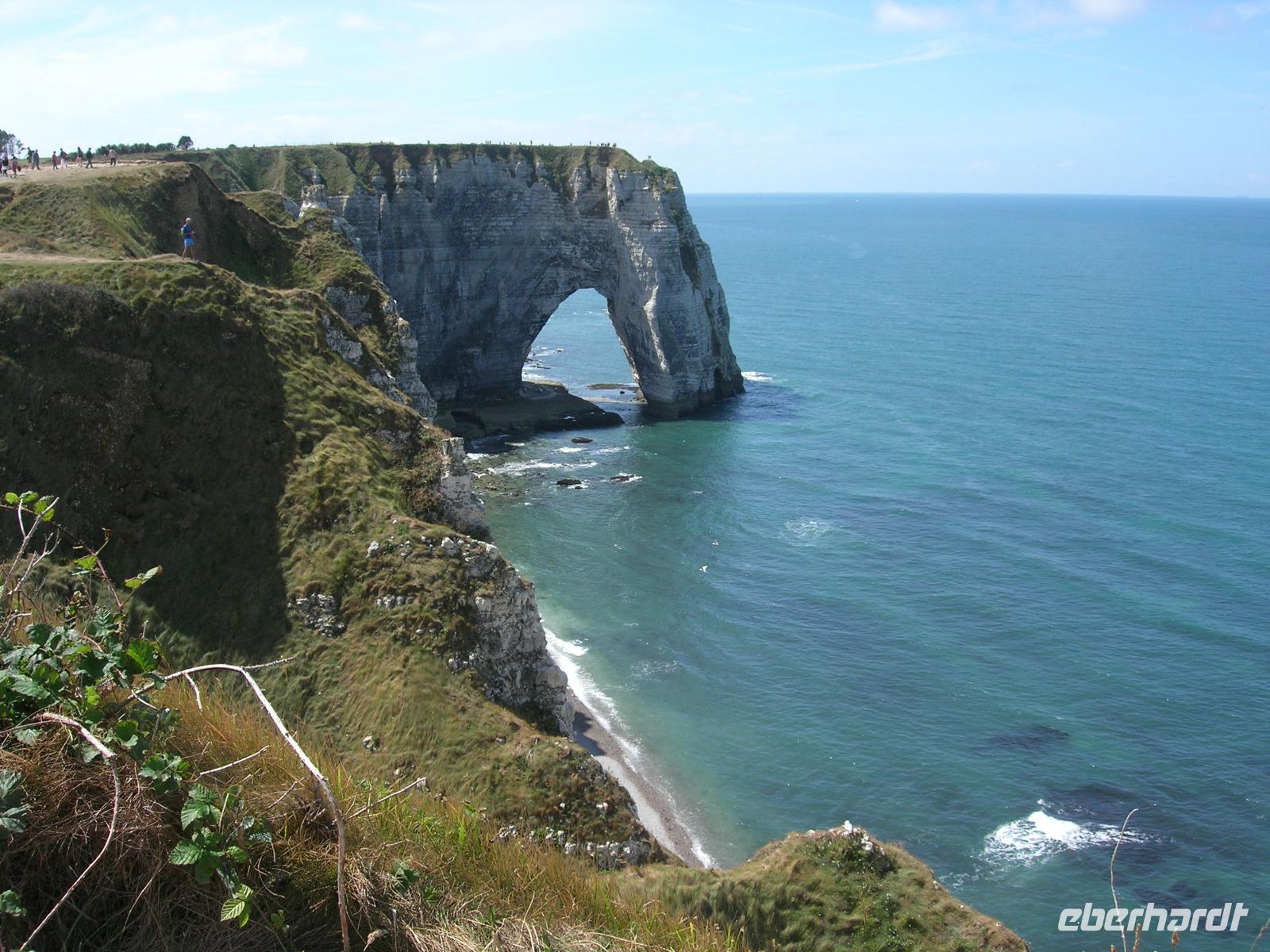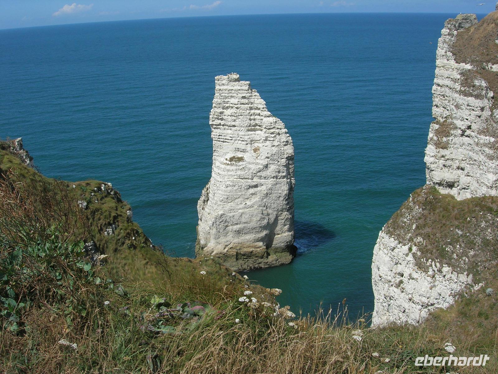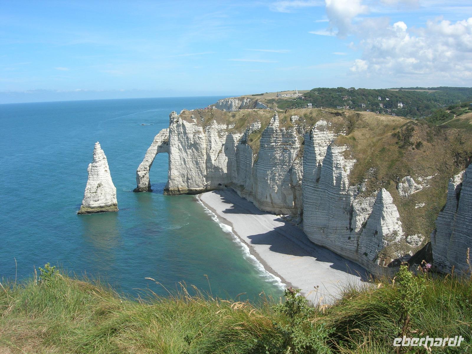 Nun lockte die Küste mit ihren steinigen Stränden und den beeindruckenden Felsen von Étretat. Unter strahlend blauem Himmel verwandelte die Sonne das Wasser in eine smaragdfarben schillernde Materie. Die hellen Felswände der "Falaise d'Aval" links und der "Falaise d'Amont" rechts der malerischen Bucht von Ètretat mit ihren eingelagerten Feuersteinbändern boten ein atemberaubendes Panorama - so unbeschreiblich schön, das es sich kaum fotografieren liess. Ob bei Verweilen auf der Strandpromenade oder bei Wanderungen auf den beiden Steilküsten - der Genuss dieser faszinierenden Küstenlandschaft war vollkommen.