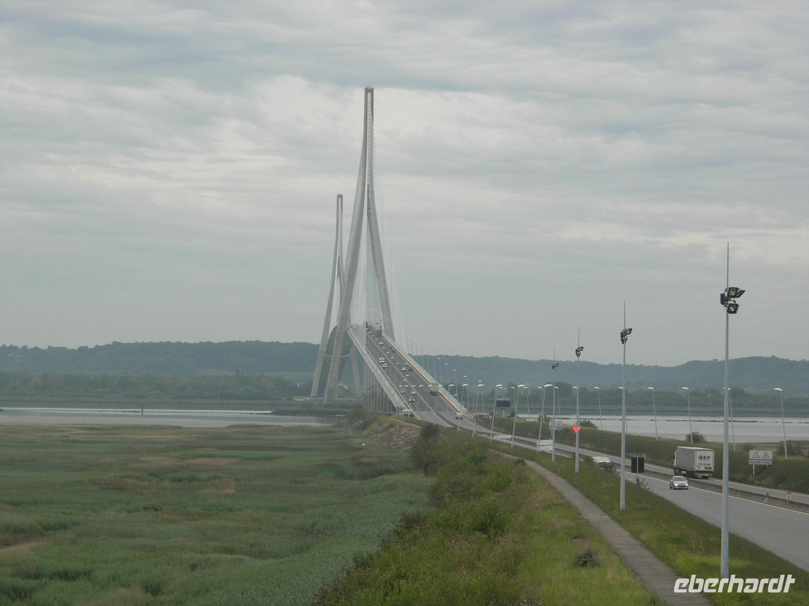 Als erstes erlebten wir heute wenige Minuten nach unserer Abreise die "Pont de Normandie". Zur Zeit ihrer Errichtung 1988-1994 war sie mit einer Länge von 2.241 Metern und einer Hauptspannweite von 854 Metern die größte Schrägseilbrücke Europas. Nach einem Fotostopp fuhren wir über die "Pont de Normandie" und waren beeindruckt von der Leichtigkeit und Eleganz dieser mächtigen Konstruktion.
