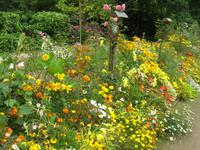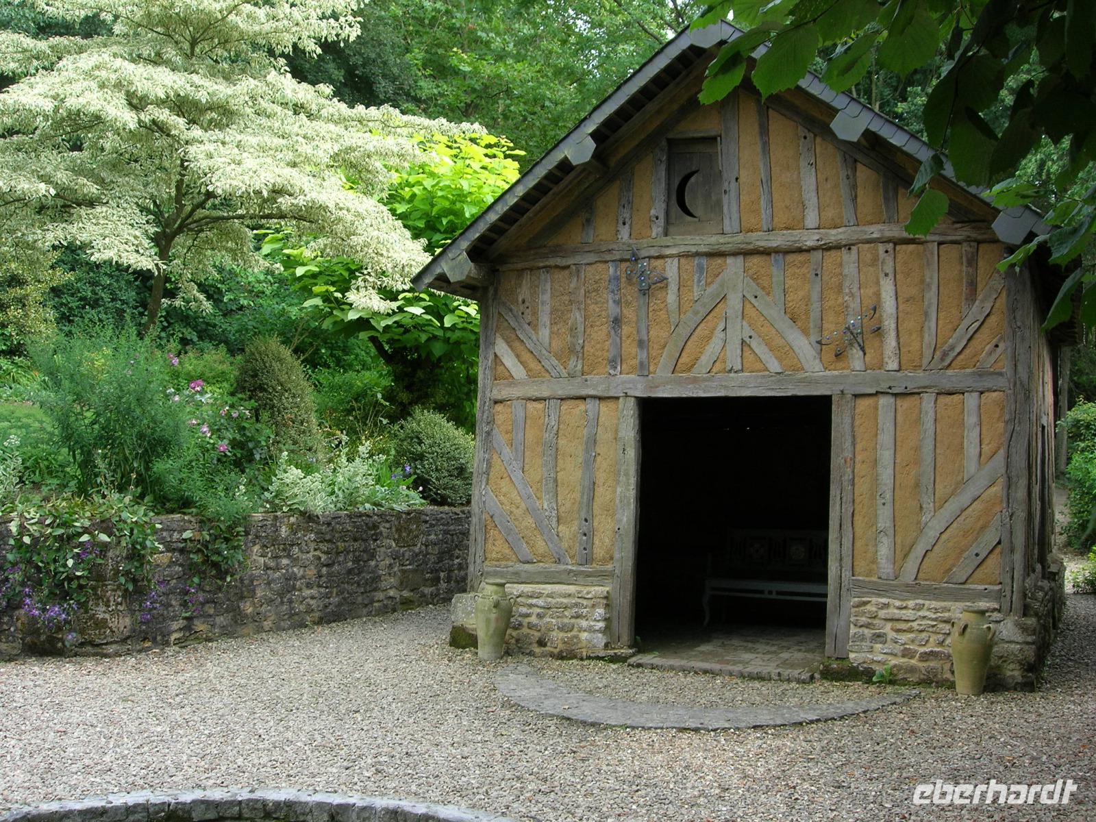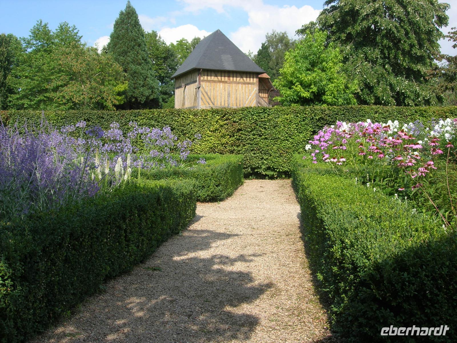 Anschließend fuhren wir ins Pays d'Auge, dem malerische Hinterland der Cote Fleurie (Blumenküste). Im Château de Breuil erwartete uns eine fachkundige Führung, die uns die Destillerie und das Lager der Calvados-Brennerei zeigte. Danach probierten wir den Geschmack des köstlichen Calvados und des Pommeaus. Beschwingt durch diese echt normannische Kostprobe ging es nun in eine besonders schöne Gartenanlage: den "Jardins du Pays d'Auge" in Cambremer. Im Jahr 1994 von Armelle und Jaques Noppe angelegt bietet diese Anlage eine Fülle kreativer Gartenensembles, die zusammen mit alten ländlichen Fachwerkhäusern des Pays d'Auge und ihren Gerätschaften Themenräume voller Poesie bilden. Sie führt die Besucher auf eine be- und vielleicht auch verzaubernde Reise durch die normannische Gartenkunst.