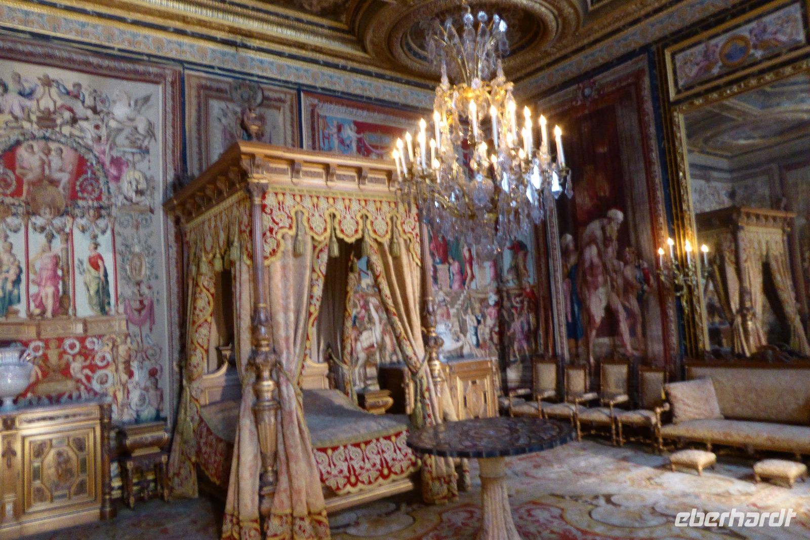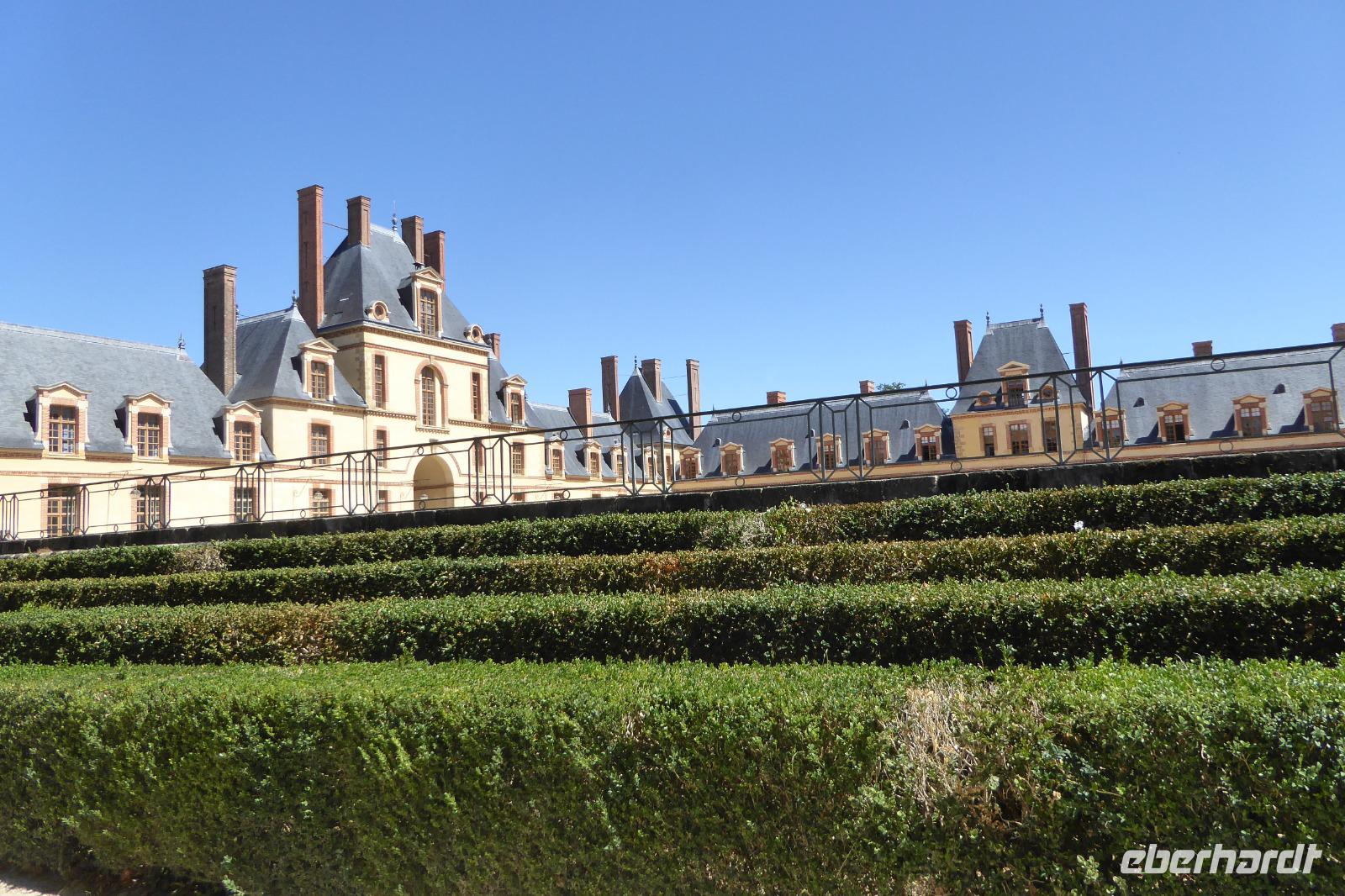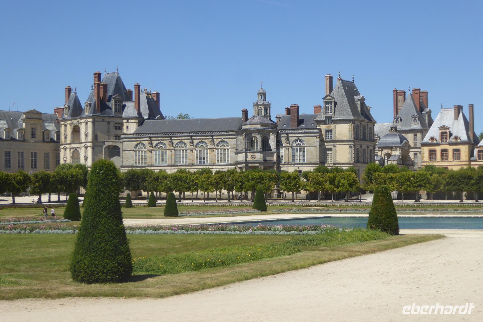 Im Schloss Fontainebleau, 60 km südlich von Paris, wurde europäische Geschichte geschrieben. Mit der Abdankung Napoleons 1814 kehrten die Boubonen wieder zurück. Von 1949 bis 1966 war das Schloss NATO-Hauptquartier des Allied Forces Central Europe. Es ist berühmt für seine Innenausstattung aus der Zeit der Renaissance, an der zahlreiche italienische Künstler arbeiteten. Es wurde 1981 von der UNESCO zum Weltkulturerbe erklärt. Die Anlage wurde an der Stelle einer Burganlage aus dem 13. Jahrhundert gebaut, dessen Donjon in den Bau eingefügt und unter König Francois I zu einem prunkvollen Jagdschloss erweitert. Bauanfang des heute sichtbaren zentralen Gebäudes war 1528. Das Schloss gilt als erster Renaissancebau auf französischem Boden, wurde jedoch mehrfach umgebaut. Schloss Fontainebleau hat fünf Höfe, eine Kapelle, Prunkräume, Fresken und Stuckaturen. Ludwig XIV. ließ in den Gärten ein neues Parterre im Stil des Barocks, einen großen Kanal und einen neuen weitläufigen Park mit Seen anlegen. Mit dem Schloss Fontainebleau sind die sogenannte Erste und Zweite Schule von Fontainebleau verknüpft, von der wichtige Kunstimpulse der französischen Malerei ausgegegangen sind. Wir spazierten durch die gespenstisch menschenleeren Gemächer und konnten in aller Ruhe die wertvollen Kunstschätze betrachten. Auch der Park war menschenleer, was jedoch auch an den Temperaturen über 30° und der schattenlosen Gestaltung der Anlage des königlichen Gartenarchitekten Le Nôtre lag. Die wenigen schattigen Plätze im hinteren baumbestandenen Gartenhof waren dünn bevölkert von ein paar Touristen und in der Mittagspause Ruhe suchender Arbeiter.